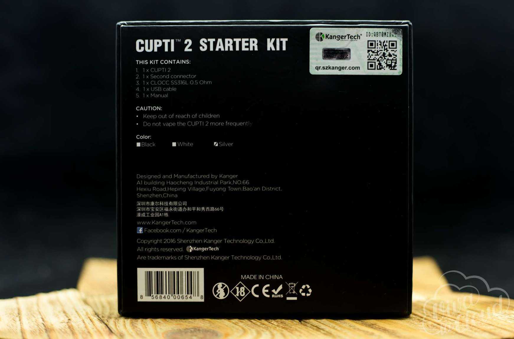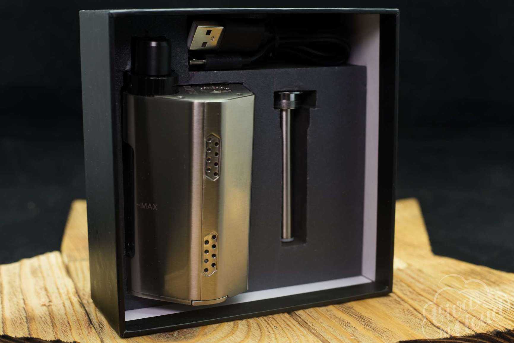 Комплектация девайса более бедная по сравнению с комплектацией предыдущей версии данного устройства, а упаковка — более скучная. На этот раз Cupti поставляется в простой черной коробке, где внутри лежит сам мод с дополнениями. На ее обратной стороне можно найти скретч-код для проверки аутентичности устройства.