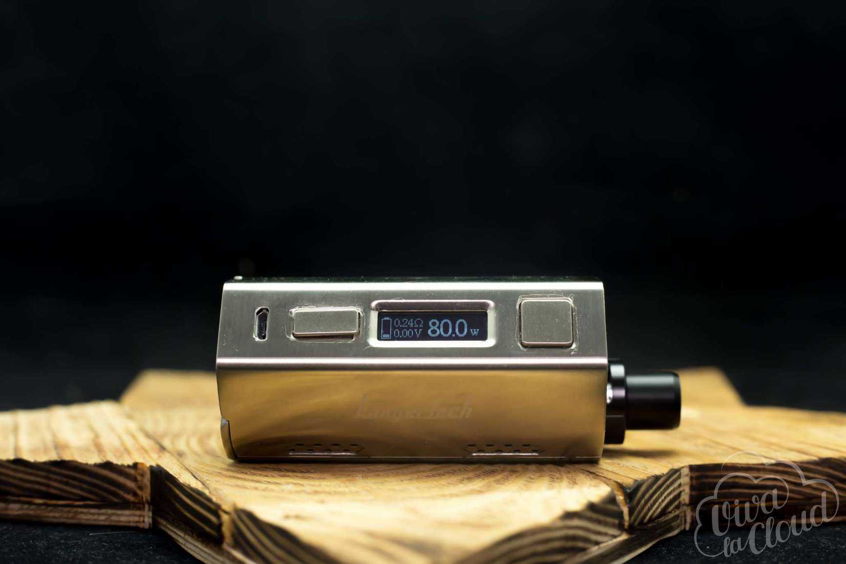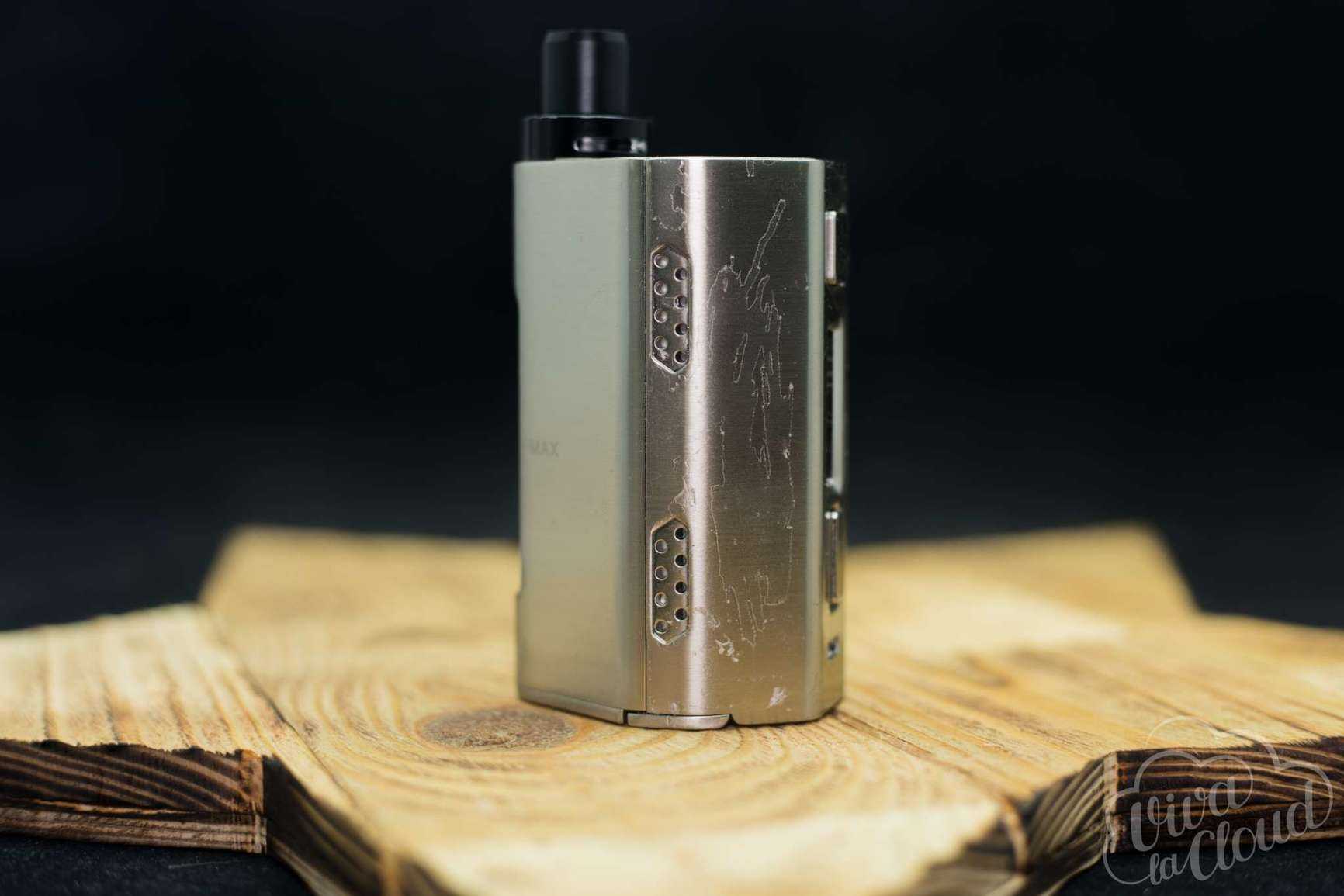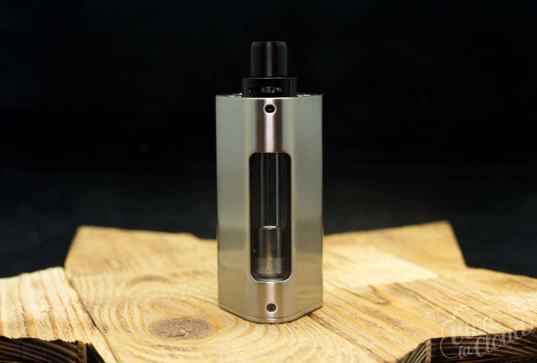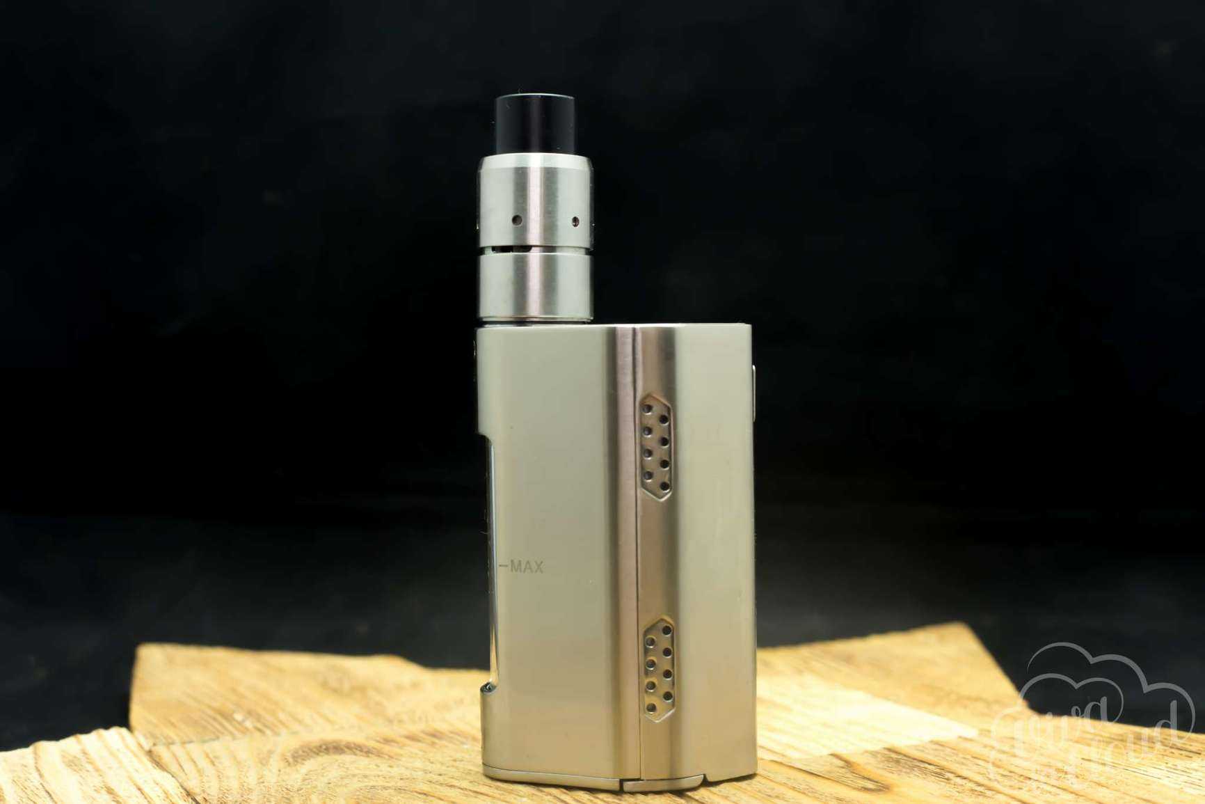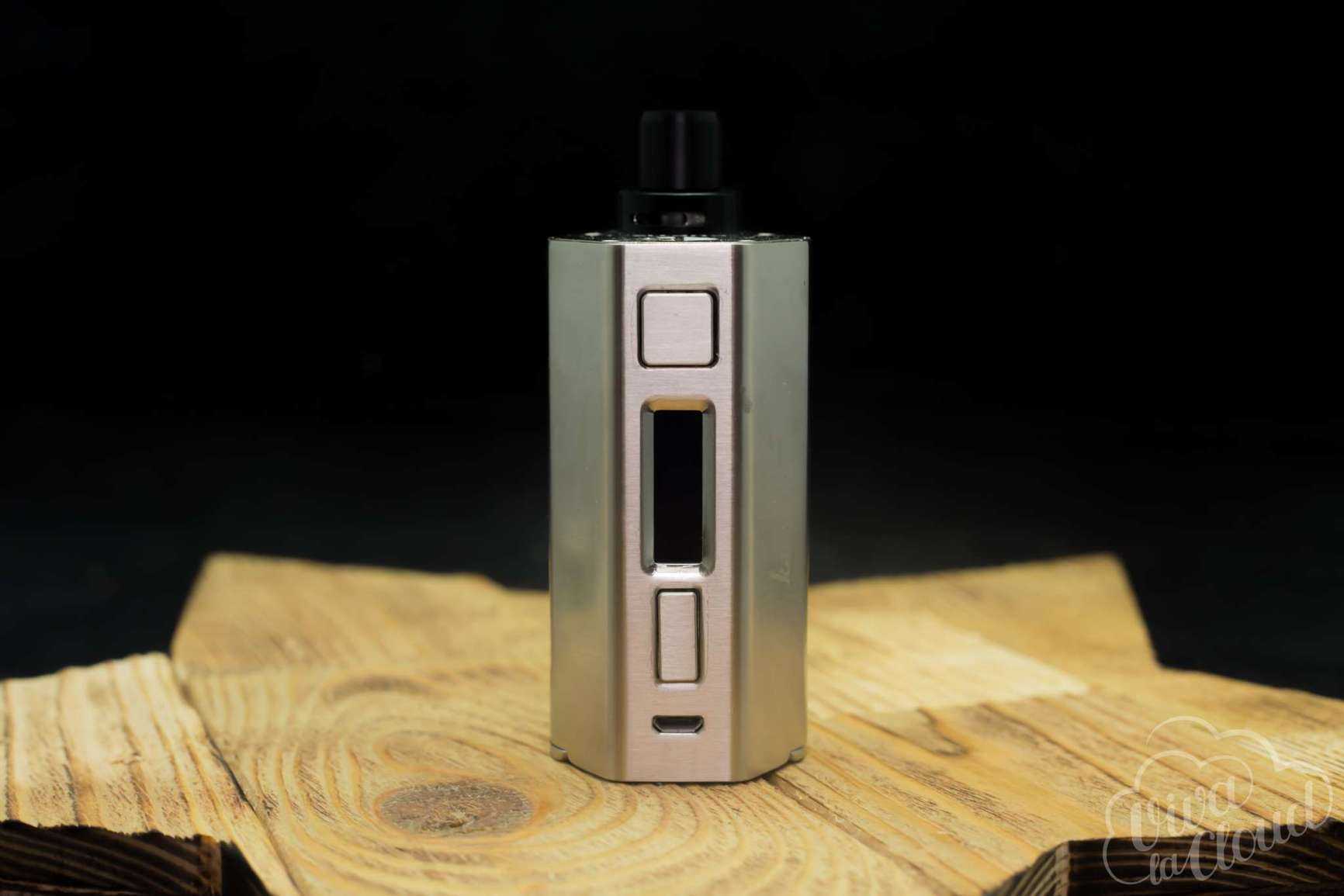 Чуть правее дисплея можно увидеть название фирмы производителя. Название устройства и логотип компании расположились на верхней части девайса. Отверстия для вывода газов находятся на боковых гранях мода.
