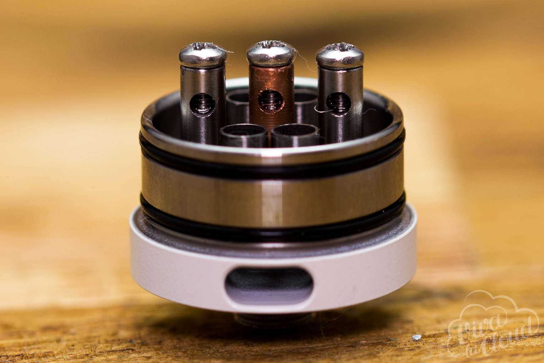 Обдув совершенно не отличается от 22 мм версии Kennedy. Этот тот же овал с шириной 7,5 мм и высотой 3 мм. Его отлично хватает для парения массивных спиралей на высоких ваттах. Но это не особо нужно, так как вкус начинает шикарно раскрываться уже на 70-80 ваттах. Да, комбинация нижнего обдува и сферическая обработка купола действительно делают свое дело.