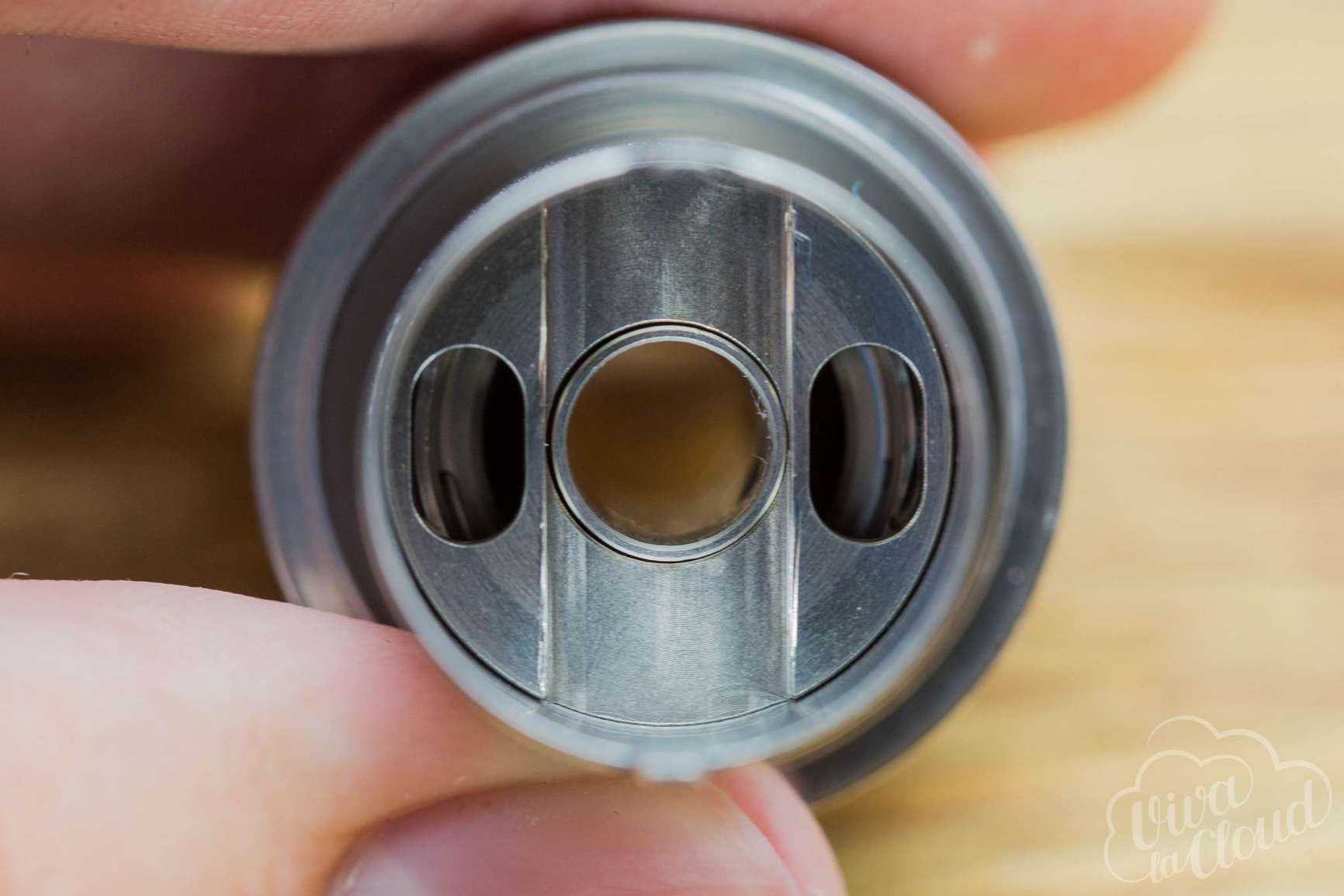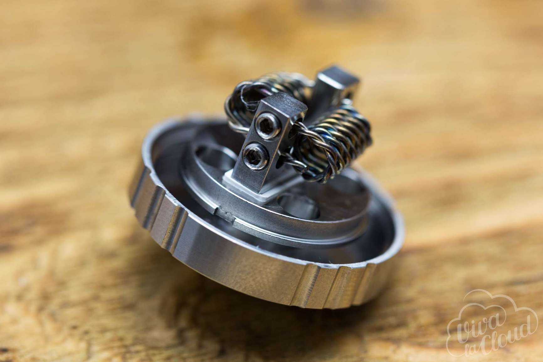 Просторная дека диаметром 17 мм, имеет две Velocity-стойки с просторными отверстиями. Намотку фиксируют болты со внутренним шестигранником. На деке имеются большие (4 мм) отверстия для подачи жидкости. Бортиков для удобства укладки ваты, к сожалению, не предусмотрено, как и возможности установить одну спираль.