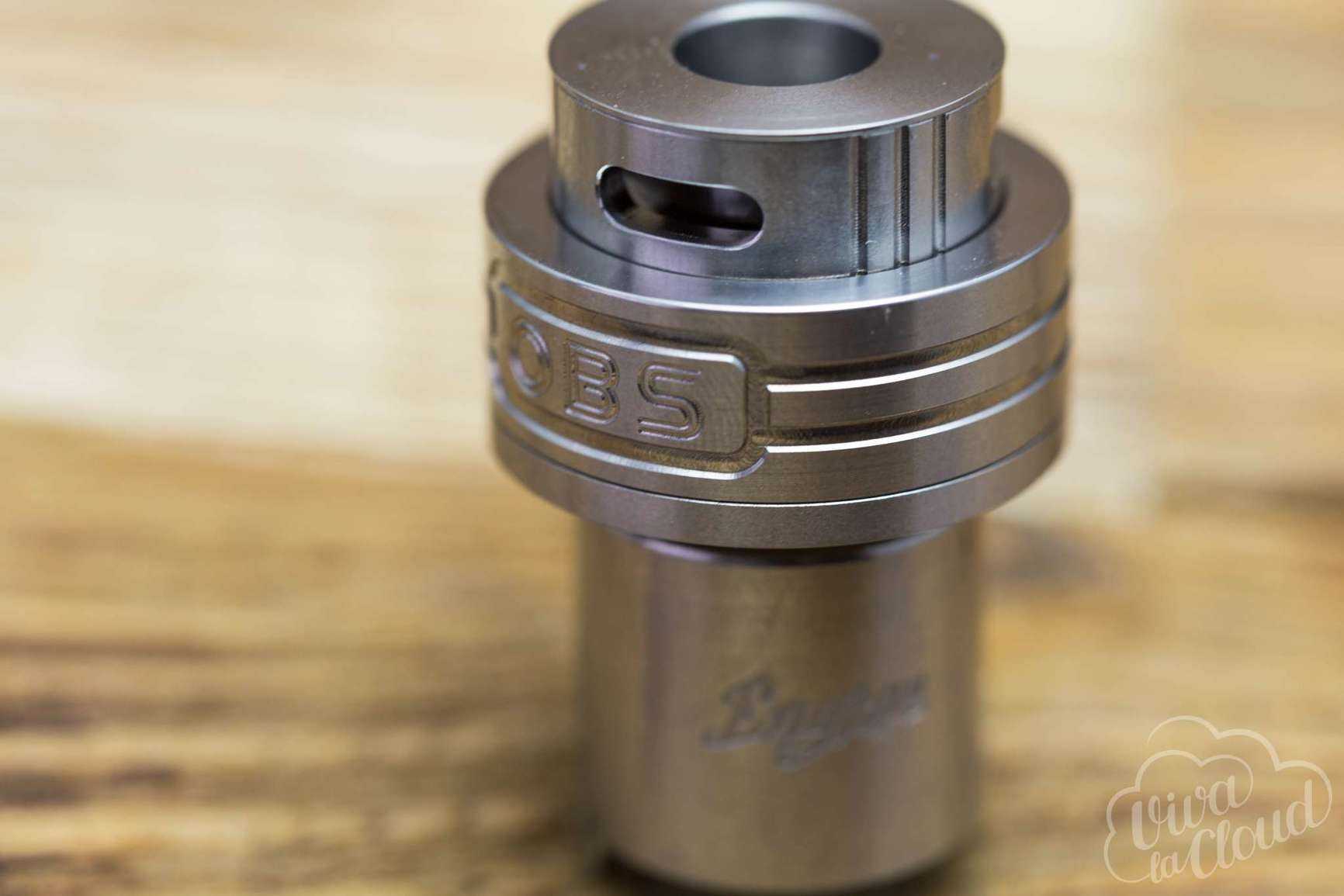 Внешность OBS Engine очень противоречива. На стандартный бак он не похож. Engine — компактный и широкий, по размерам сопоставим с большой дрипкой. Кольцо регулировки верхнего обдува выглядит несколько инородно. На крышке имеется гравировка с логотипом производителя, на куполе испарительной камеры — гравировка с пропеллером и названием бака (у нас обе гравировки были закрыты стойками тела).