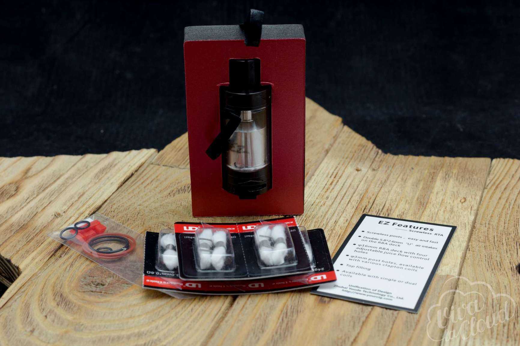 UD EZ продается в среднестатистической картонной коробке, не вызывающей особых эмоций. В комплекте, помимо самого бака, имеется набор запасных резинок, заглушка для установки одной спирали, и, самая главная фишка комплекта — шесть сменных клэптон-койлов с предустановленной ватой.