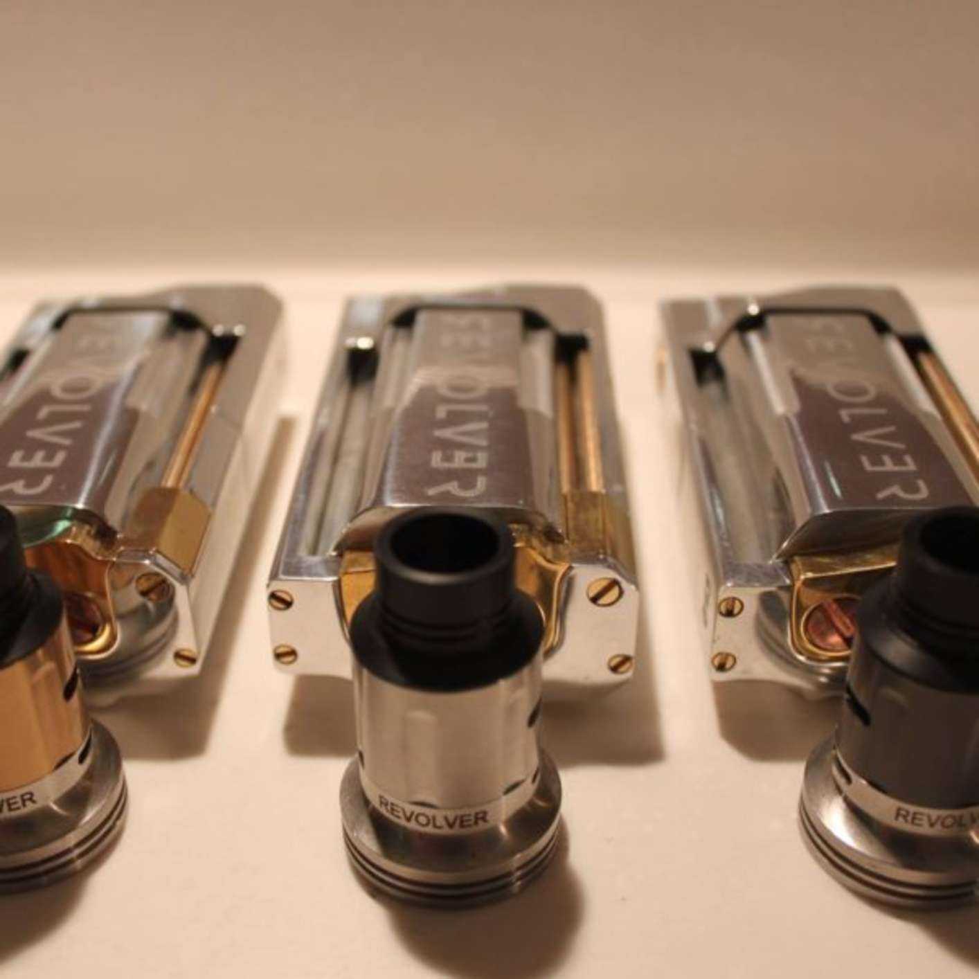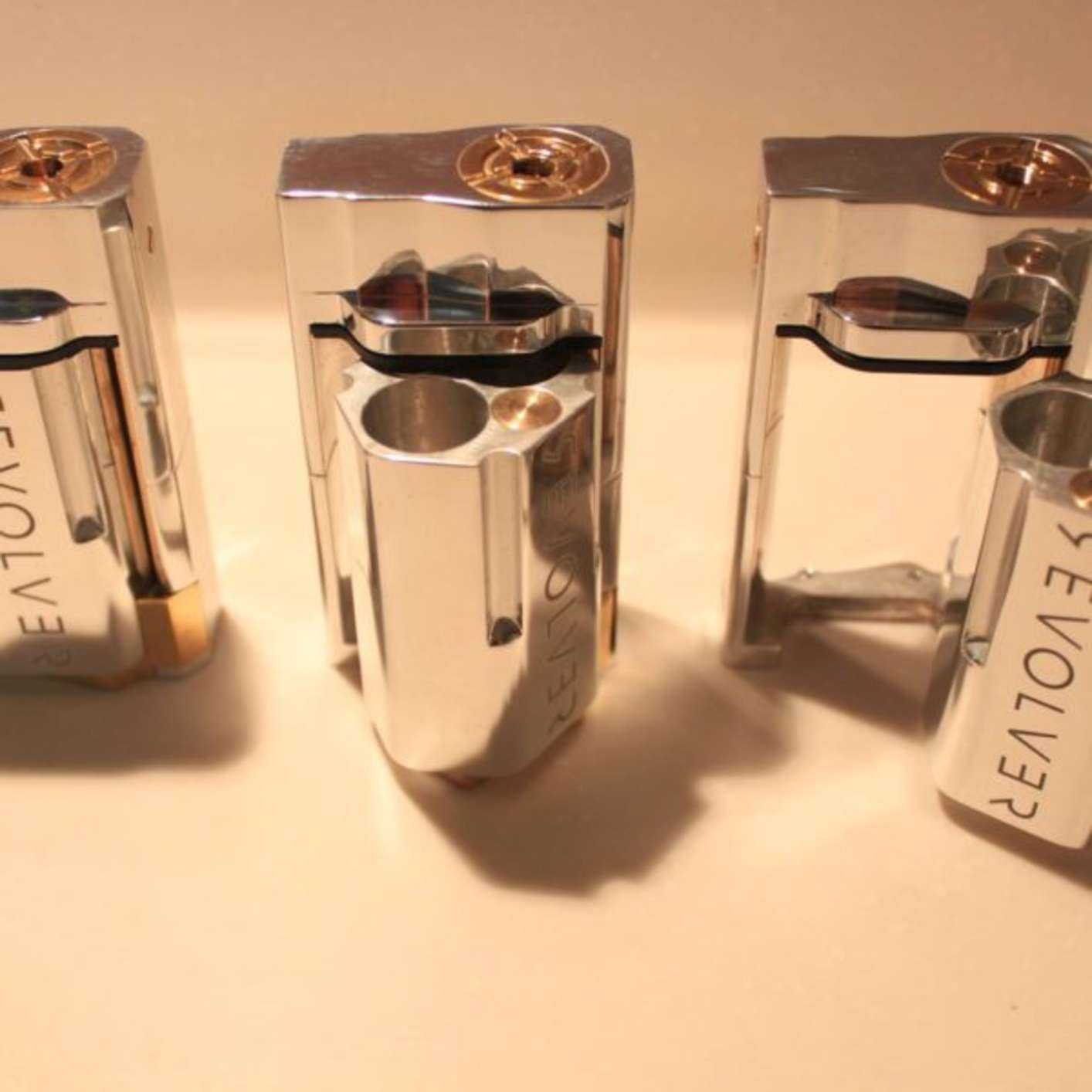 Asmodus Helve, Gripper, AR mod — попытки сделать девайс наподобие оружия мы встречали уже не раз. Revolver — не совсем «револьвер» в привычном понимании этого формата. Это боксмод на 2х18650 c весьма любопытной системой замены АКБ: цельный металлический отсек держится на петле и напоминает магазин для двустволки, в который вы загружаете ваши аккумуляторы. Сделан Revolver mod преимущественно из алюминия с посеребрением на большей части элементов корпуса. Нижние контакты, однако, медные и имеют прорези для устранения «болтанки» аккумуляторов с помощью отвертки.