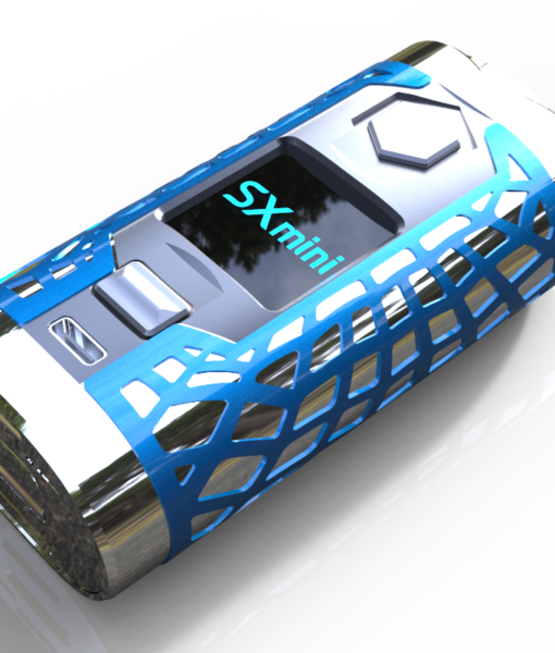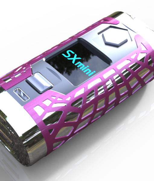 Устройство выглядит монолитно и отделано титановой «паутиной» разных цветов (черная, голубая, розовая и стальная). Если подобное дизайнерское решение Вас не устраивает, то производитель также выпускает свой мод в корпусе «ничего лишнего». Доступны следующие варианты: титановый (бордового, голобуго и черного цветов) и стальной. По фотографиям можно сказать, что SXmini G+ и среднестатистическая ладонь просто созданы друг для друга. Эргономичность девайса обуславливается его форм-фактором: отсутствие прямых углов и обтекаемая форма. Мод оснащен кнопкой-джойстиком.