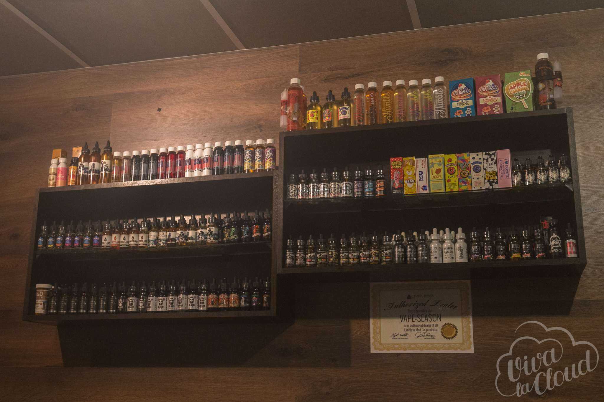При входе сразу же взору предстает большущий стеклянный стеллаж, на котором можно обнаружить подавляющее число товаров из ассортимента Vape Season. Конечно же, без большой деревянной барной стойки и стульев не обошлось.