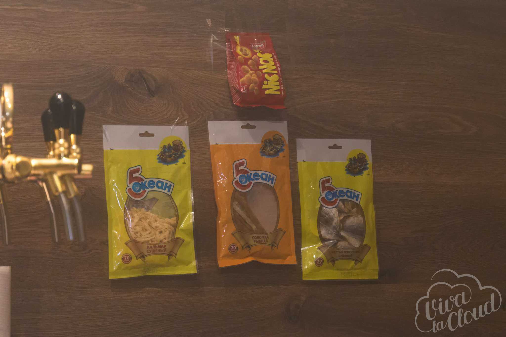 К услугам любителей хмельных напитков стоят четыре крана разливного пива с криком, двумя IPA и одним нефильтрованным светлым. Не поверите, но про закуску тоже не забыли: