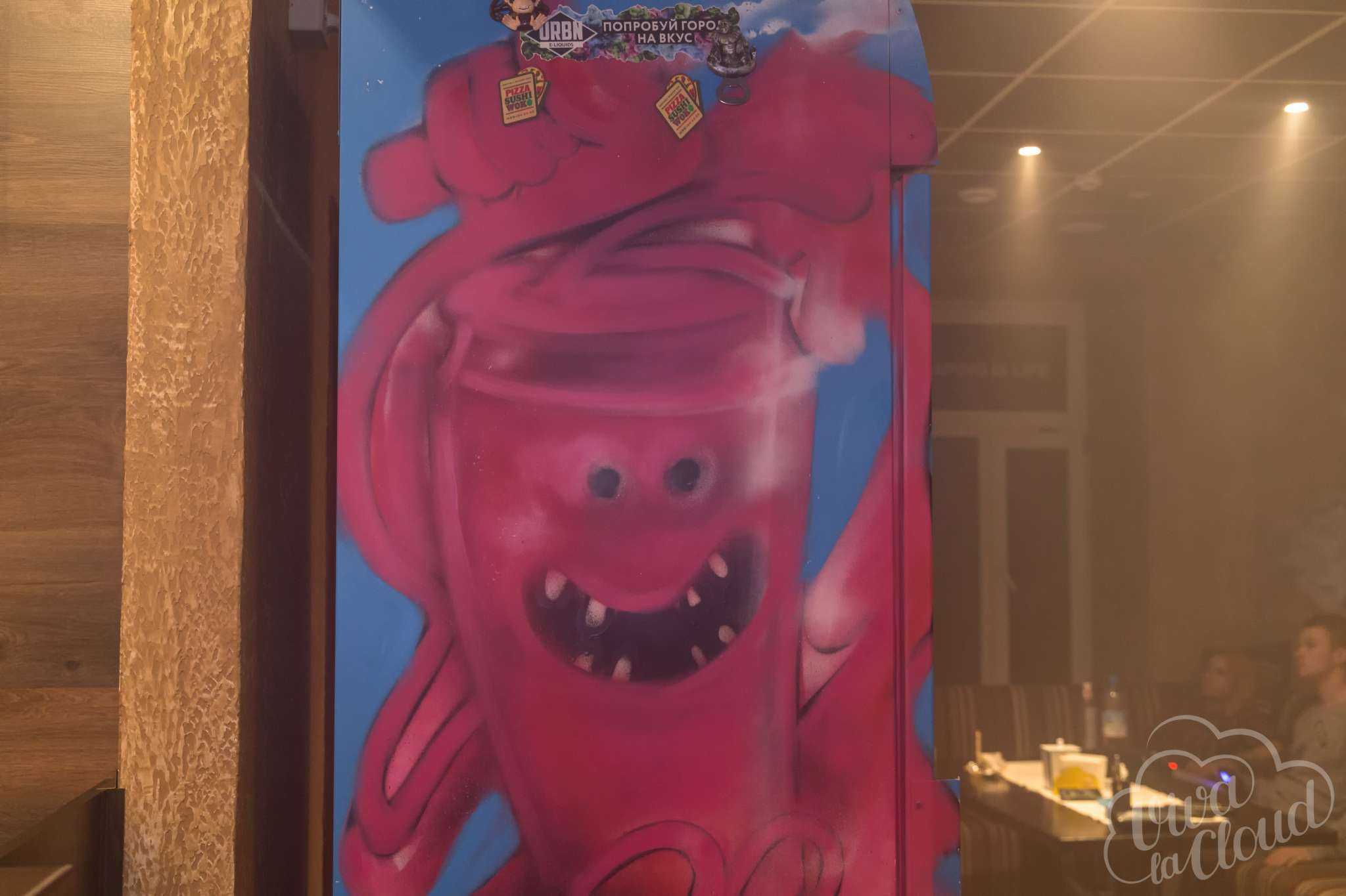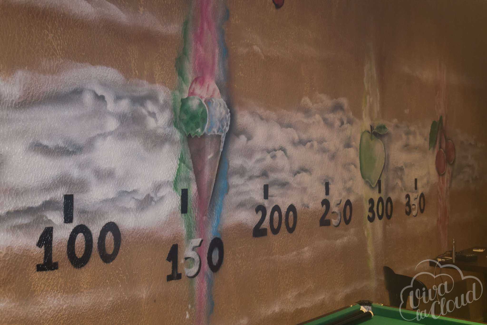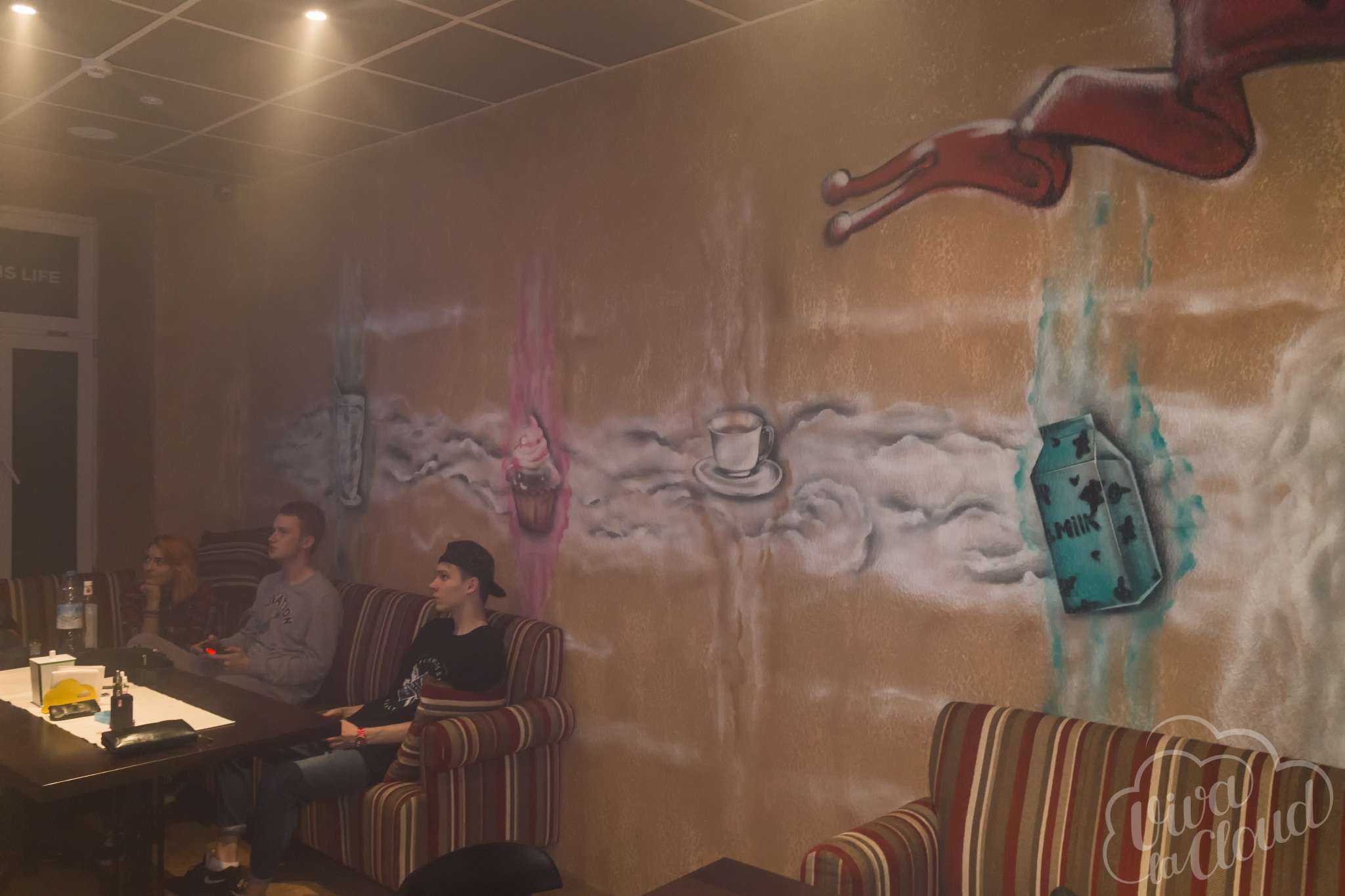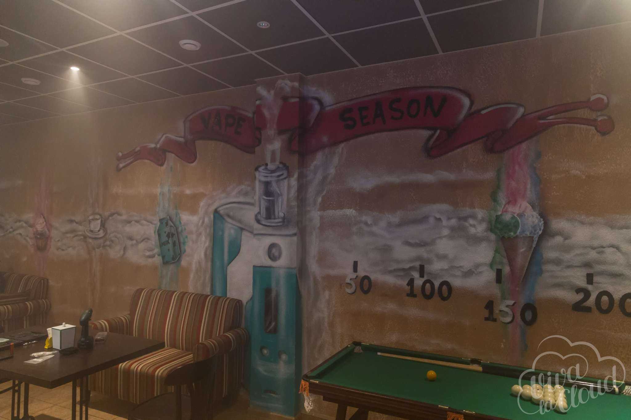 Всю основную стену Vape Season занимает огромное граффити, по совместительству служащее еще и линейкой для соревнований по клаудчейсингу. В центре находится RX200 с небольшим баком (похоже на Goblin Mini), а на каждой круглой отметке нарисованы вкусы, с которыми обычно делают жидкости.