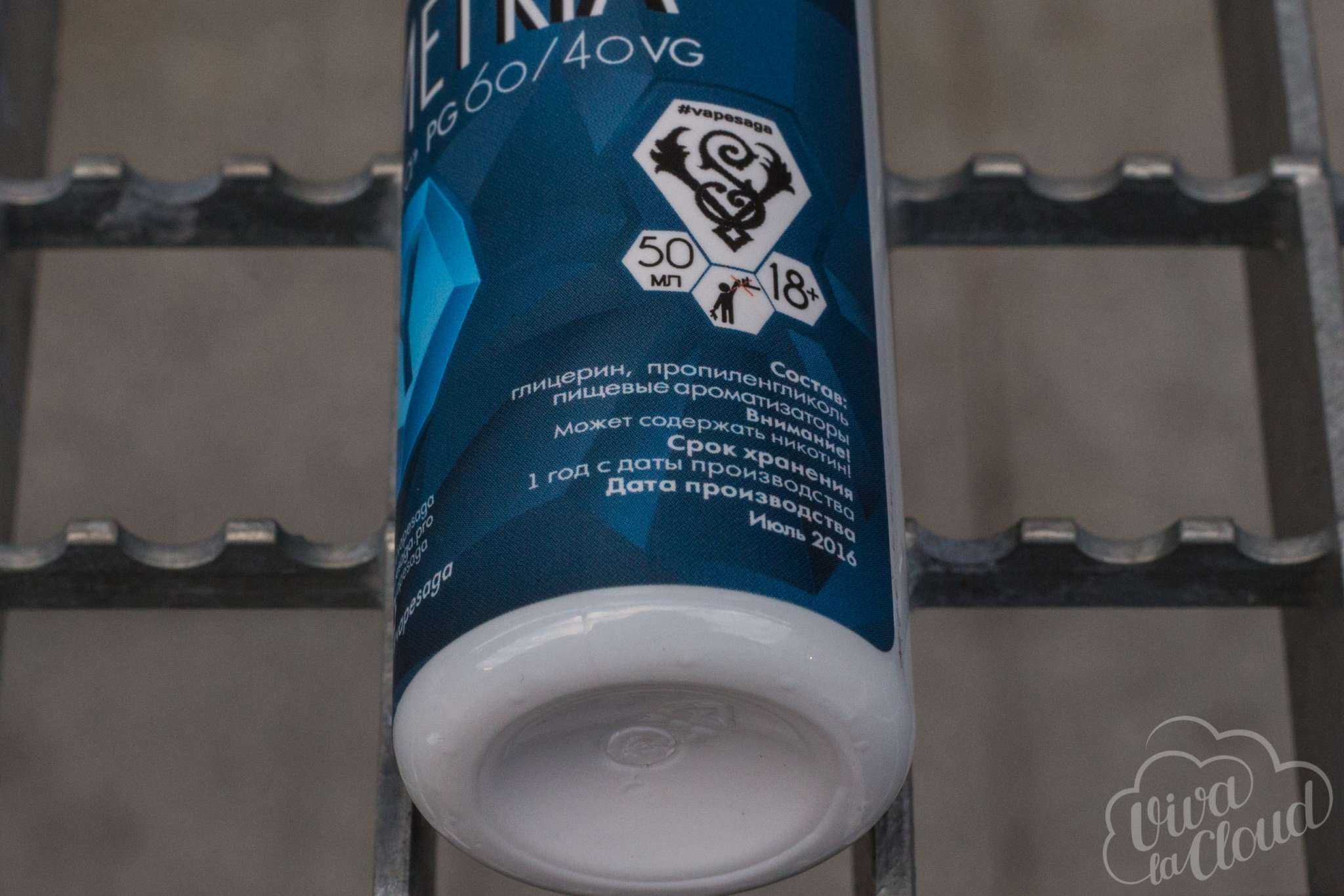 #vapesaga Geometria поставляется в белых пластиковых флаконах объемом 50 мл. Каждый микс отличается от другого названием и цветом этикетки. Забавный элемент дизайна: количество никотина прописано в букве «О» слова «Geometria».