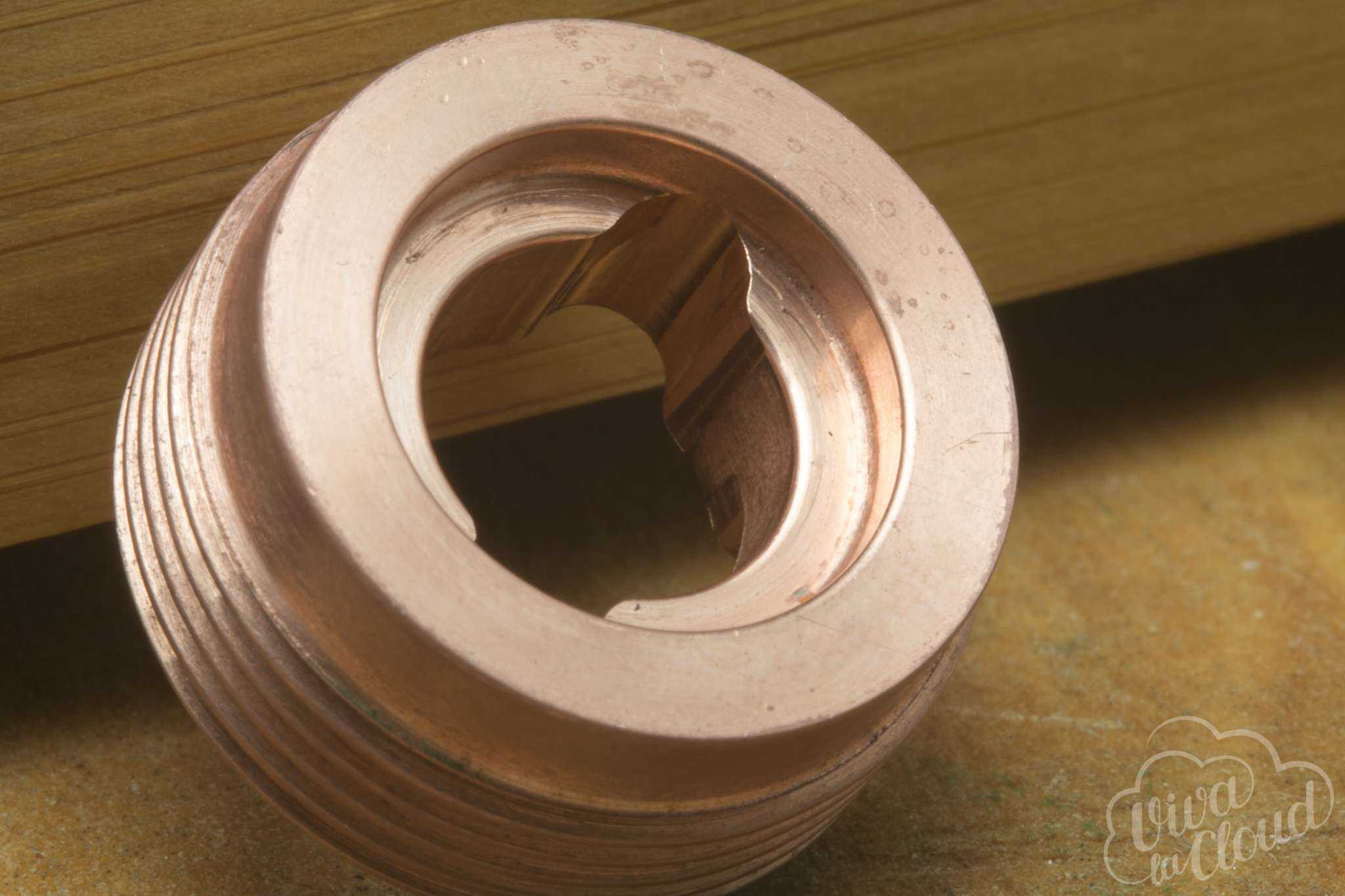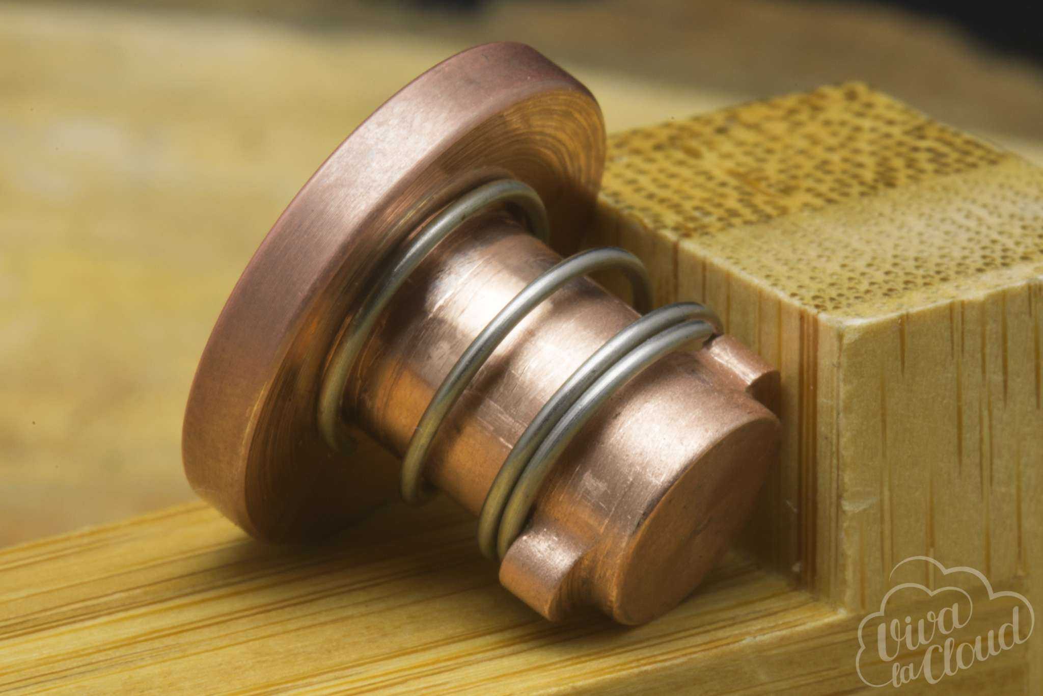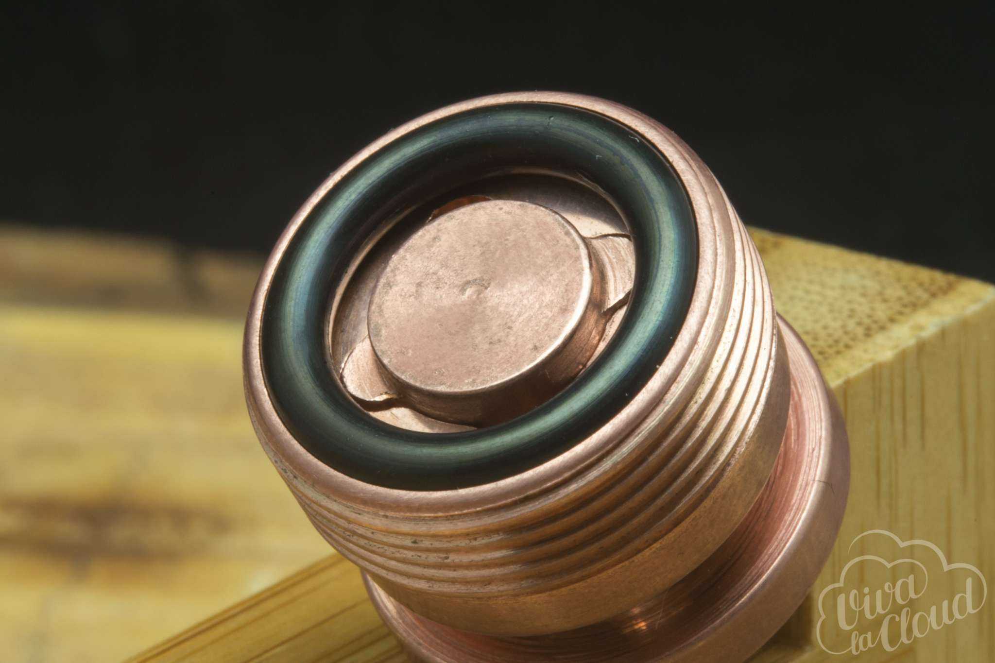 Кнопка сделана из меди и выкручивается из нижней части мода. Конструктив ее довольно прост. Пин цельный и имеет Т-образную форму. Для разбора необходимо нажать на кнопку и повернуть ее, попав в специальные пазы. Аккумулятор дополнительно изолируется специальным о-рингом и устанавливать его советуем плюсом вниз.
