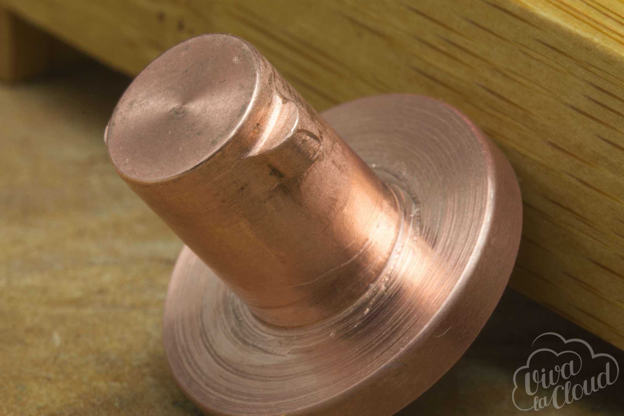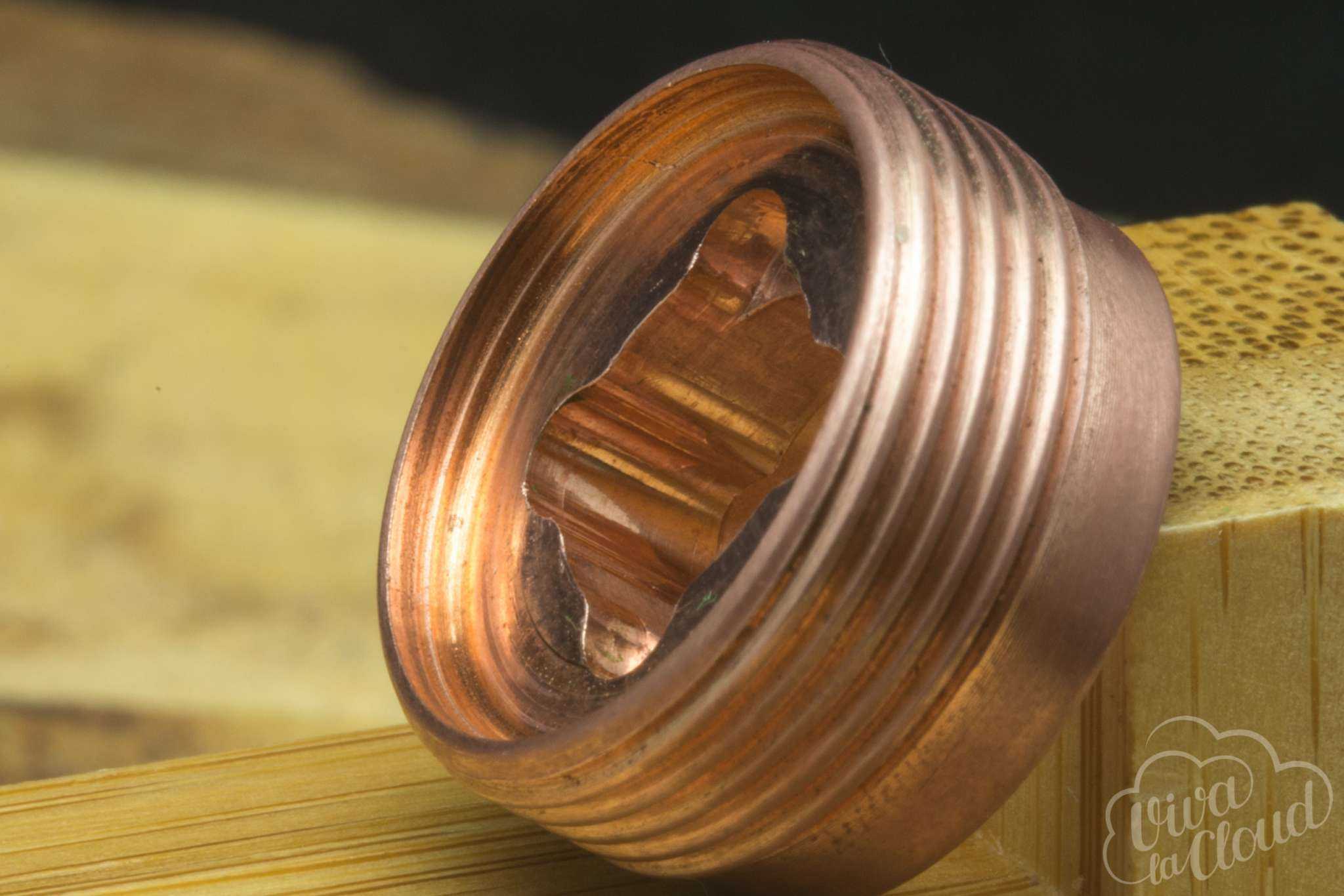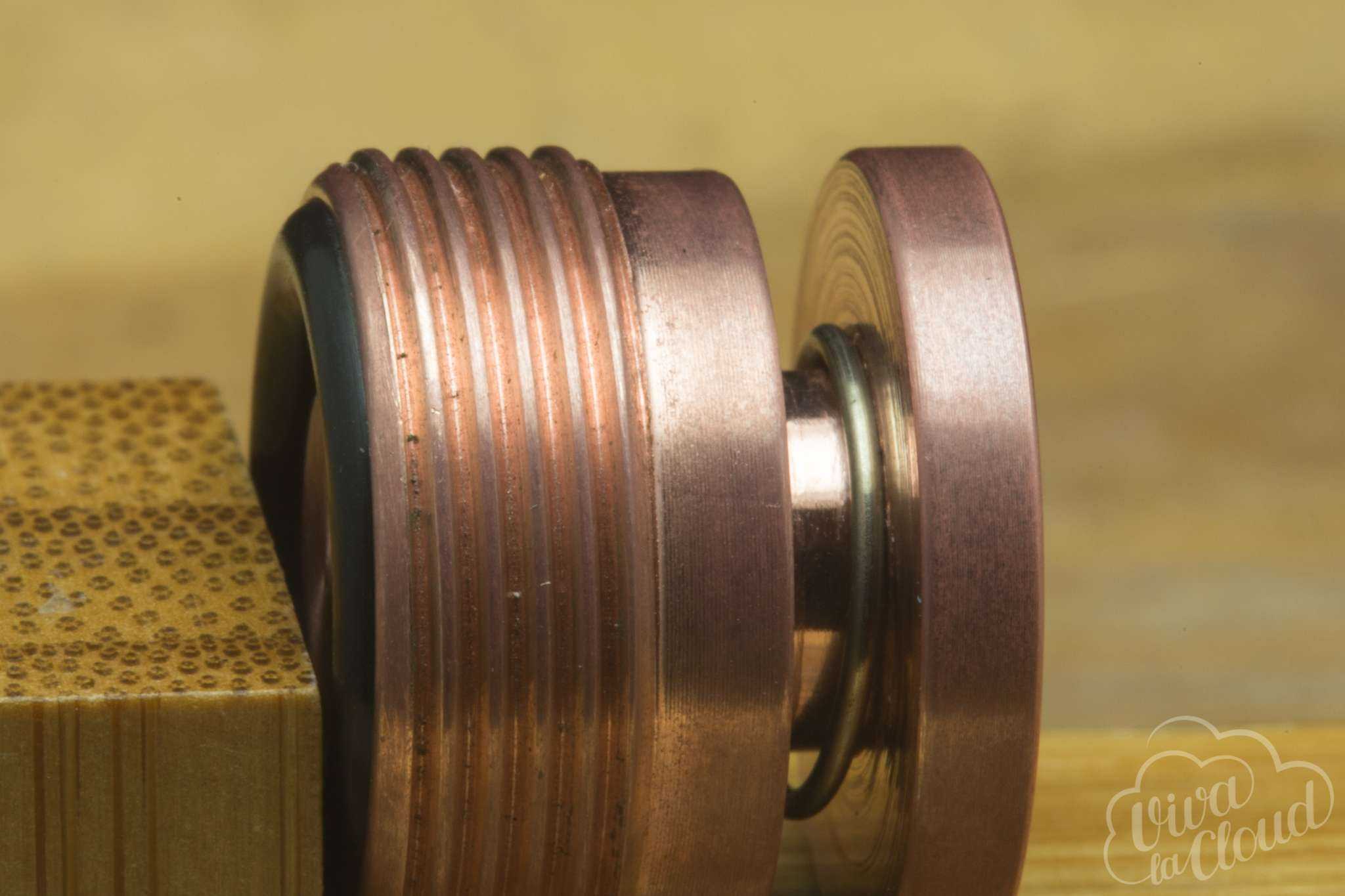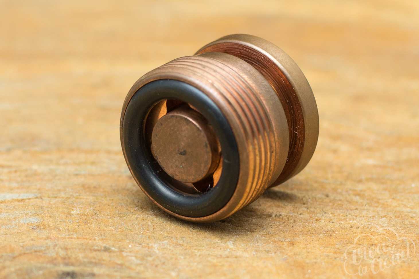 Кнопка сделана из меди и выкручивается из нижней части мода. Конструктив ее довольно прост. Пин цельный и имеет Т-образную форму. Для разбора необходимо нажать на кнопку и повернуть ее, попав в специальные пазы. Аккумулятор дополнительно изолируется специальным о-рингом и устанавливать его советуем плюсом вниз.