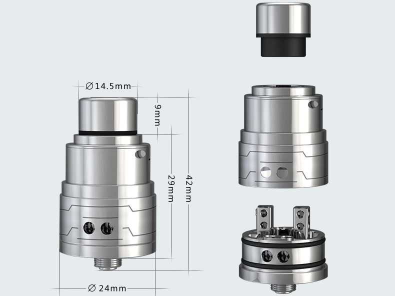 Главным новшеством является база с двумя инновационными стойками, которые дадут множество перспектив в установке спиралей и также упростят этот процесс. Благодаря таким техническим особенностям атомайзер должен обладать хорошей вариативностью: можно добиться как приличного количества пара, так и хорошей передачи вкуса при желании. Помимо всего прочего, плюсовая стойка и контакт 510-го коннектора позолочены. Сама дека выполнена из нержавеющей стали, а дрип-тип — из делрина, как и адаптер для него.