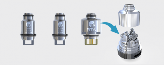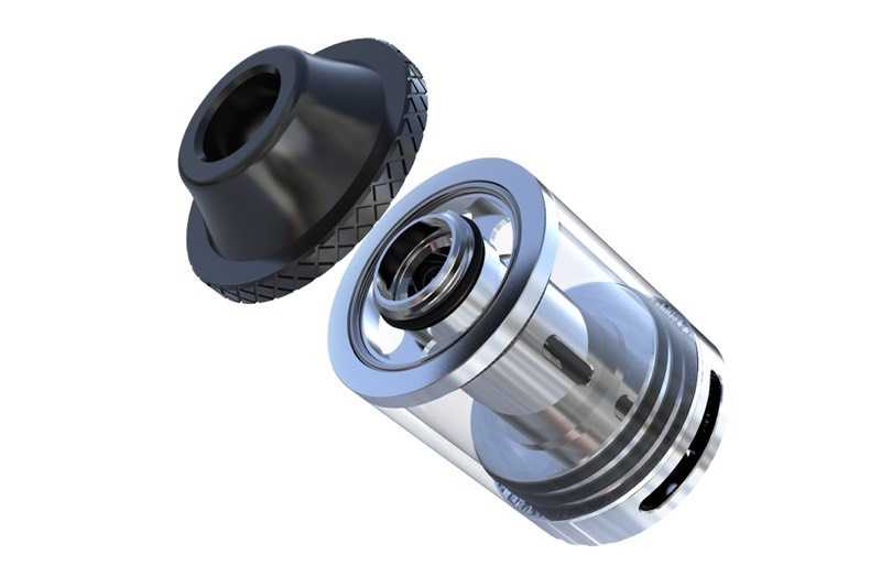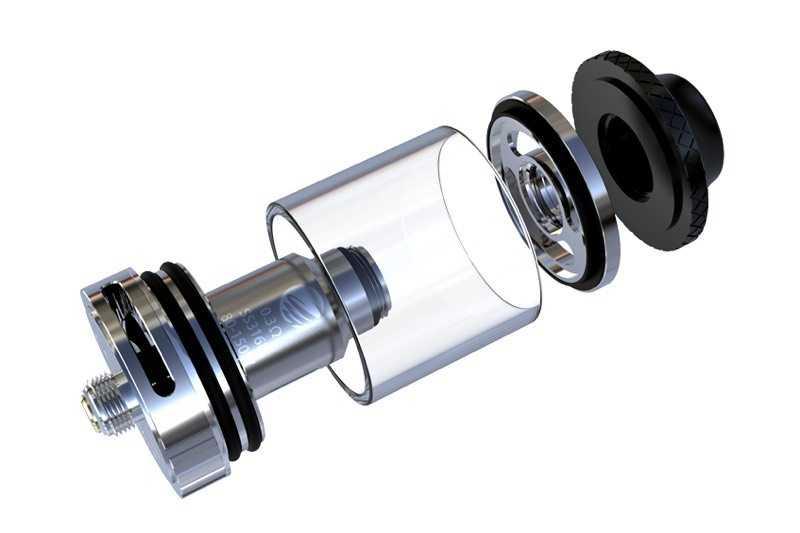 Девайс выглядит весьма компактно. При этом в него вмещается 4,2 миллилитра жидкости, а все благодаря как раз таки диаметру в 25 мм. Заправка производится через верх: достаточно снять топ-кэп и закапать жидкость через слоты, обладающие, судя по фото, приличными размерами. Как и в Cleito, испарительная камера одновременно приходится и шахтой, и это обещает потрясающую вкусопередачу. В комплекте предусмотрено два типа испарителей из нержавеющей стали: на 0,25 Ом (40-80 Вт) для маломощных устройств и 0,3 Ом (80-150 Вт) для девайсов повыше классом. Также присутствует обслуживаемая база с velocity-стойками. Конечно, для таких высоких мощностей нужен и приличный обдув. К счастью, такой тут имеется и представлен двумя внушительными отверстиями снизу базы.