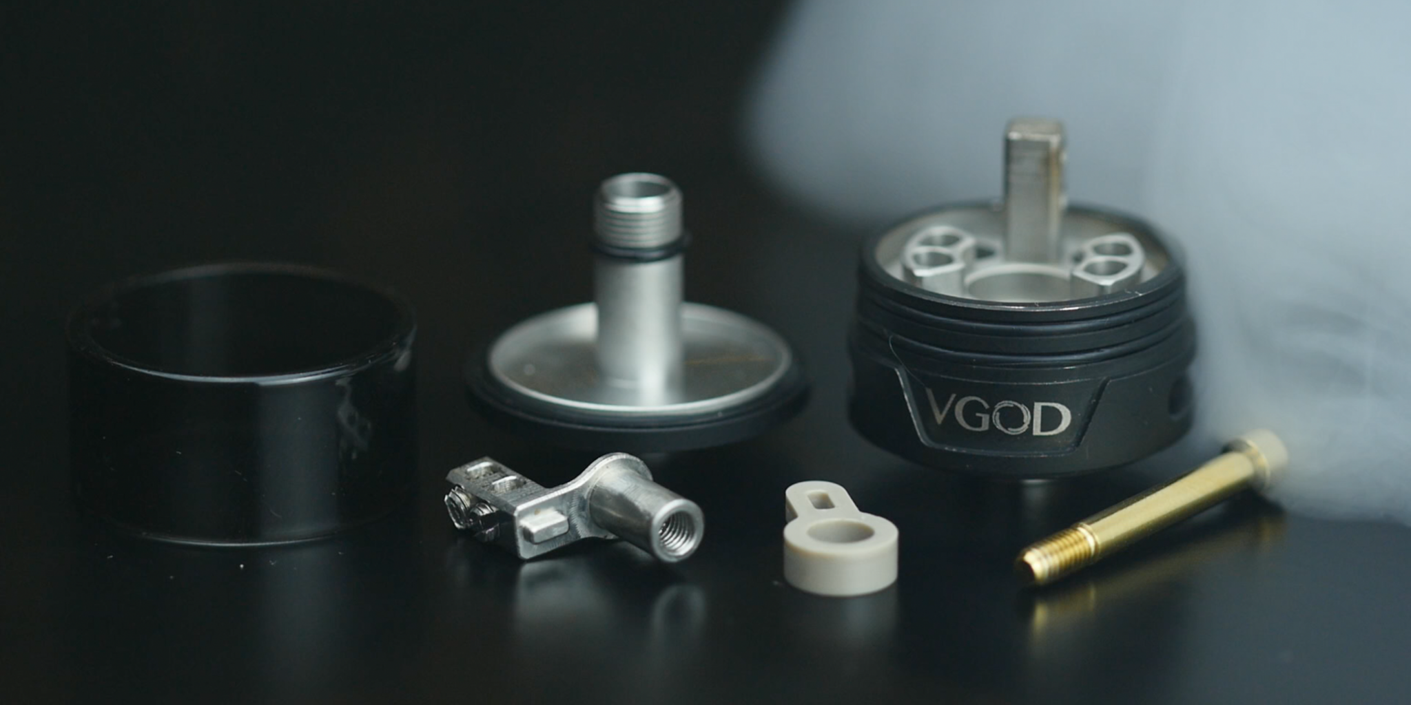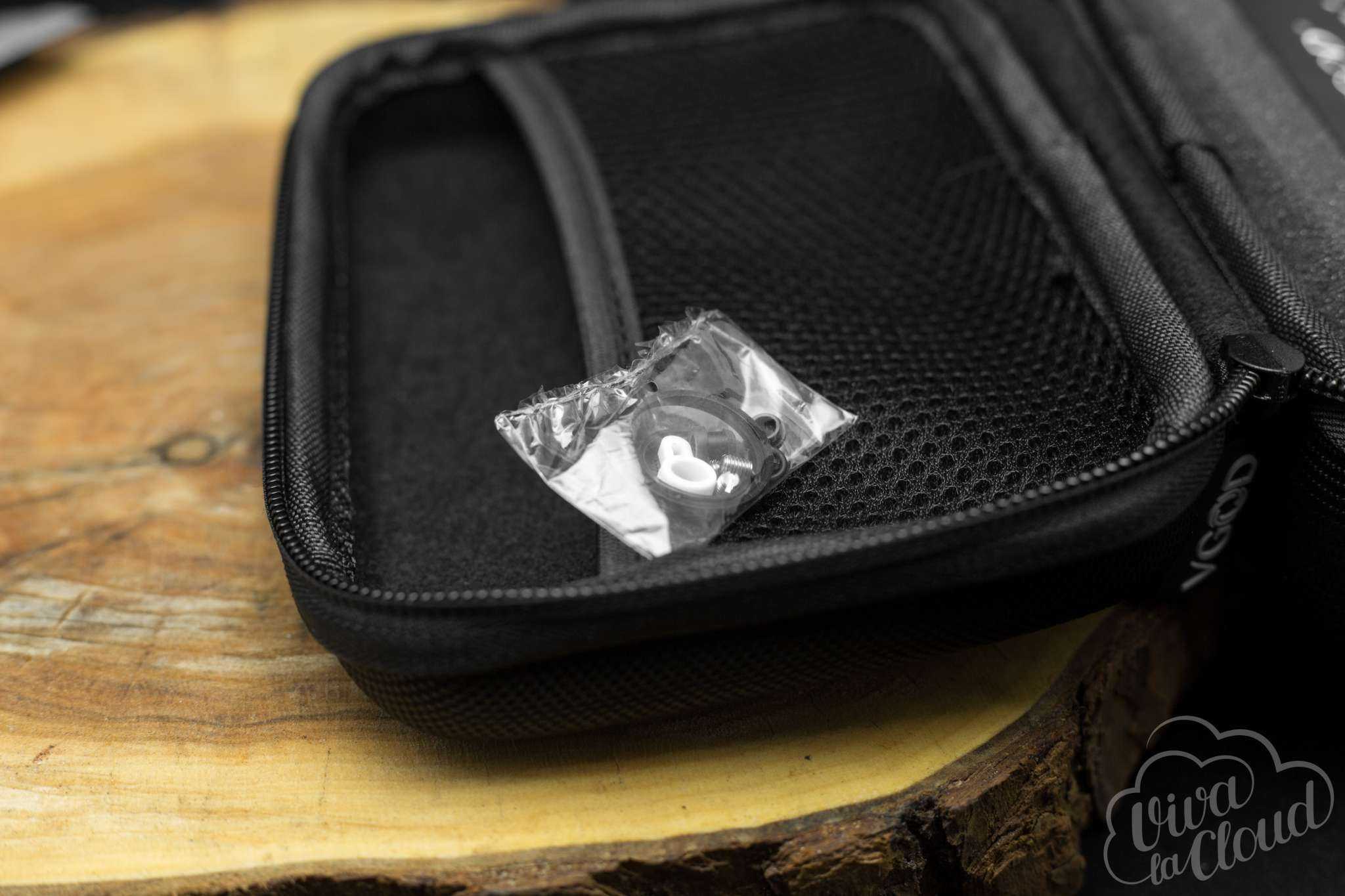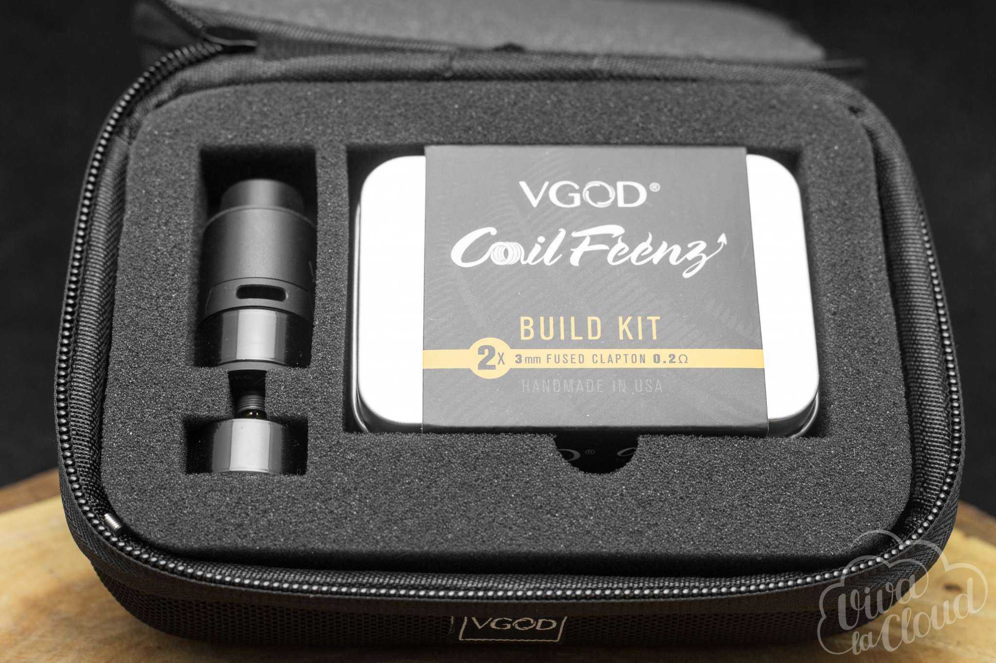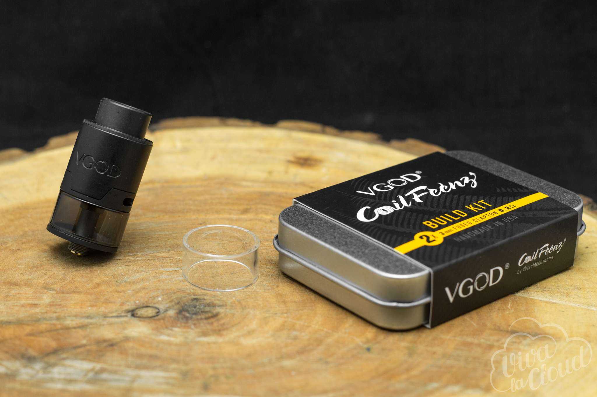 Бак поставляется в трех цветовых вариациях: стальной, золотой и черной. На корпусе испарительной камеры находится логотип компании VGOD.