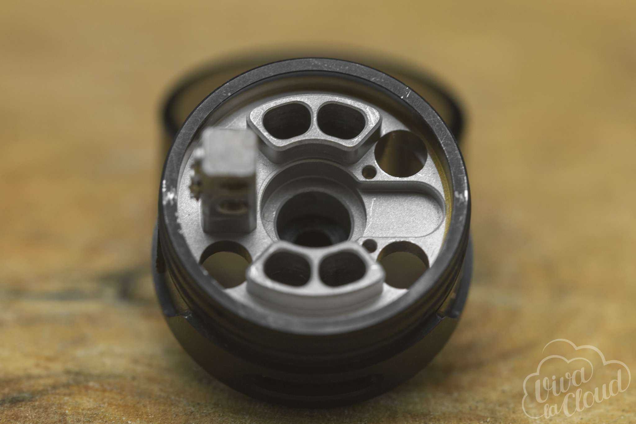 Во-вторых, заливать жидкость придется медленно. На базе около плюсовой стойки предусмотрены два небольших отверстия для того, чтобы воздух мог выйти из бака во время заправки. Однако в моем случае этих отверстий не хватало. Я привык заливать жидкость довольно быстро, как на Limitless Plus RDTA. В итоге, жидкость начинает просачиваться на базу и дальше вытекать через обдув, что еще раз неприятно.