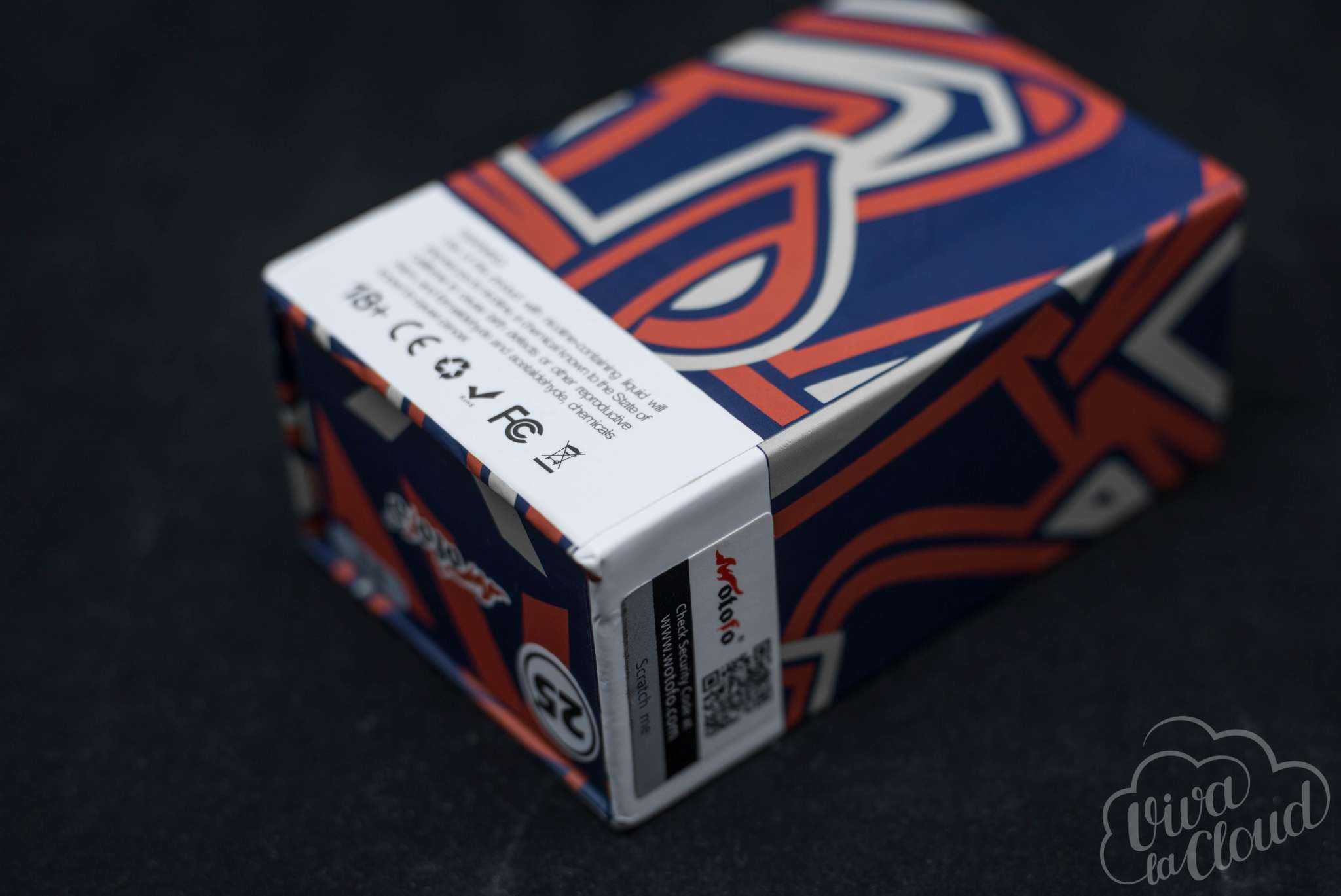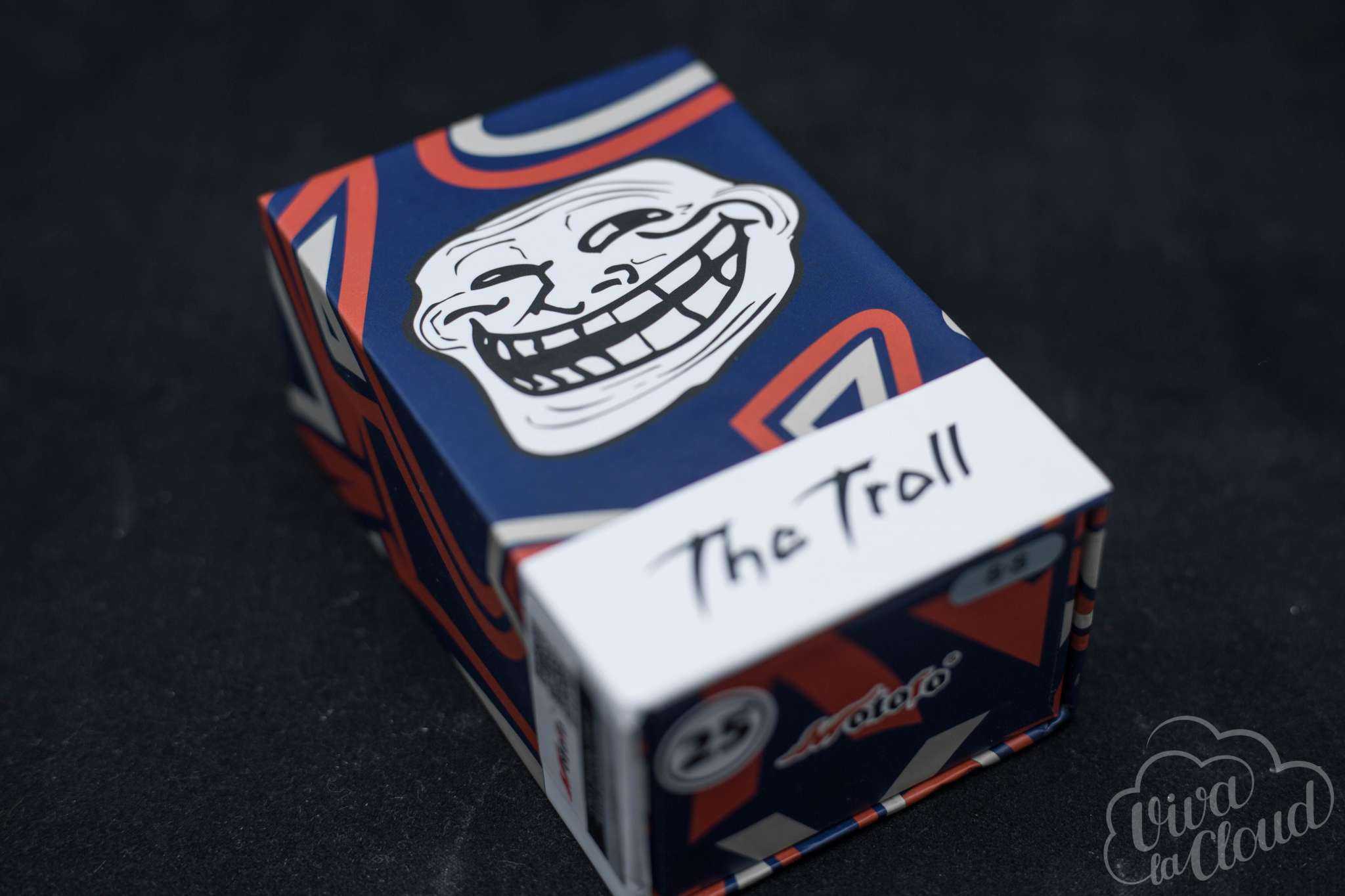 The Troll V2 поставляется в уже типичной для Wotofo коробочке с геометрическими узорами. Спереди красуется тот самый «Троллфейс». Сбоку есть скретч-код для проверки вашего атомайзера на оригинальность. Версия на 25 мм отмечается дополнительным стикером «25».