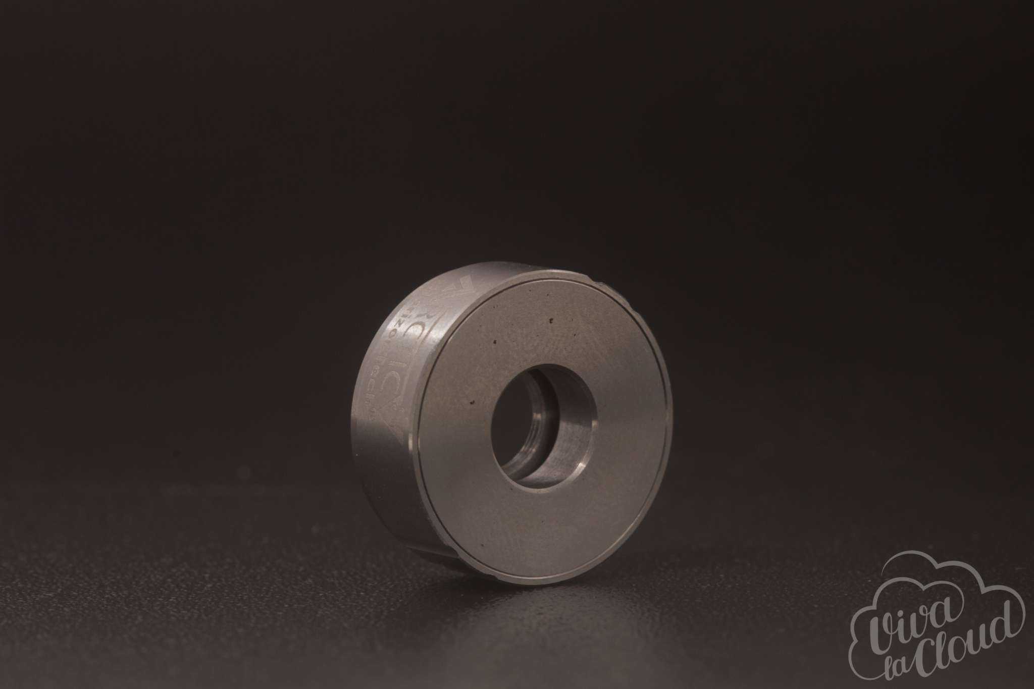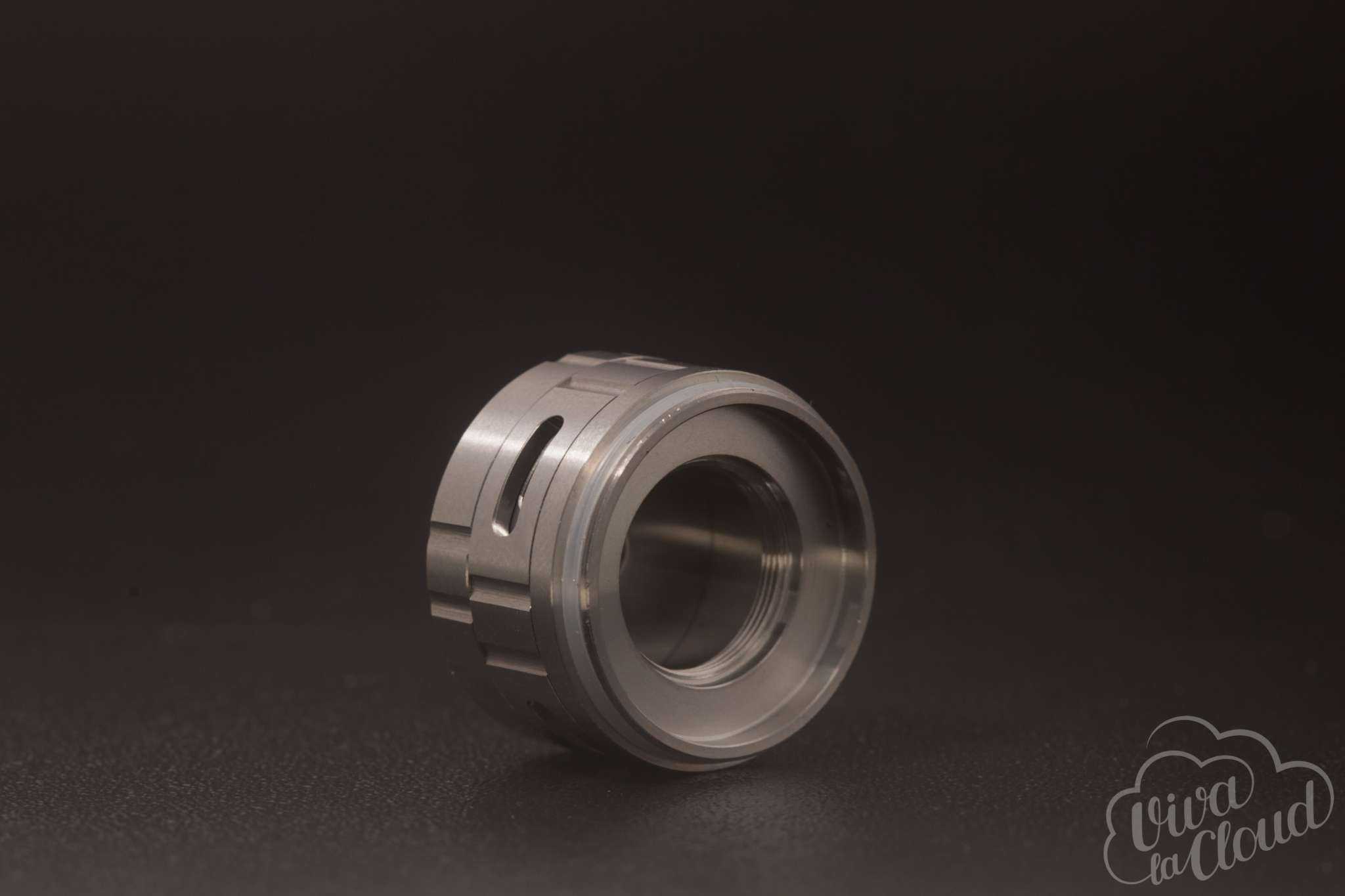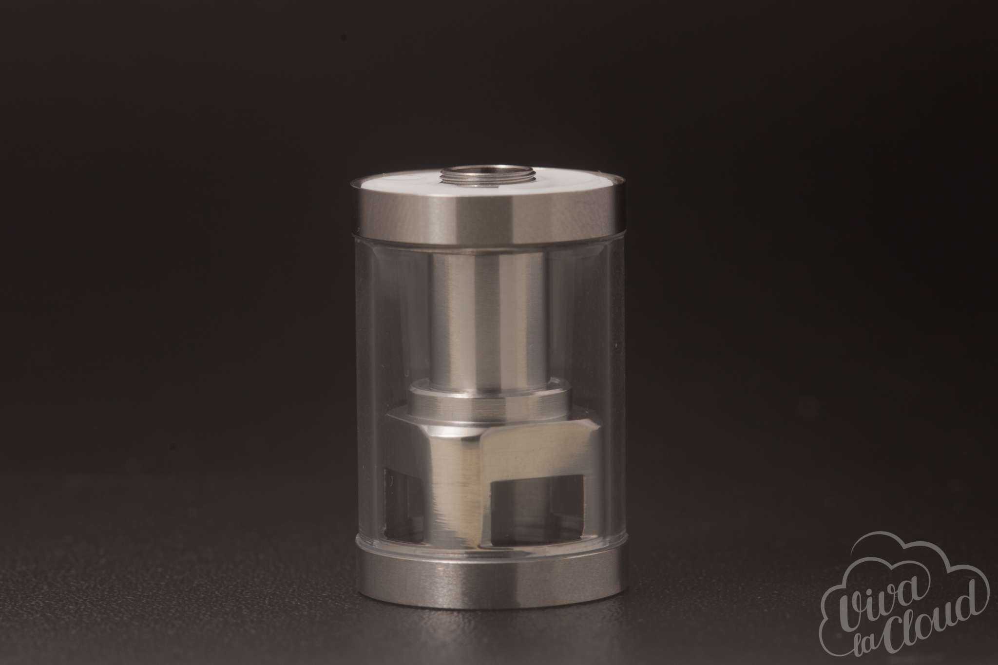 Конструкция проста: состоит девайс из дрип-типа, топ-кэпа, заправочного кольца, базы с регулируемым обдувом, цилиндрического стекла и каркаса, который является еще и шахтой.