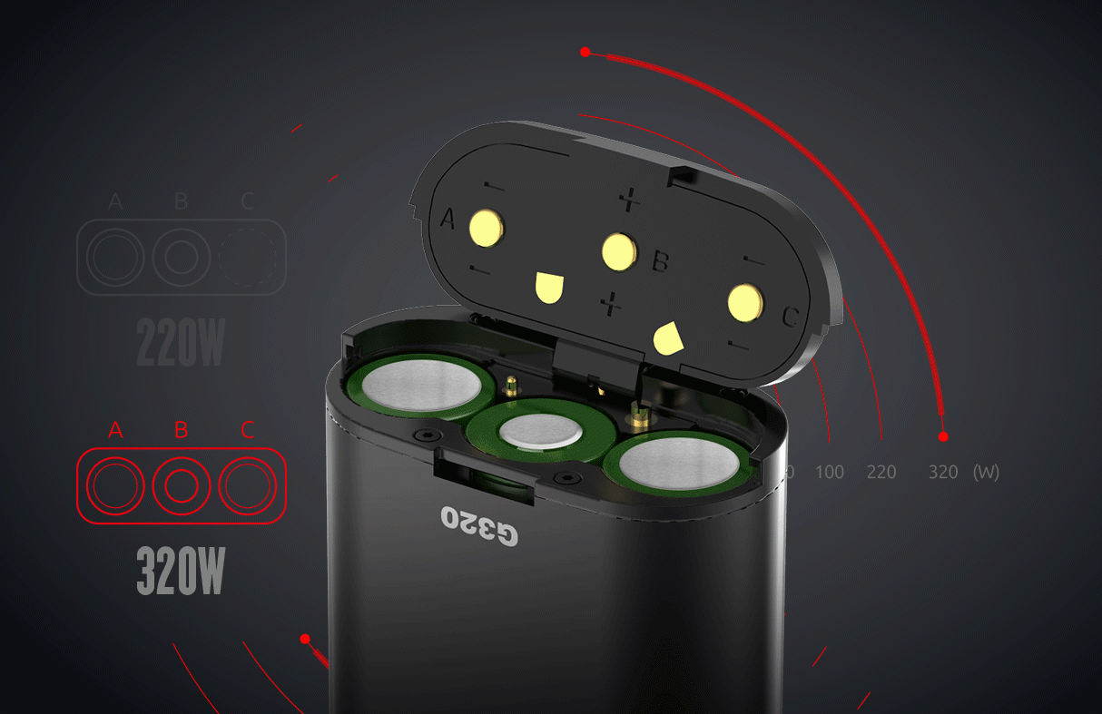 Даже по картинкам уже заметили, что размеры SMOK G320 Kit весьма внушительные? Дело в количестве элементов питания. Идея здесь такая же, как и в RX2/3: можно использовать как два, так и три аккумулятора 18650. В первом случае ваша максимальная мощность будет ограничена на отметке в 220 Вт, а во втором — на уровне 320 Вт. Правда, в отличие от боксмода Wismec, компактнее G320 от меньшего количества «банок» не станет — только легче.