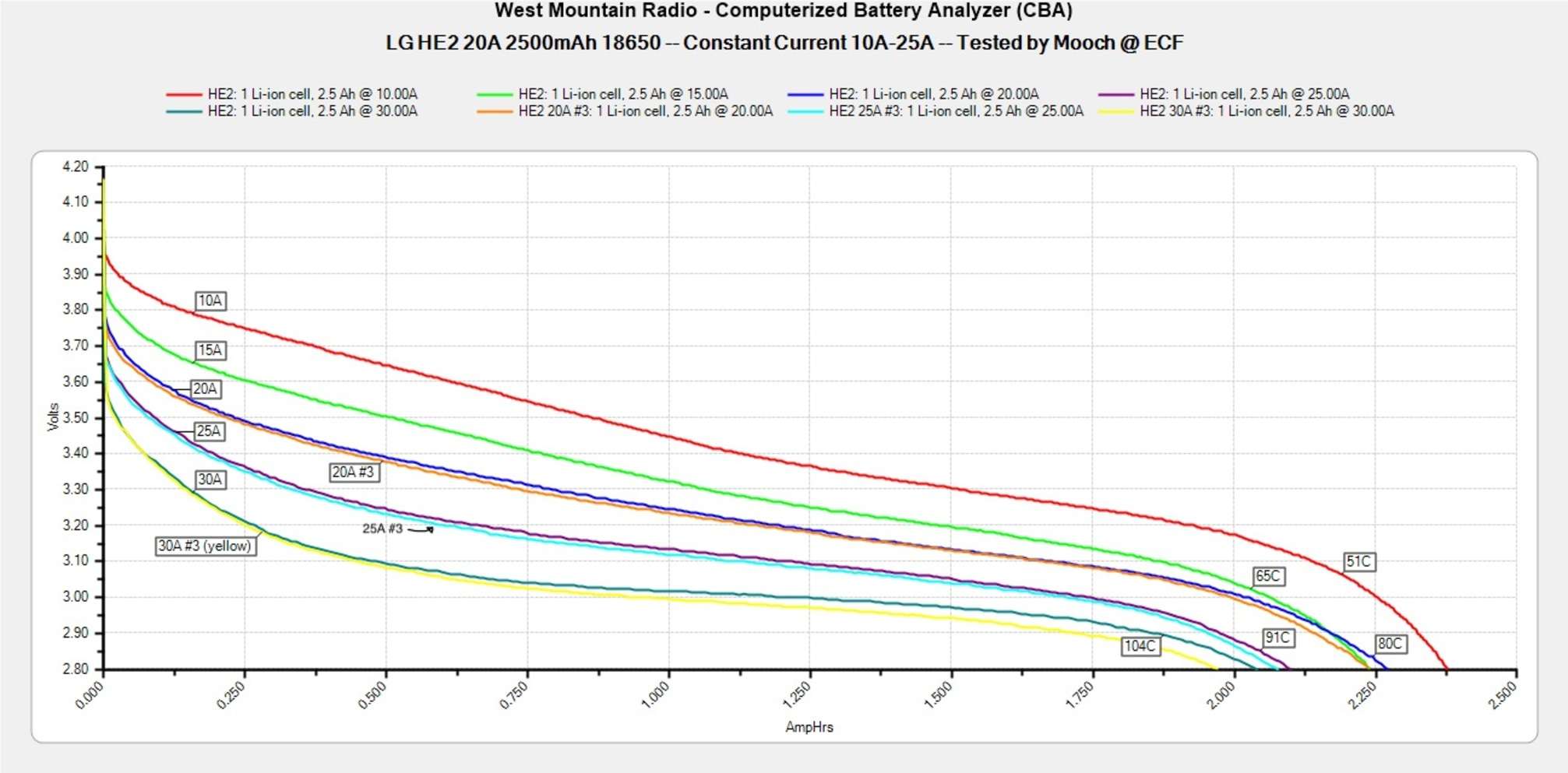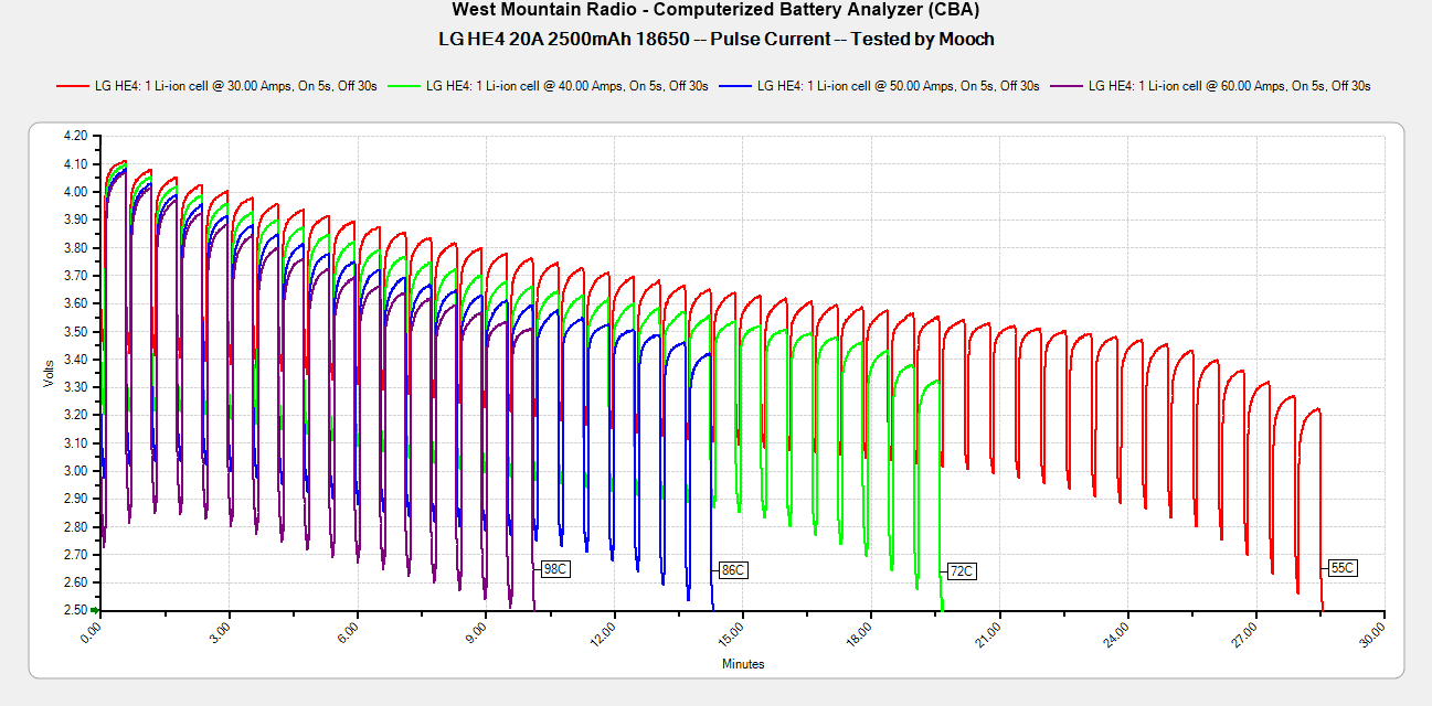 HE4 считаются улучшенной версией HE2. Однако если верить тестам, то эти аккумуляторы серьезно проигрывают в рабочих температурах, нагреваясь сильнее на тех же токах. Впрочем, за это вы получаете слегка увеличенную автономность.