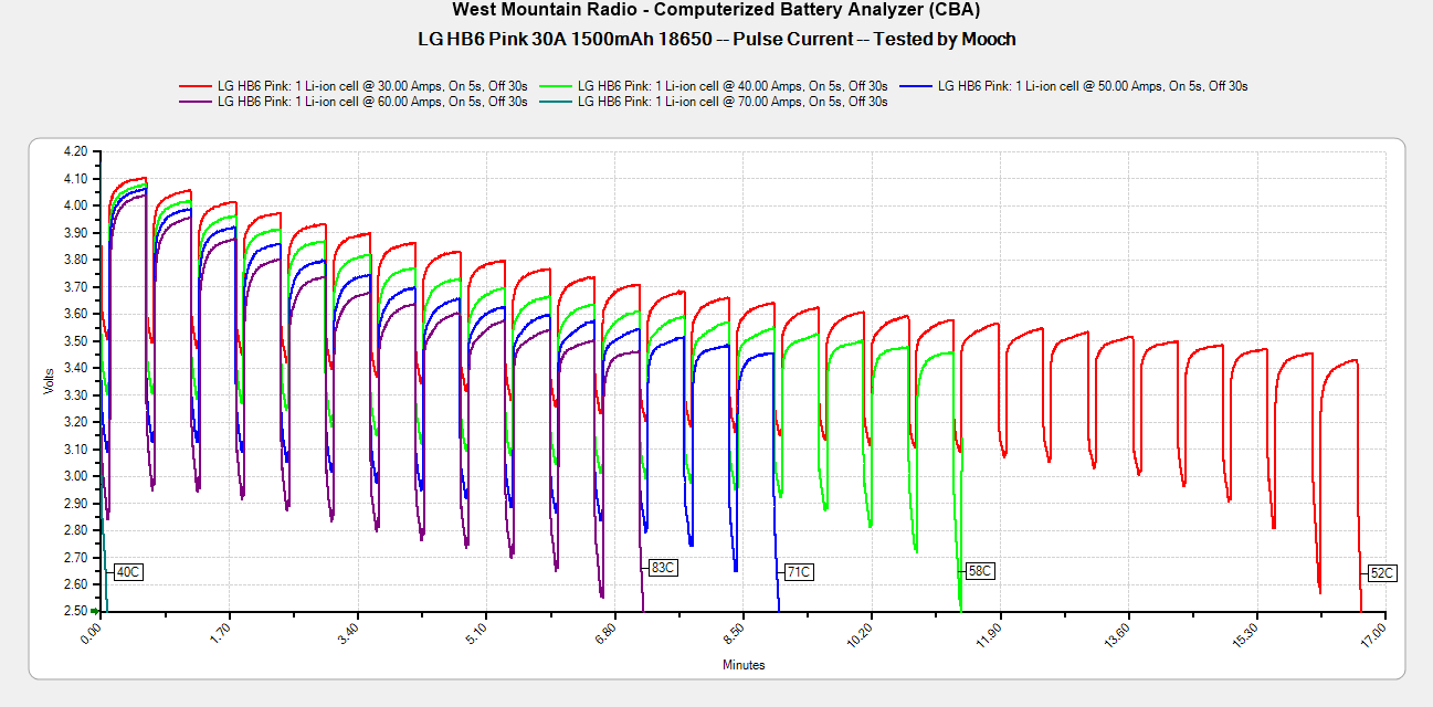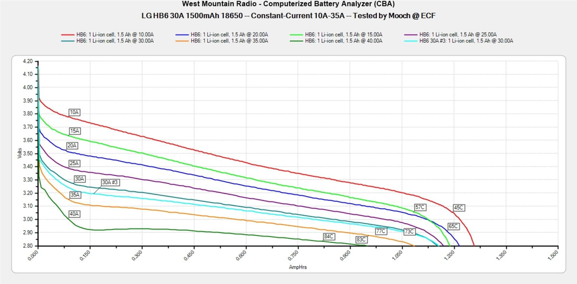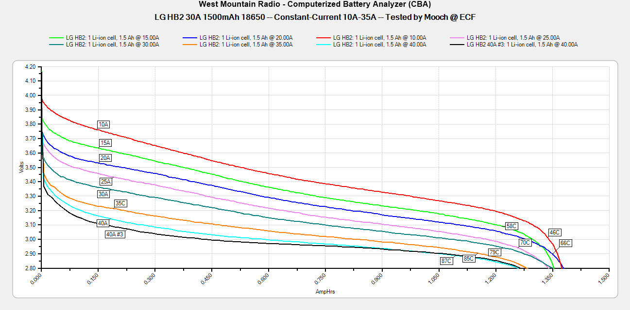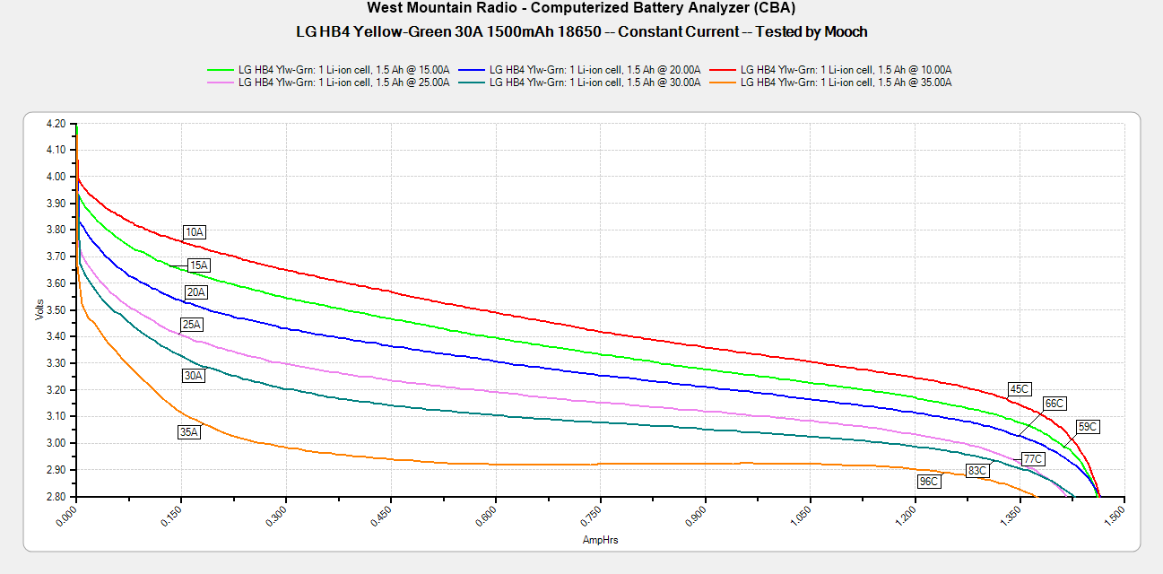 Максимальная постоянная токоотдача. Количество ампер, на которых батарея достигает температуры в 78ºC (более точный диапазон — от 74 до 82ºC) при постоянной нагрузке. После преодоления этого рубежа начинается более активная просадка по напряжению и более прямолинейный нагрев.
