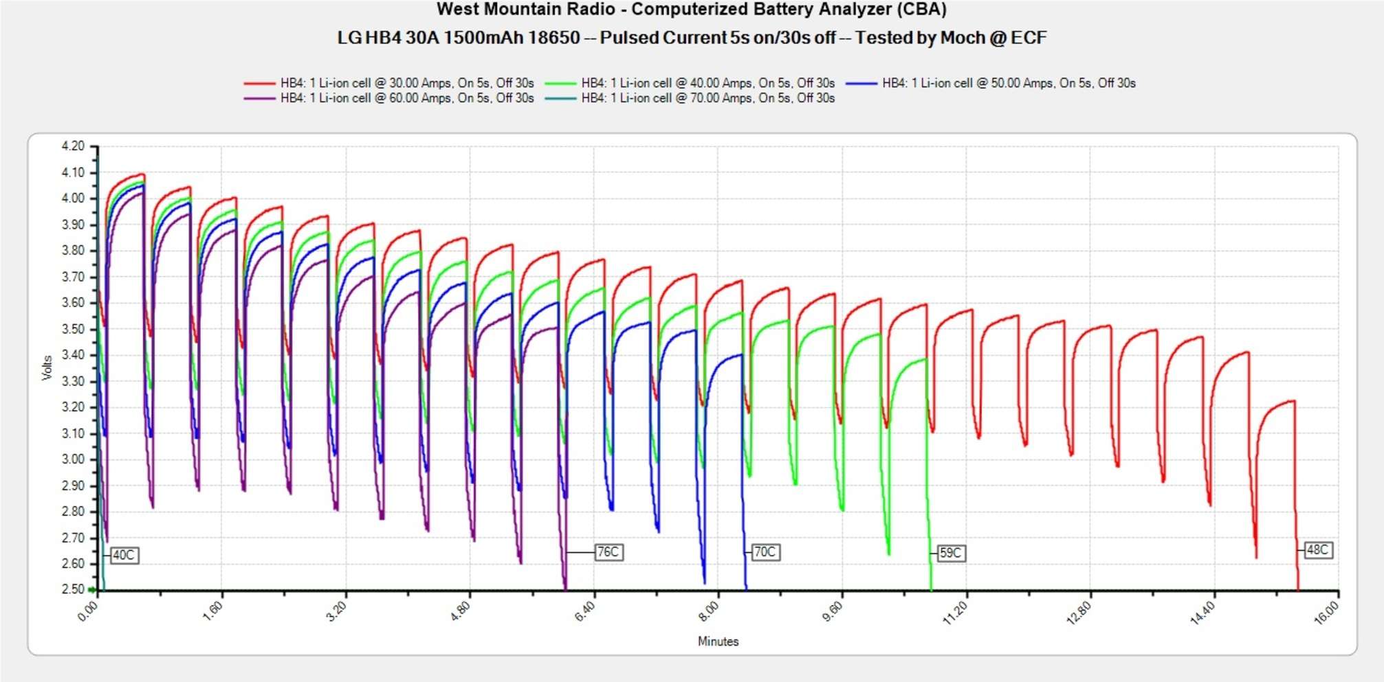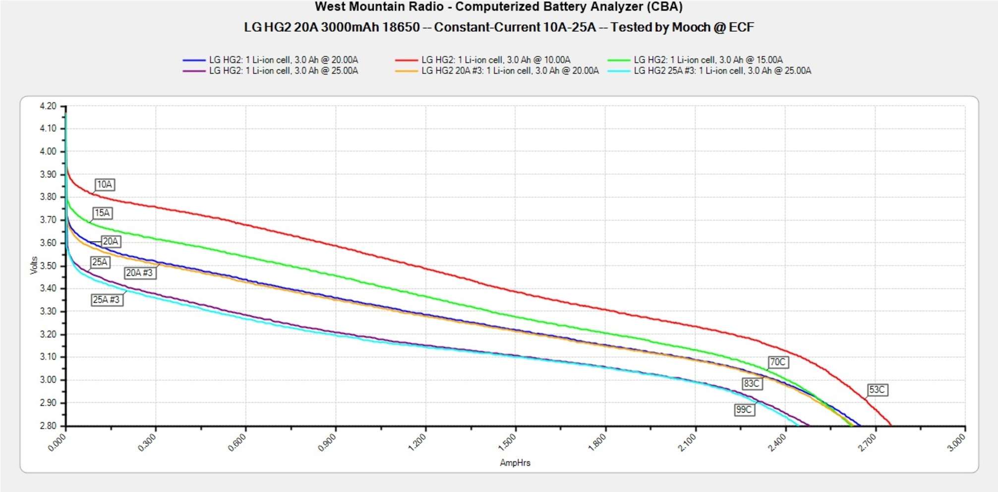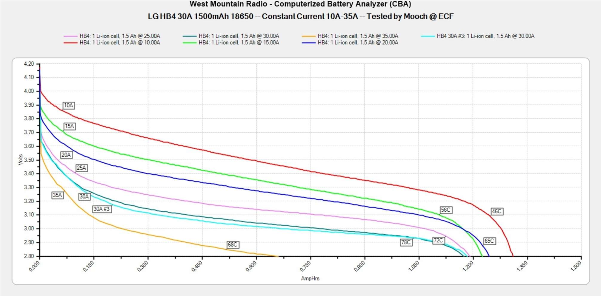 Максимальная постоянная токоотдача. Количество ампер, на которых батарея достигает температуры в 78ºC (более точный диапазон — от 74 до 82ºC) при постоянной нагрузке. После преодоления этого рубежа начинается более активная просадка по напряжению и более прямолинейный нагрев.