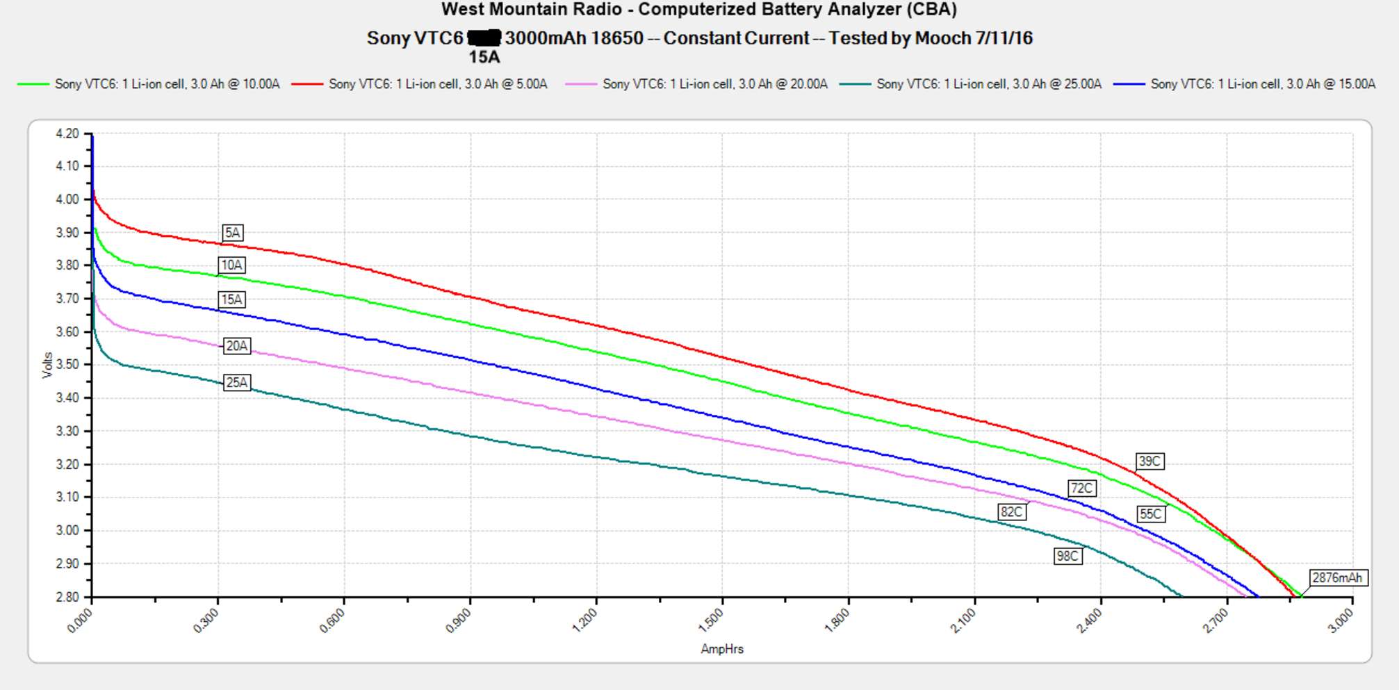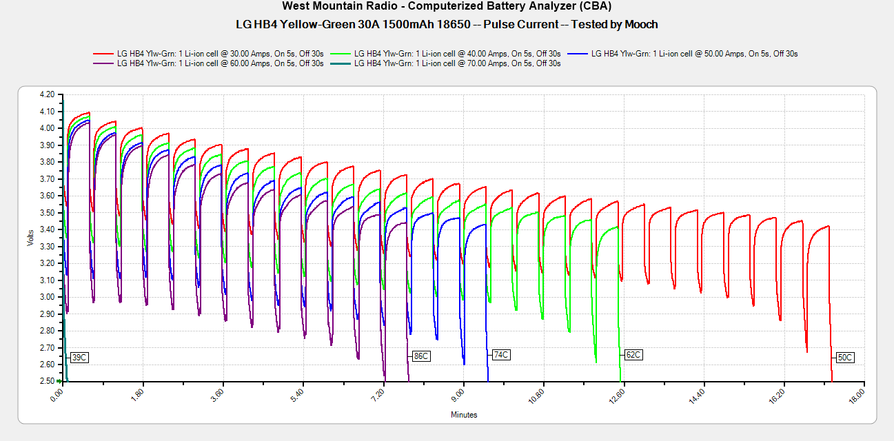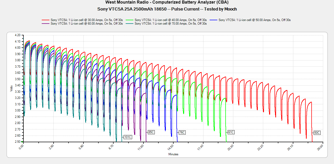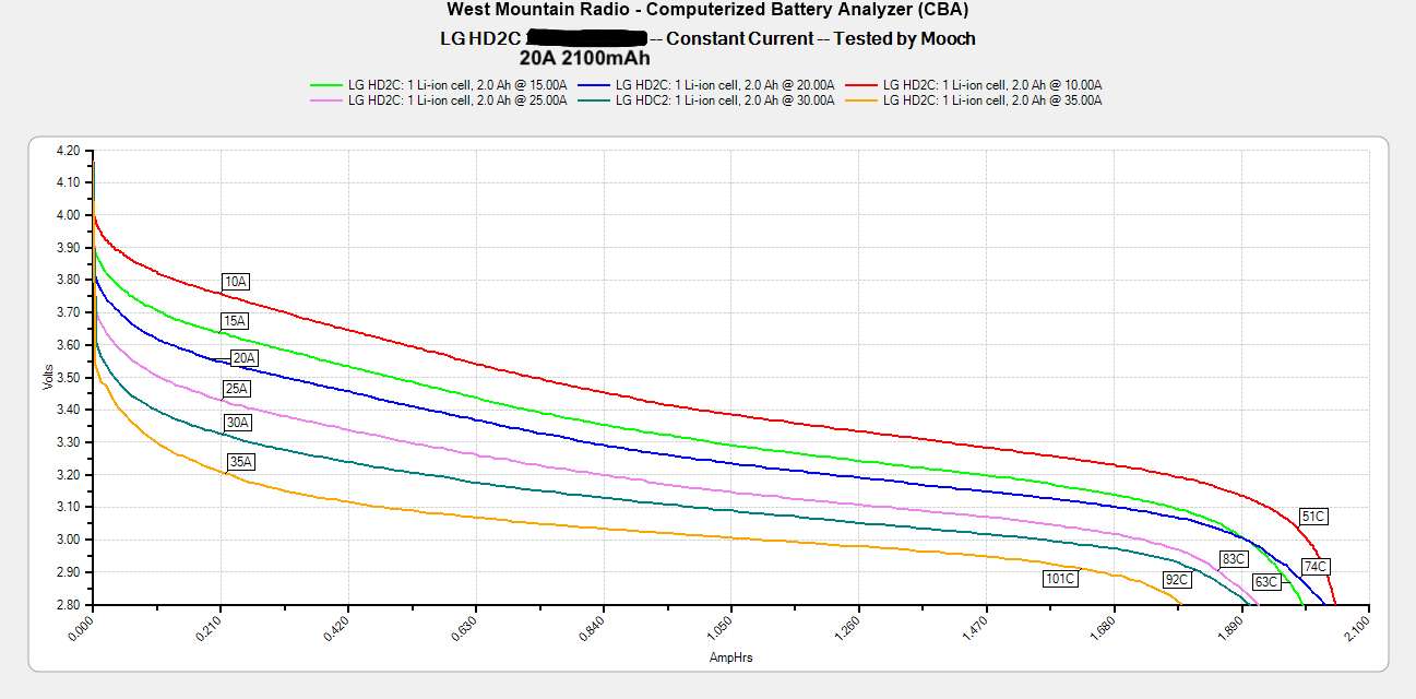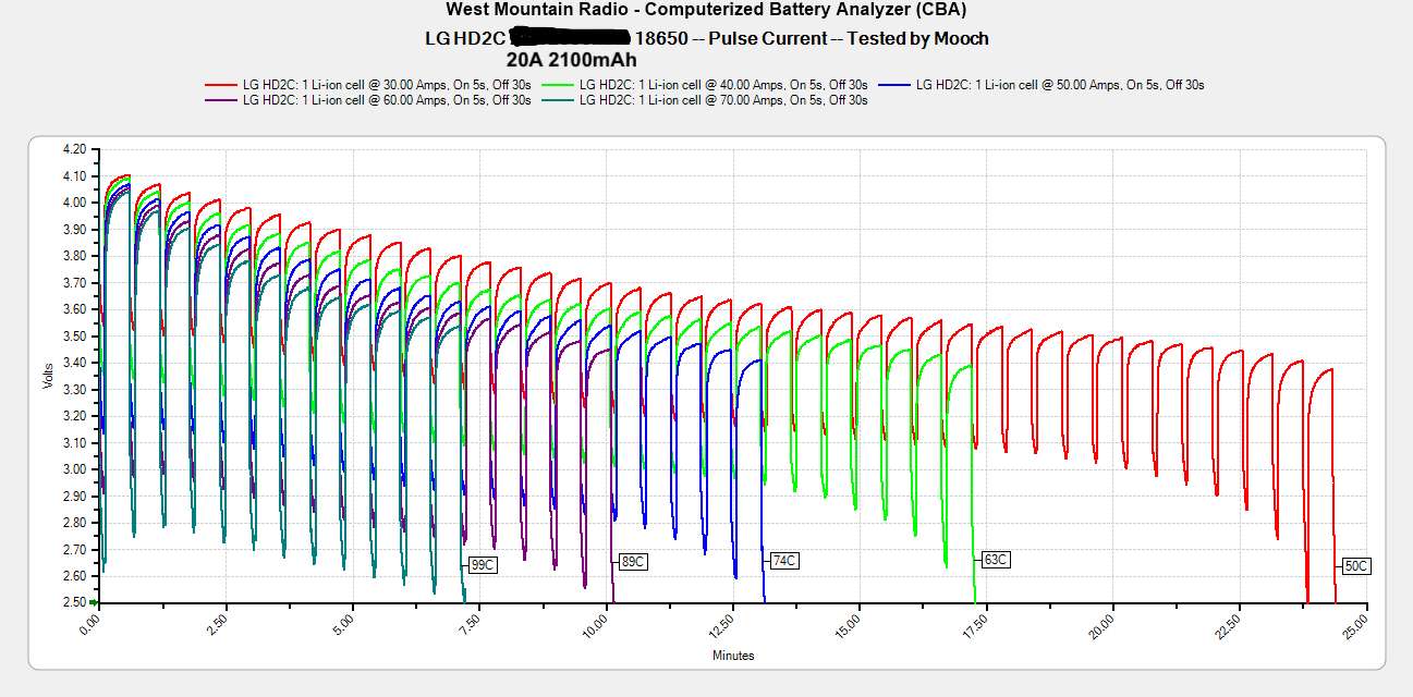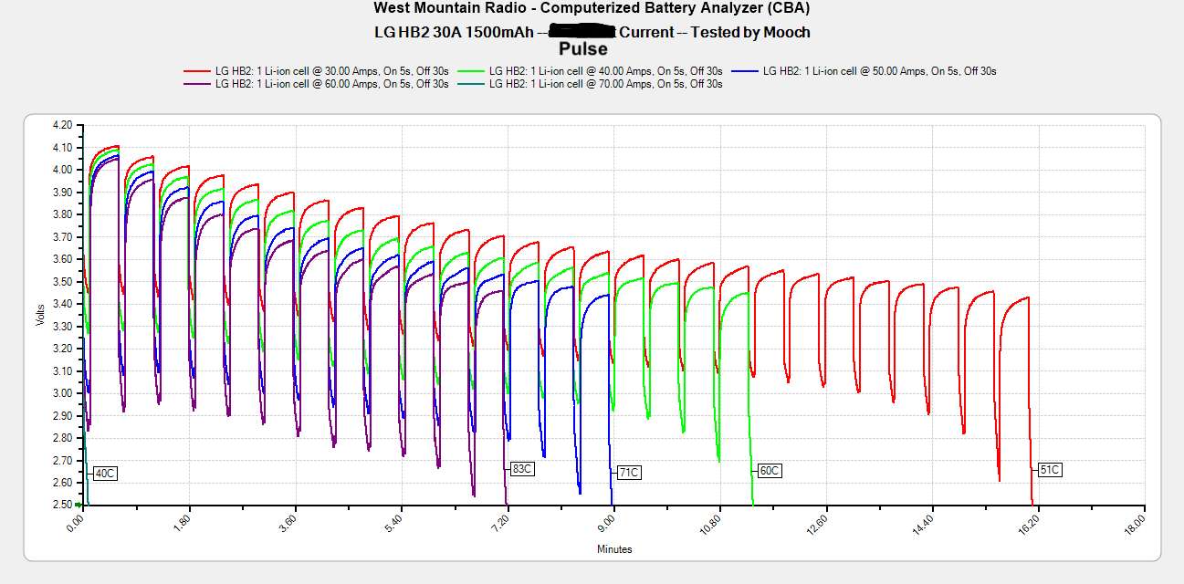Эта батарея очень похожа по показателям на HG2 и 30Q. Однако Mooch315 устраивал тестирование всех трех «трехтысячников» — VTC6 оказался на первом месте, работая чуть дольше и лучше.