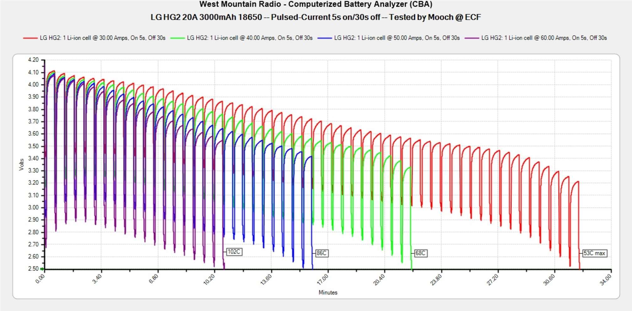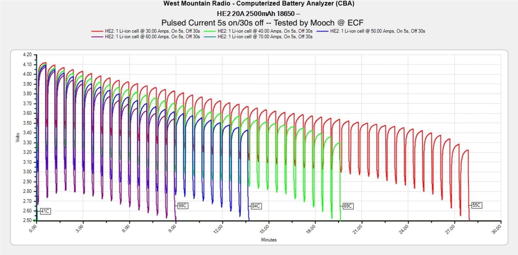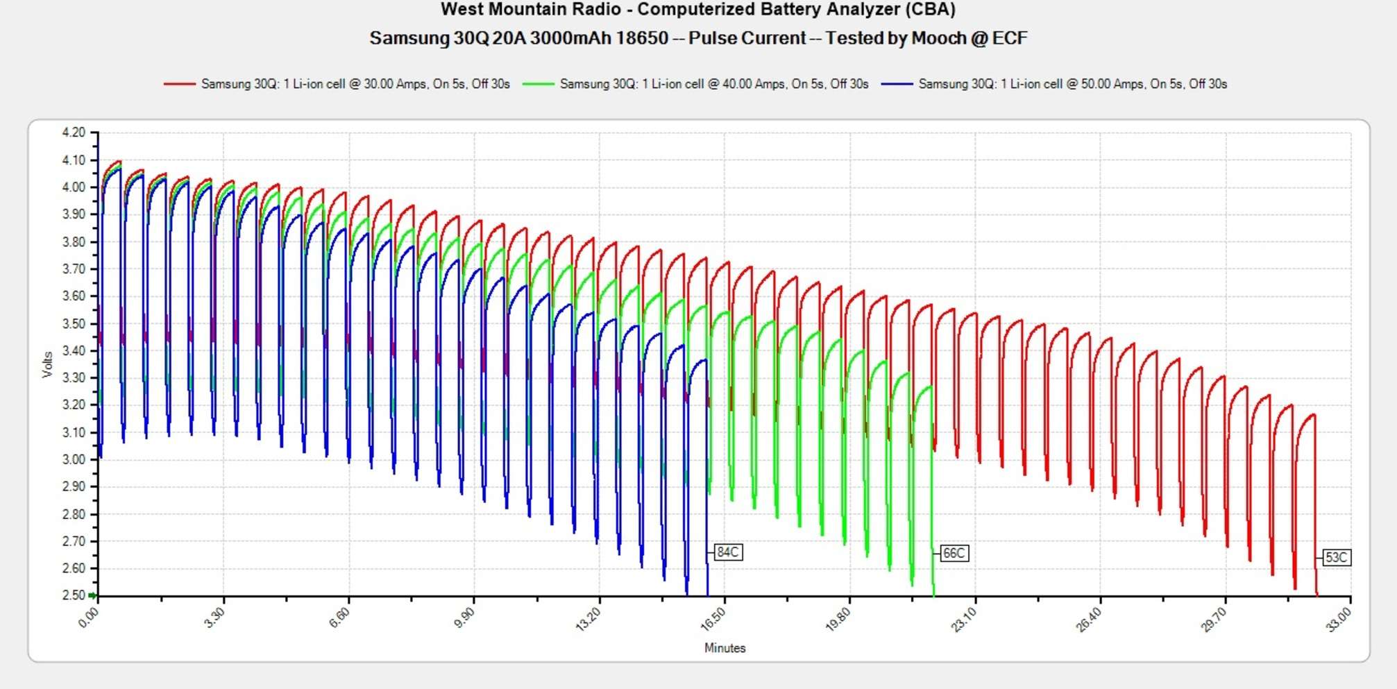Температура на постоянных токах. Mooch315 тестирует все батареи на постоянную и импульсную токоотдачу, замеряя внутреннюю температуру при разных нагрузках. Это главный показатель, на который стоит обращать внимание при выборе аккумулятора в каждой категории: чем меньше градусов, тем лучше. Отсюда же и устанавливаются рейтинги по реальным максимальным постоянным и импульсным токам, которые он может «выдержать» безопасно. Это не значит, что батарея возьмет да взорвется после превышения данного лимита — аккумулятор попросту начинает непомерно сильнее греться из-за активного разрушения внутренней химии, которая не рассчитана на такие нагрузки.