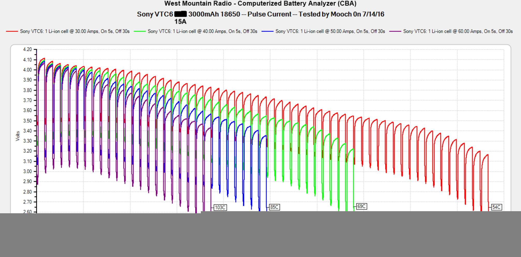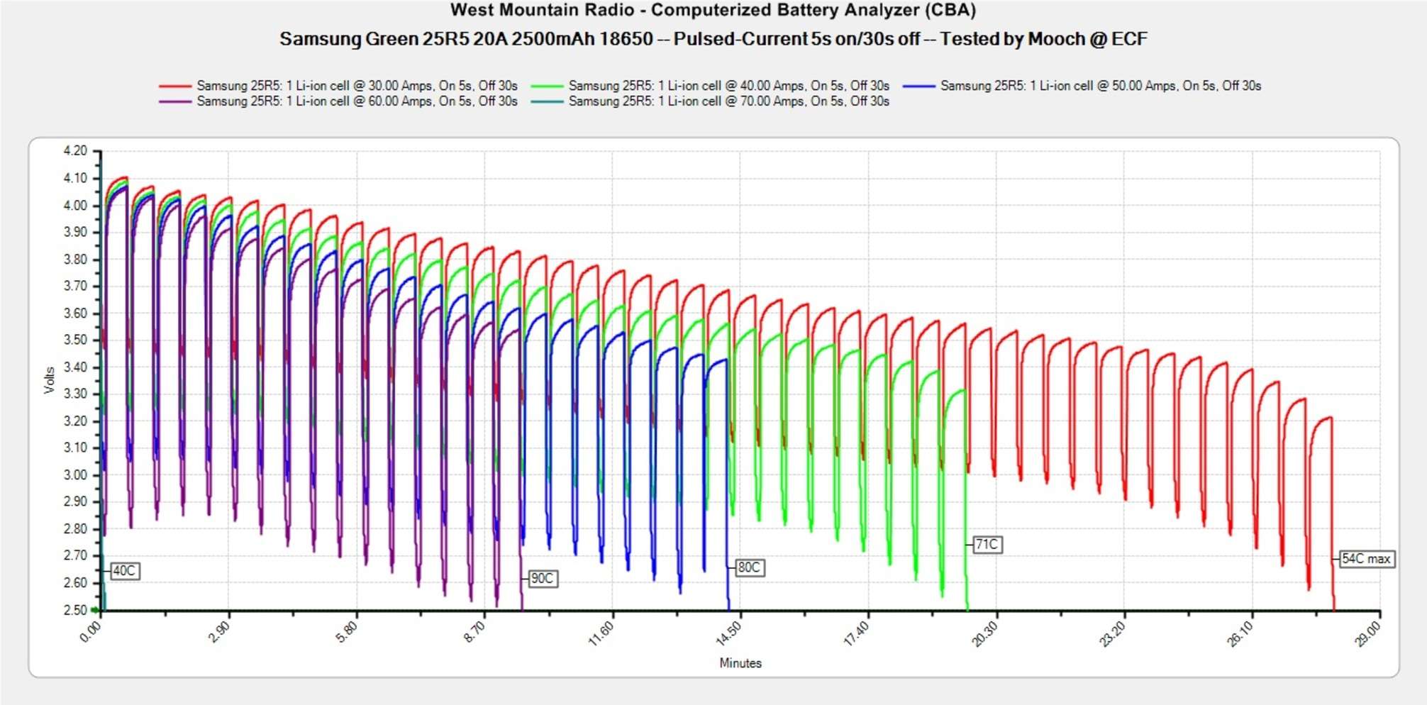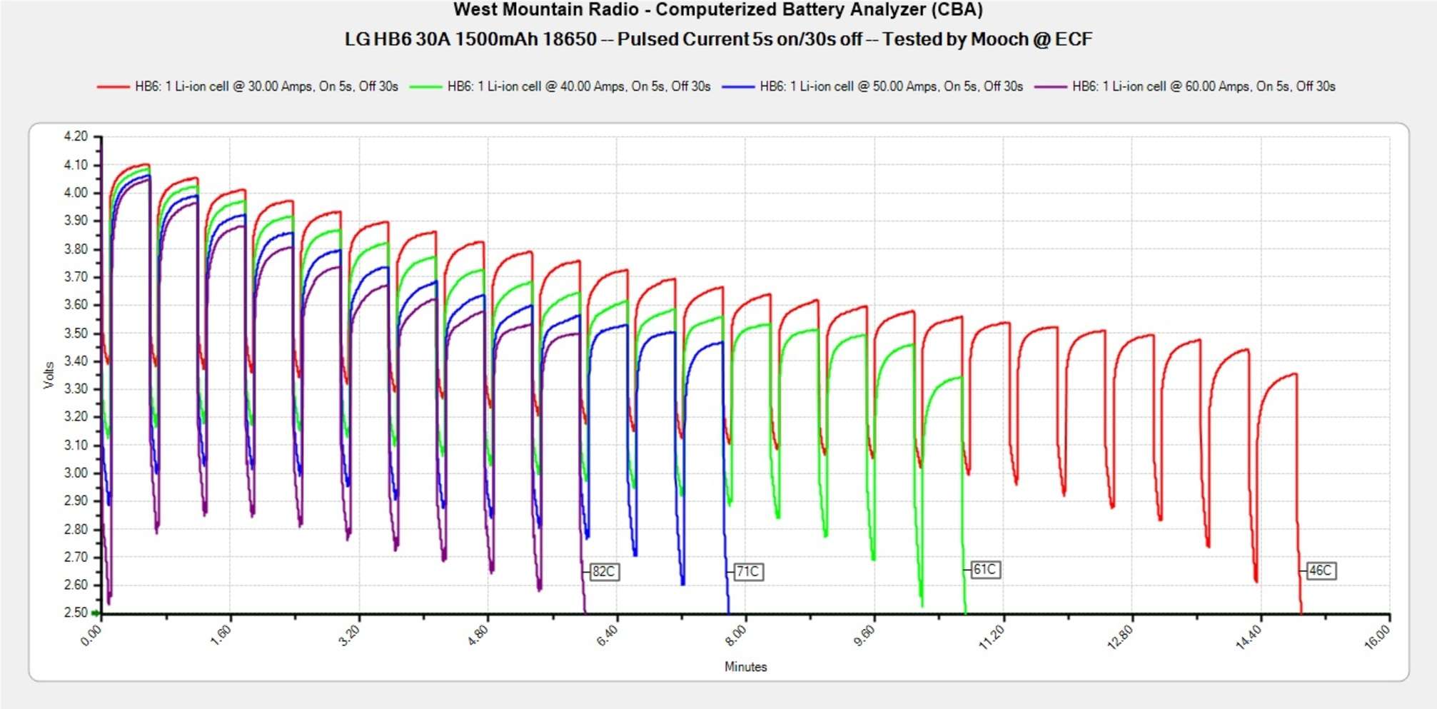 Температура на постоянных токах. Mooch315 тестирует все батареи на постоянную и импульсную токоотдачу, замеряя внутреннюю температуру при разных нагрузках. Это главный показатель, на который стоит обращать внимание при выборе аккумулятора в каждой категории: чем меньше градусов, тем лучше. Отсюда же и устанавливаются рейтинги по реальным максимальным постоянным и импульсным токам, которые он может «выдержать» безопасно. Это не значит, что батарея возьмет да взорвется после превышения данного лимита — аккумулятор попросту начинает непомерно сильнее греться из-за активного разрушения внутренней химии, которая не рассчитана на такие нагрузки.