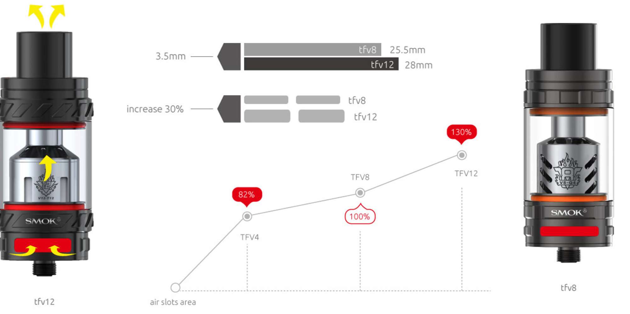 Перемены коснулись и габаритов: посадочный диаметр увеличился на 2,5 мм и составляет 27 мм. Диаметр колбы прибавил столько же — теперь он равняется 28 мм. Вот что-то, а высота изменилась незначительно — увеличилась всего на 1 мм — новый TFV12 имеет ровно 7 см в высоту. Емкость бака осталась неизменна — 6 мл.