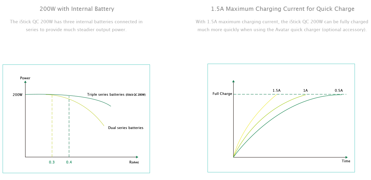 Мод выдает 200 Вт максимальной мощности, а внутри спрятаны три последовательно подключенных несъемных аккумуляторных ячейки, дающих в сумме 5000 мАч емкости. При использовании специального зарядного устройства Avatar, iStick QC 200W может заряжаться в короткие сроки током в 1.5А.