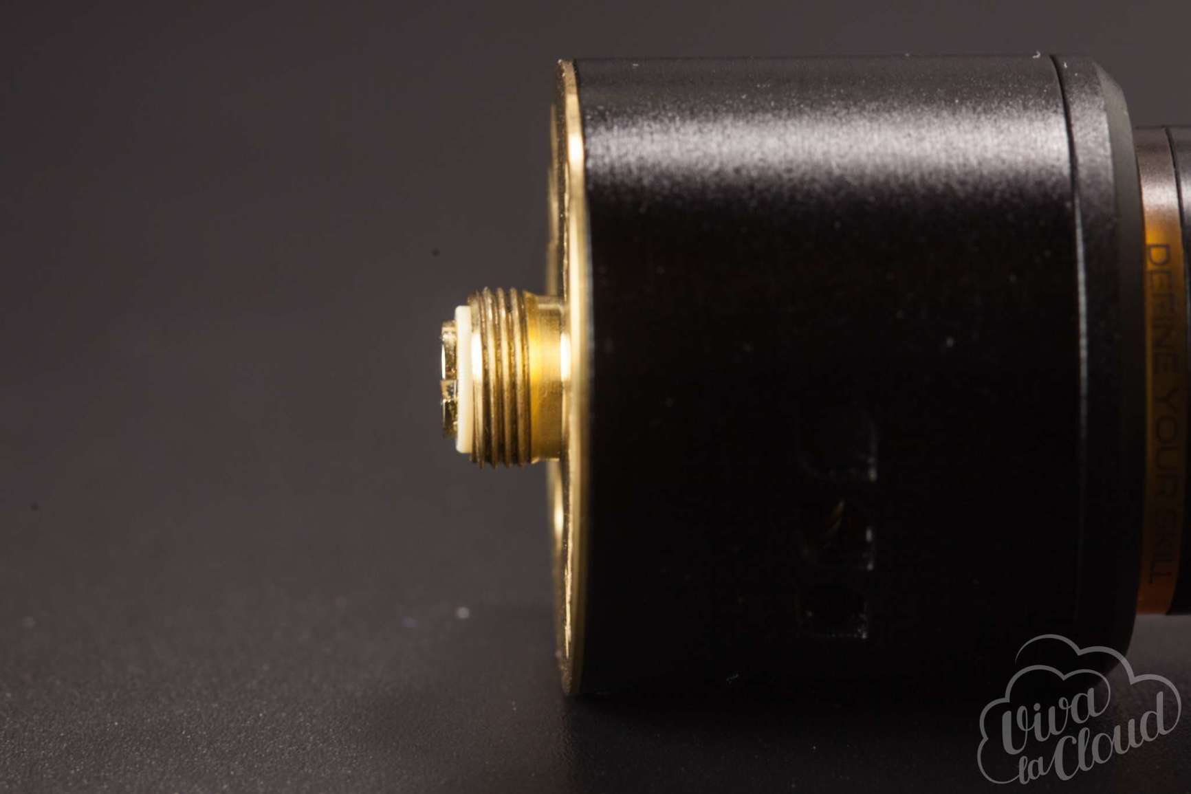 С нижней стороны выбиты гравировки с названиями, а также тут можно обнаружить крестообразный винт, удерживающий минусовую стойку. Пин коннектора достаточно выступает для использования в связке с модами, обладающими гибридным коннектором.