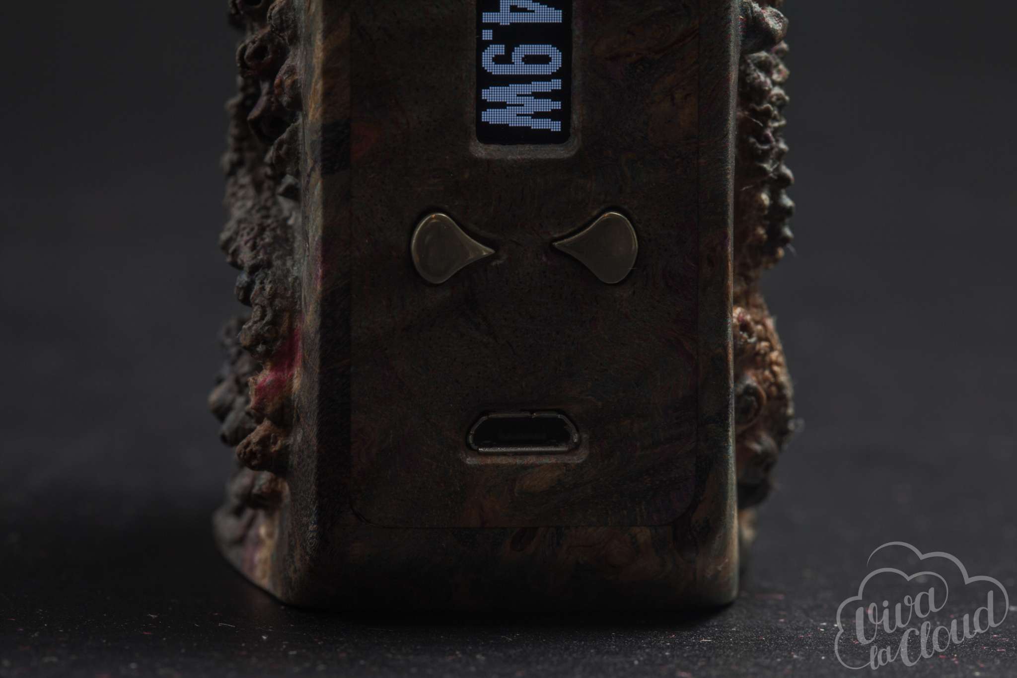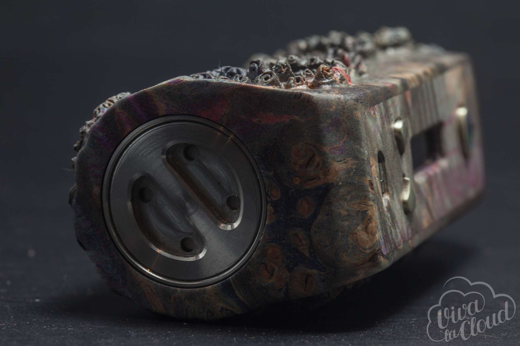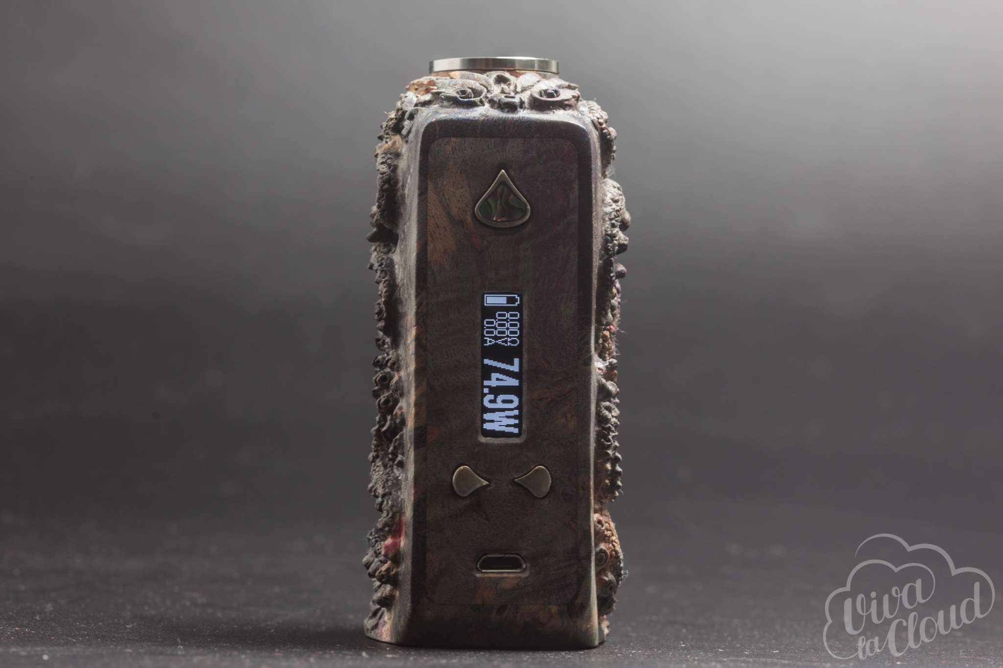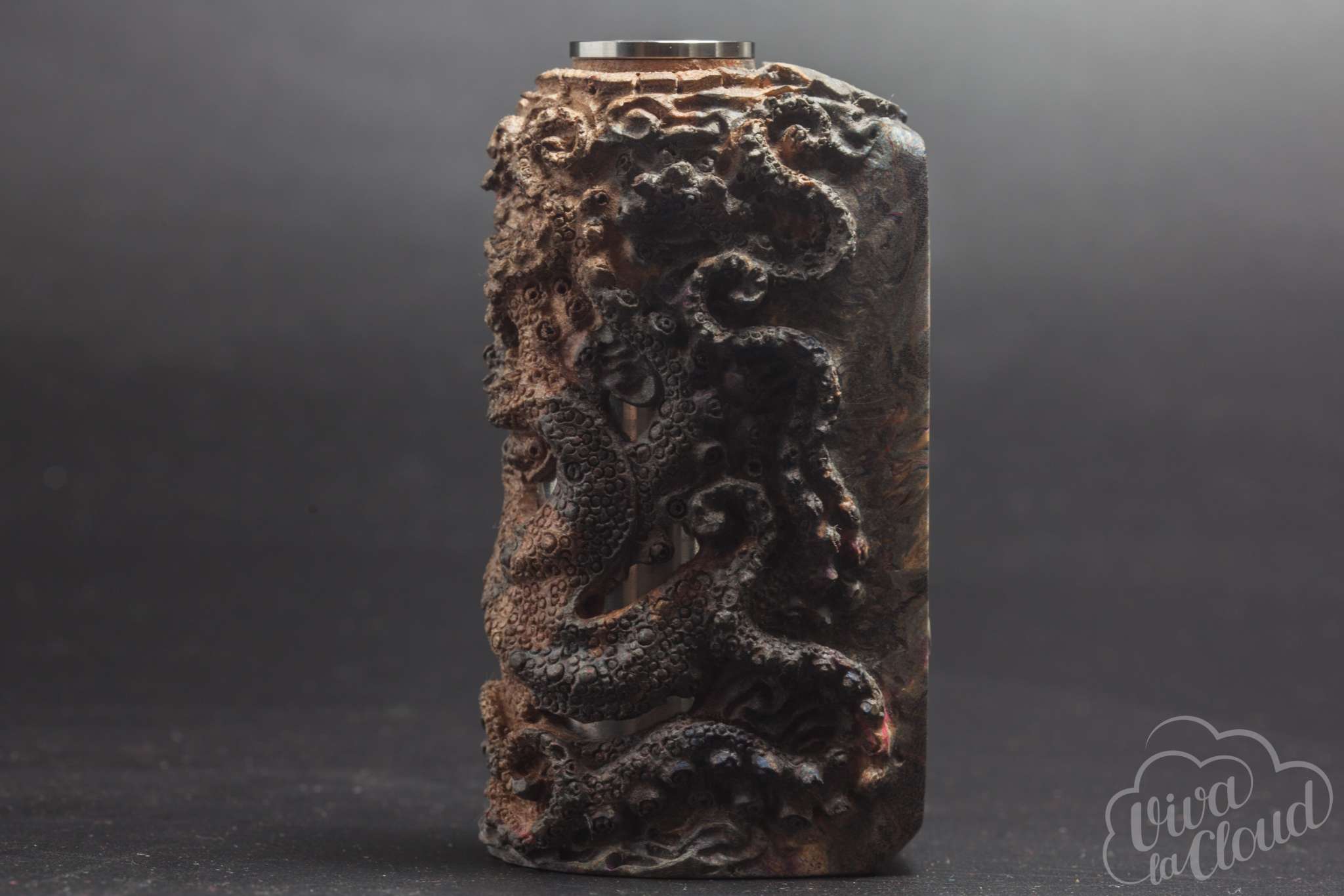 Этот бокс-мод стоит 900 долларов. Цена идет в уникальные внешний вид и материалы. Конечно, многие начнут говорить, что оно того не стоит. Для меня такая стоимость оправдана. Дело в тактильных ощущениях, в уникальности. Это «кастом», «божественный стабвуд». Последний, кстати, закупается у Gepetto mods, которые тоже собаку съели на красивых боксмодах. Однако у них «стаб» обыкновенный — а здесь ощущается настоящая ручная работа. Нет простых прямоугольных форм. Это не боксмод, а искусство и радость для глаз.