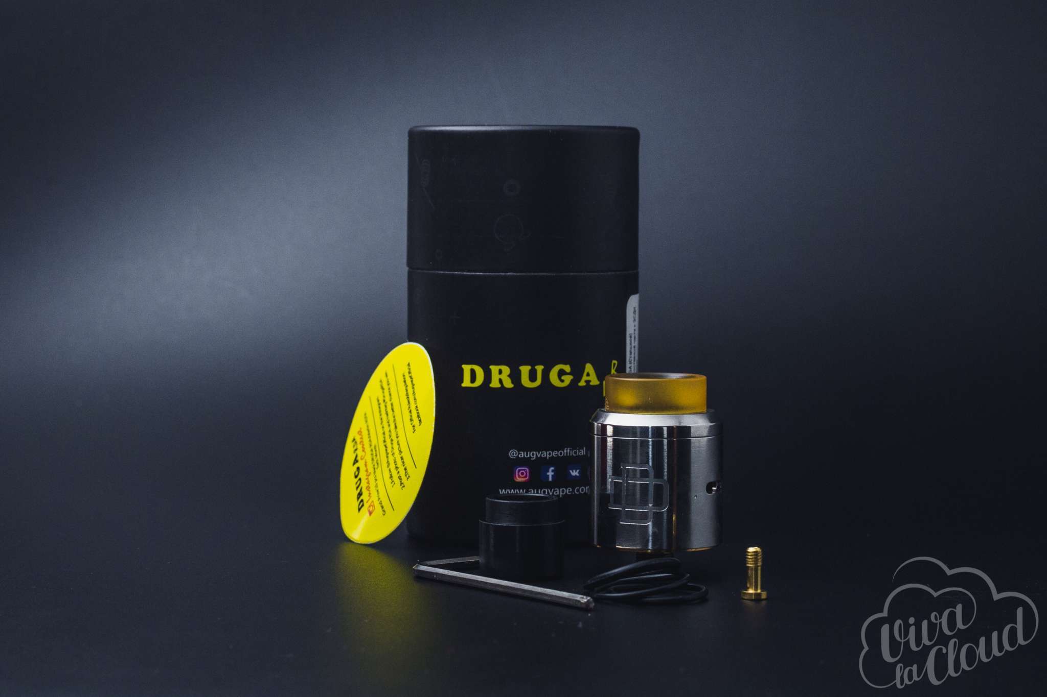 Приходит Druga в неприметной цилиндрической коробочке. На ней есть ссылки на социальные сети и наклейка со скретч-кодом для проверки оригинальности. Внутри, помимо очевидного, есть запасные оринги, два 810-х дриптипа и сквонк-пин. Есть и шестигранник, который нужен для смены пина. А вот отверточку не положили.