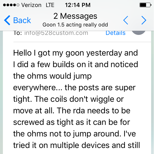 Покупатель Goon 1.5 рассказал о «скачущем» сопротивлении дрипки. Он предположил, что проблема кроется в стойках атомайзера и обратился в техподдержку. Там жена владельца компании-производителя Goon 1.5 посоветовала использовать проблемный девайс на мехмоде.