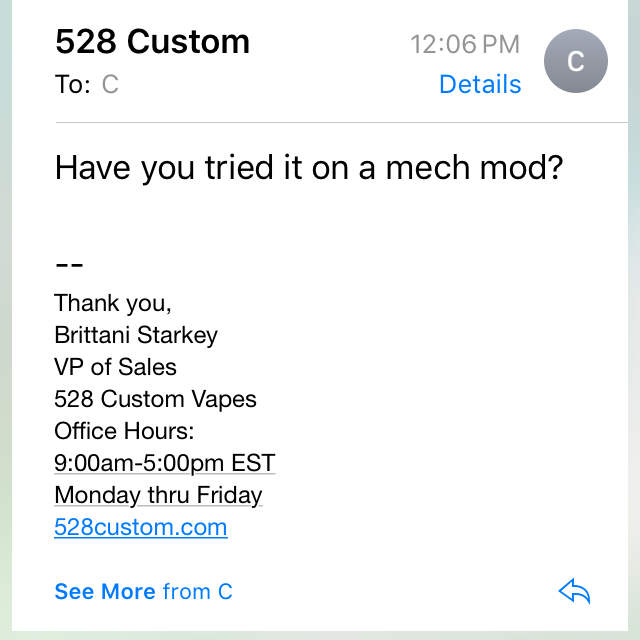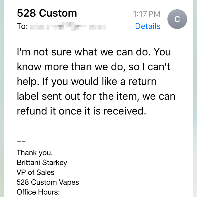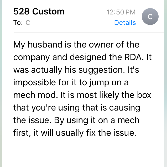 В итоге он обратился за помощью в техподдержку 528 Customs — компании-производителя дрипки. Представитель фирмы посоветовала ему накрутить дрипку на мехмод. Опешивший покупатель уточнил, не шутка ли это, на что получил внезапную тираду от сотрудника компании. «Мой муж — владелец 528 Customs. Он создал эту дрипку. — сообщили клиенту в техподдержке. — Сопротивление не может „скакать“ при использовании с мехмодом. Скорее всего, проблема в вашем боксмоде. Используйте устройство с мехмодом и проблема решится сама»,. На резонное замечание, что это может быть небезопасно, вейперу предложили вернуть устройство.