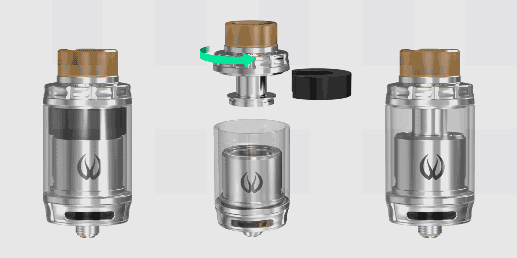На шахту можно установить специальную проставку. Таким образом объем с 4 миллилитров уменьшится до 2, что будет соответствовать требованиям TPD. Заправка происходит сверху, в топкэпе находится отверстие под 810-й дриптип. На нижней части располагаются два отверстия для забора воздуха, обдув регулируется. Позолоченный пин выкручивается плоской отверткой.