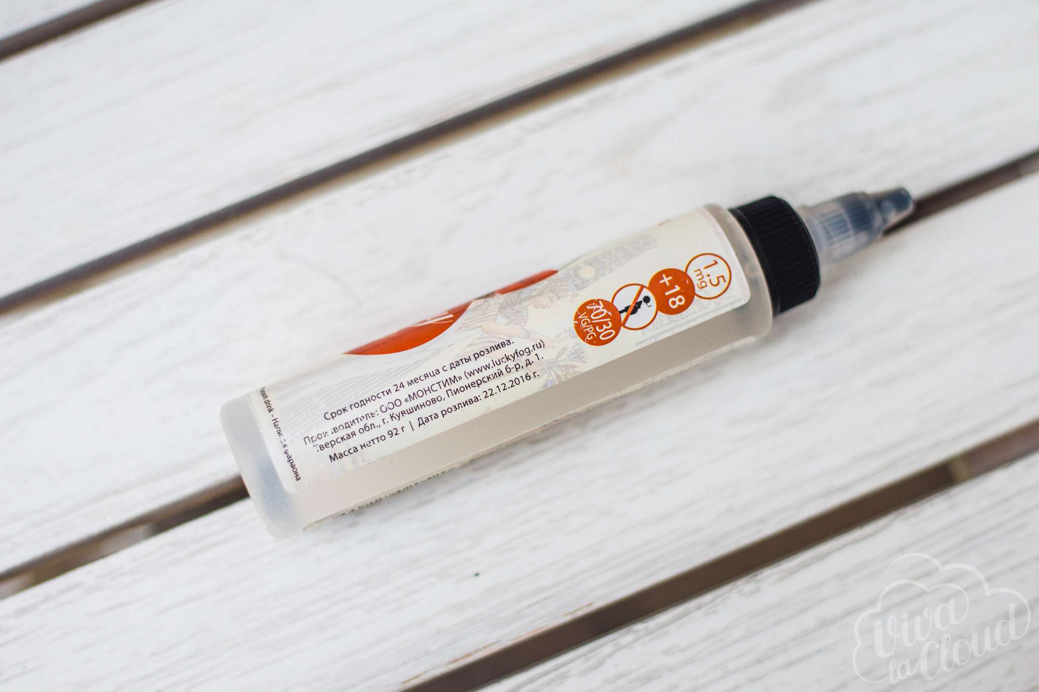 Жидкий туман заключён в полупрозрачный флакон с откручивающимся носиком. Контроль первого вскрытия отсутствует, ровно как и защита от детей. Передняя часть этикетки украшена названием и фотографией, отражающей вкус жидкости. Картинки взяты со стоков — иллюстрации как минимум двух вкусов запросто находятся в поисковике. По бокам расположены отметки о содержании никотина, возрастном цензе, соотношении VG/PG. Там же — запрет на использование беременными, юридическая информация, состав и срок годности. В нижнем правом углу притаился перевод названия жидкости с английского. Мелким шрифтом.