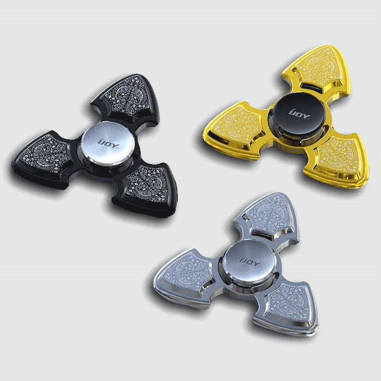 Компания iJoy также занялась игрушками. Их спиннер не имеет названия, по форме напоминает треугольник и имеет три лепестка. В инстаграме фирма показывала игрушки трех цветов: черного, стального и золотого. На них нанесена белая гравировка. В центре находится втулка под пальцы, на которую нанесен логотип компании.