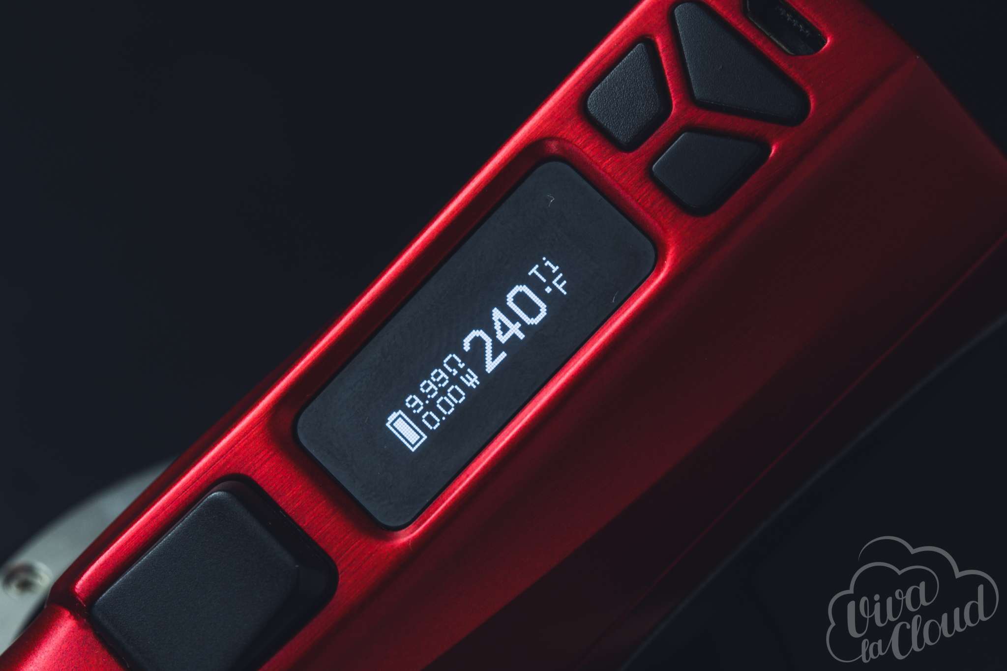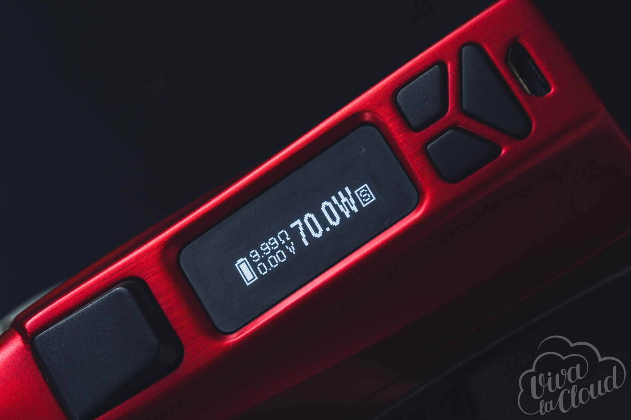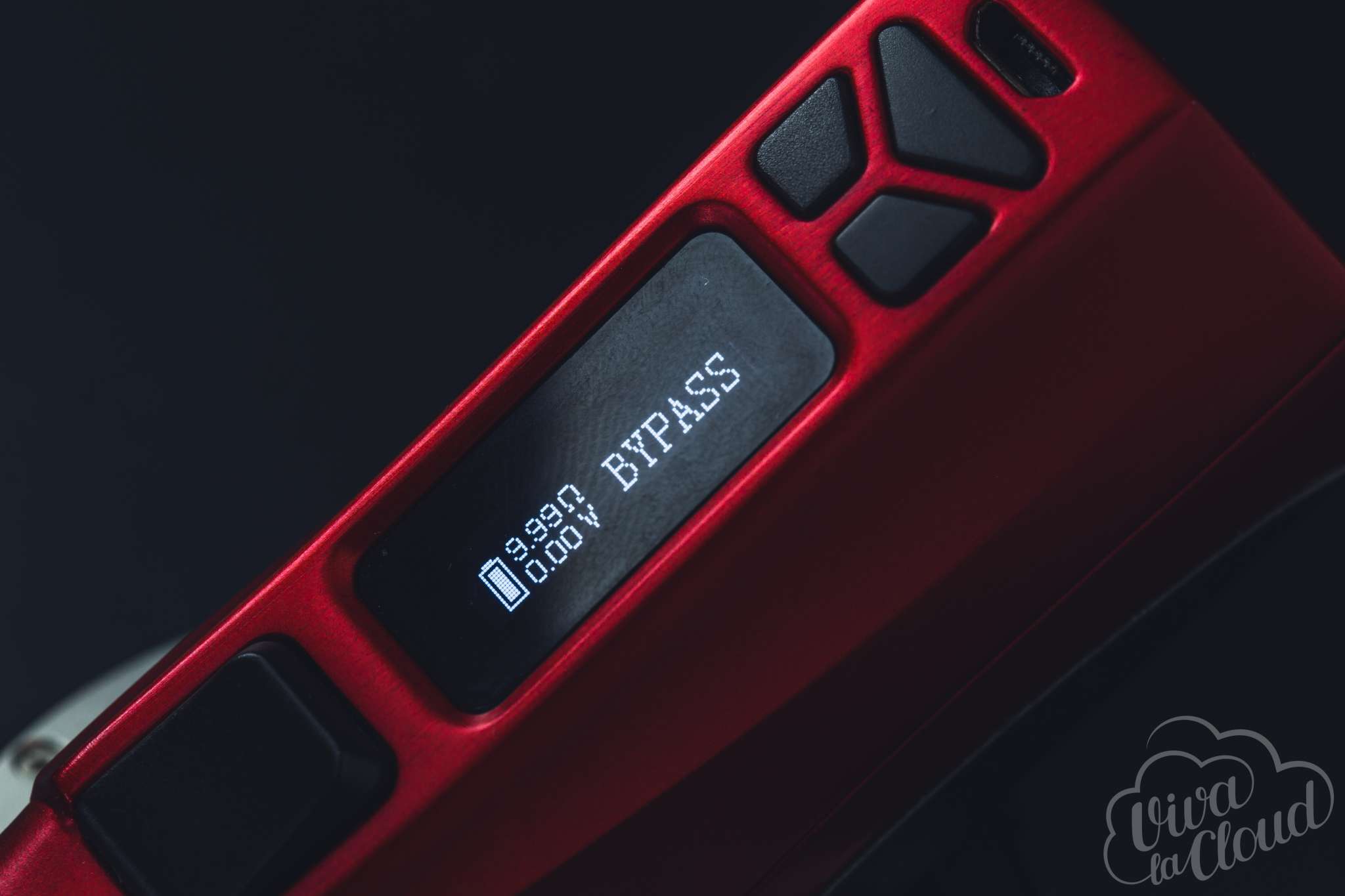 Плата способна удовлетворить стандартного вейпера. Здесь есть всё: байпасс, вариватт, термоконтроль на никеле, титане и стали. Яркость дисплея умеренная: при попадании прямых лучей элементы размываются, но в темноте глаза экран не режет. Числами отображаются заряд аккумулятора, сопротивление атомайзера, подаваемое напряжение и другая информация, зависящая от режима работы.