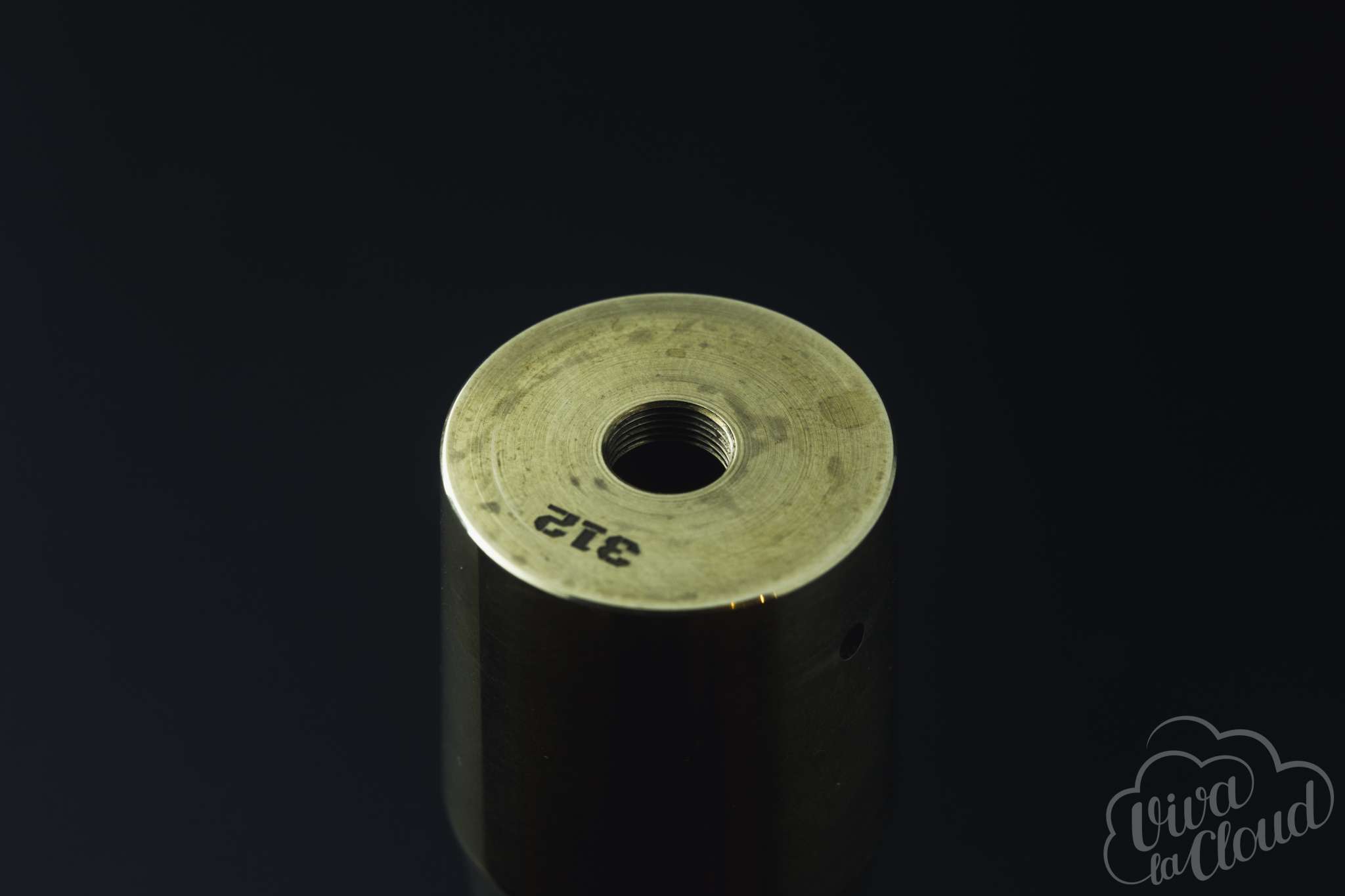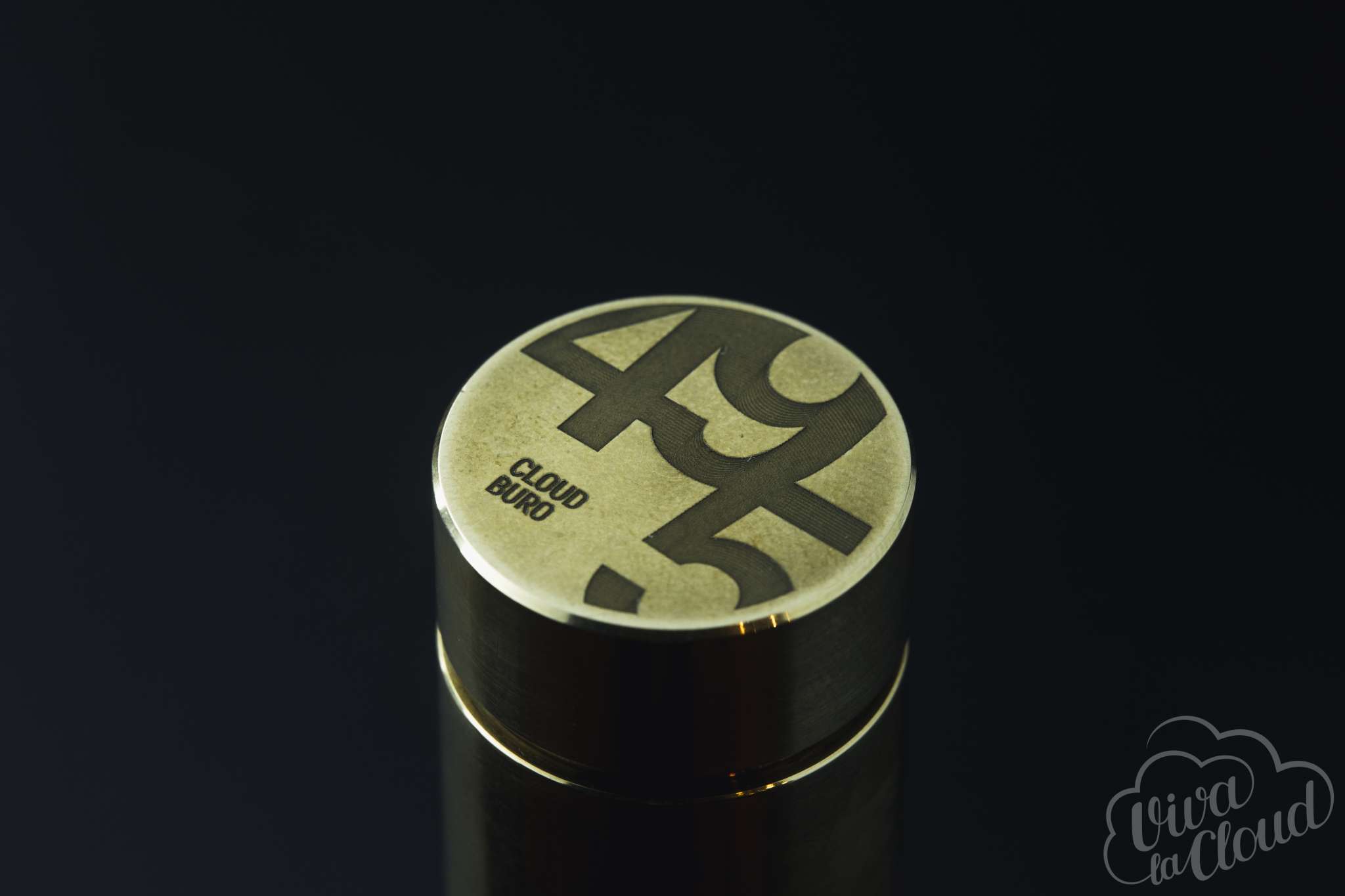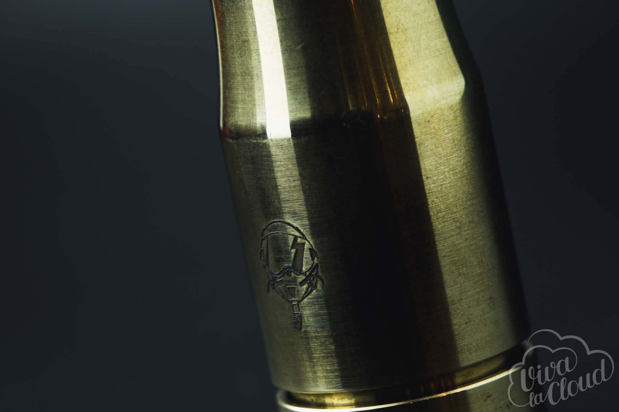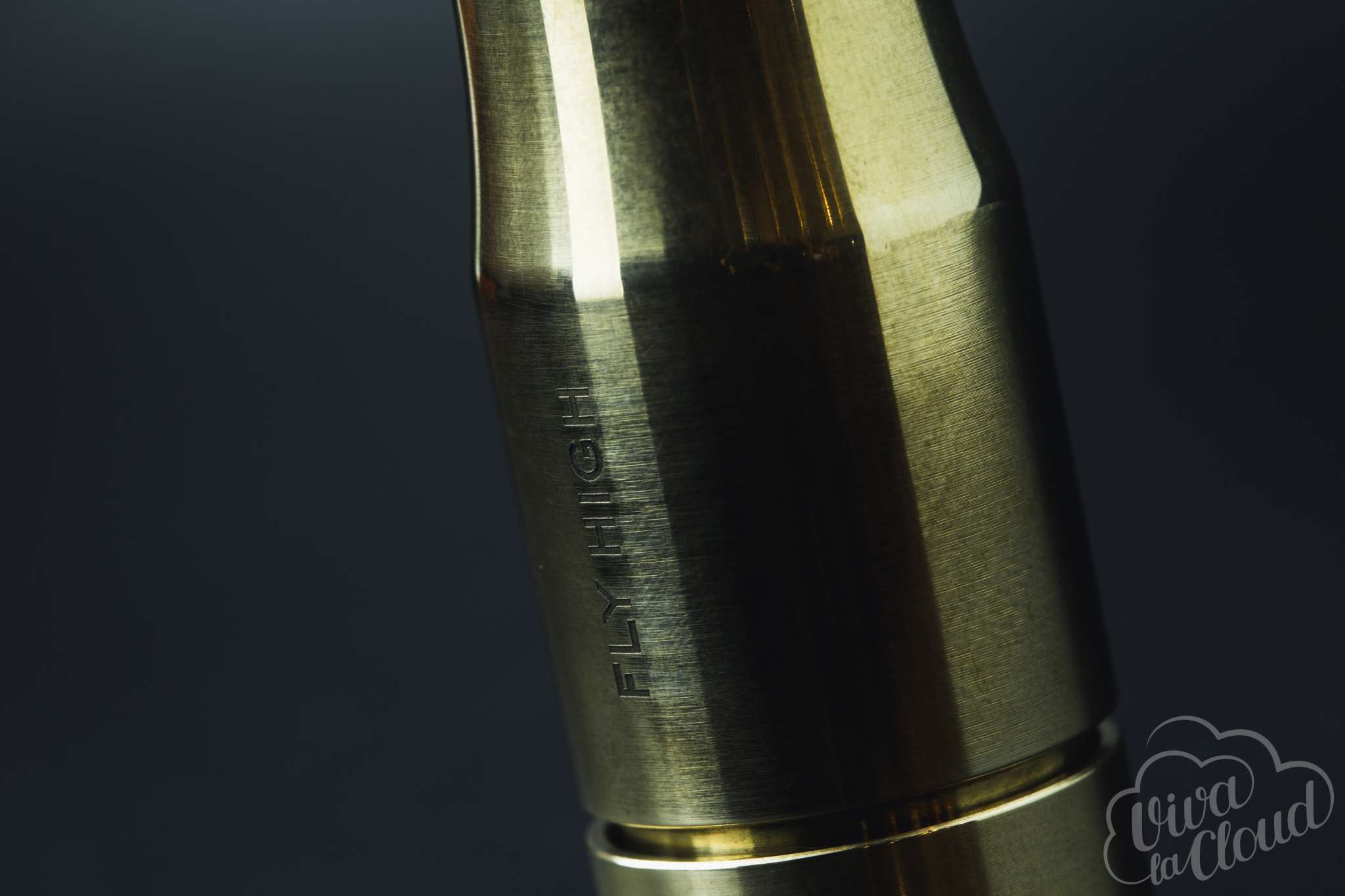 Внешний вид устройства оставляет самые положительные впечатления. На обзор к нам попала латунная версия мода. Здесь имеется плавное сужение на середине для удобного хвата, а также сужение к посадочной площадке под атомайзер. За счет таких перепадов в диаметре, мех выглядит изящнее. Эстетики прибавляют и гравировки: шлем, надпись «Fly High», цифры «495» на кнопке и серийный номер на посадочной площадке. Несмотря на количество, смотрятся они аккуратно и не перегружают мод.