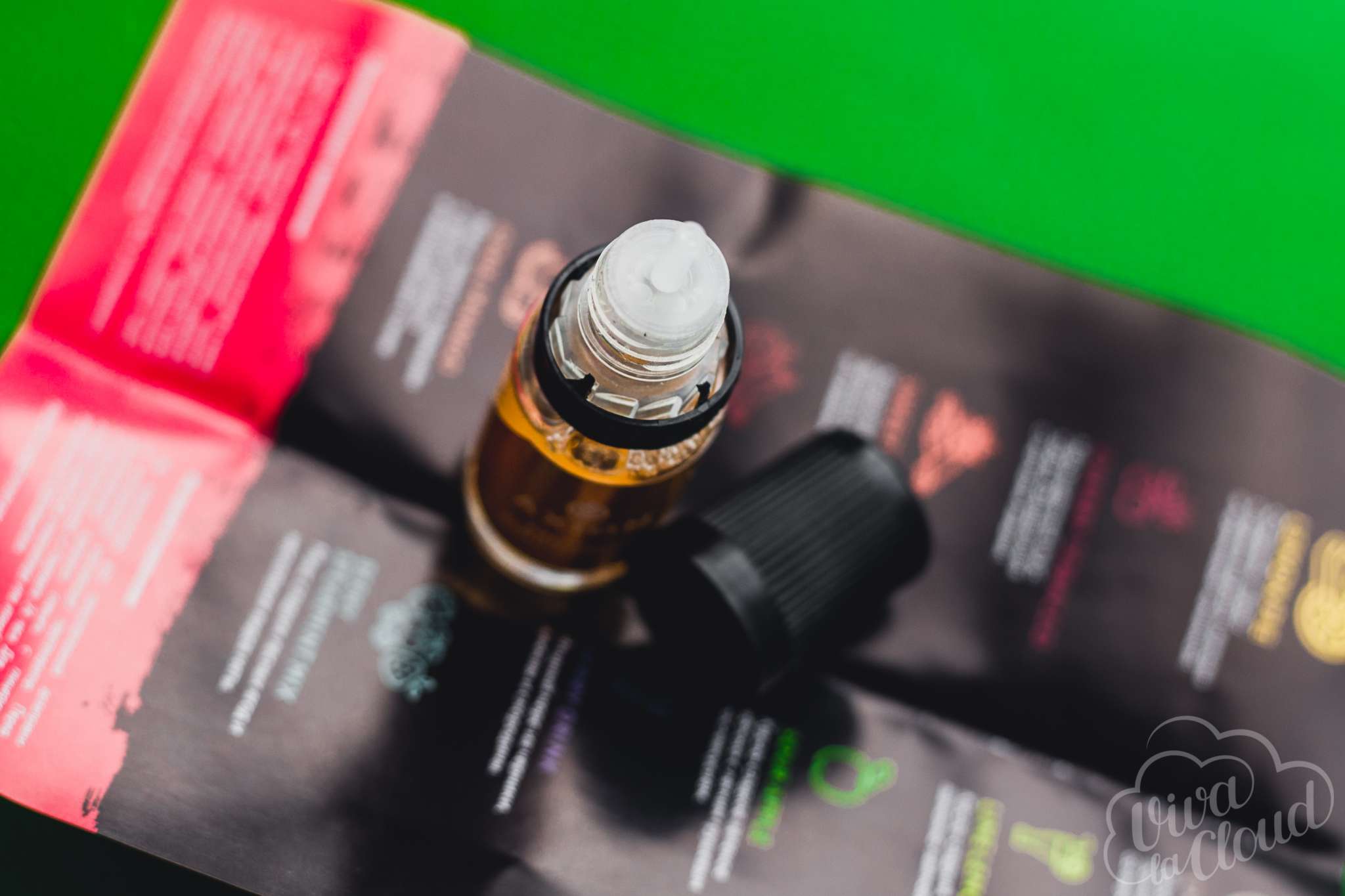 Внутри находятся флаер и флакон объемом 10 миллилитров. Его крышка имеет защиту от детей и контроль первого вскрытия. На глянцевой этикетке находятся только названия линейки и вкуса.