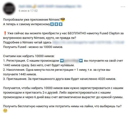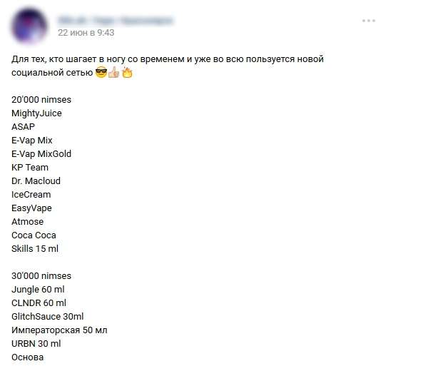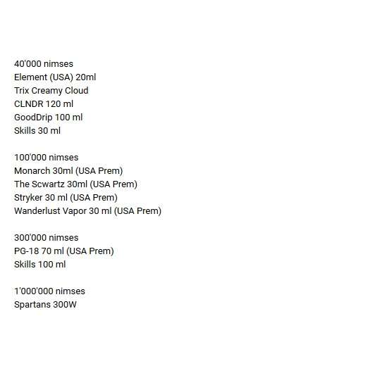 Красноярский вейпшоп предлагает покупателям жидкости: за 20 000 нимов (14 суток в соцсети) можно приобрести «Атмос», за 30 000 (21 день) — основу, 30 миллилитров URBN или Glitch Sauce. Нимовым миллионерам (почти два года) предлагается боксмод Spartans 300W. Новосибирские коллеги что предпочли остановиться на намотках: те просты в изготовлении и дешевы в производстве. «Одно знакомое мне заведение принимало нимы за услуги. Акцию скоро прикрыли: совсем невыгодно оказалось», — объяснил ViVA la Cloud решение соучредитель принимающего нимы вейпшопа Виталий Инжелевский.
