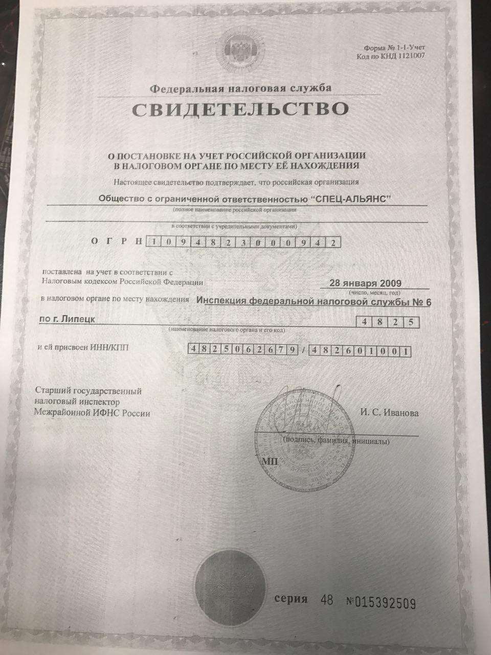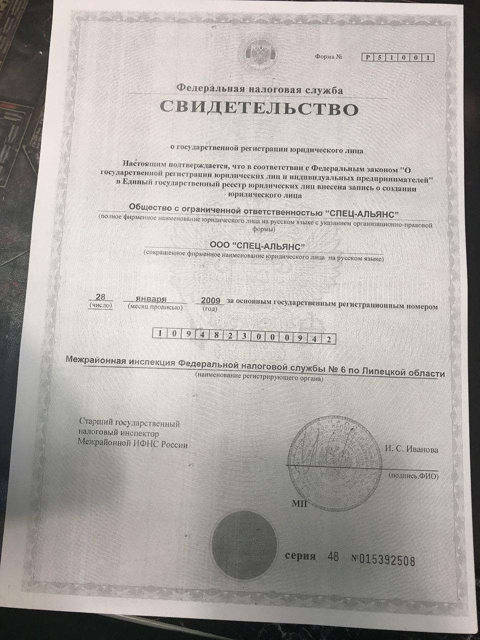 - Переданное свидетельство о регистрации юридического лица
