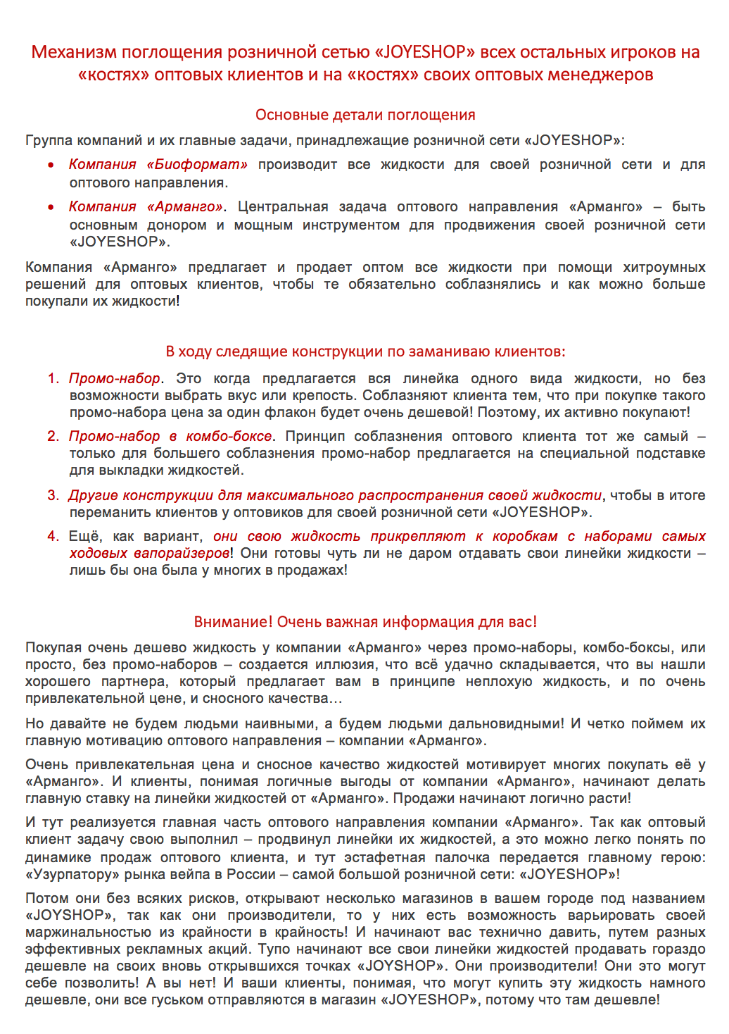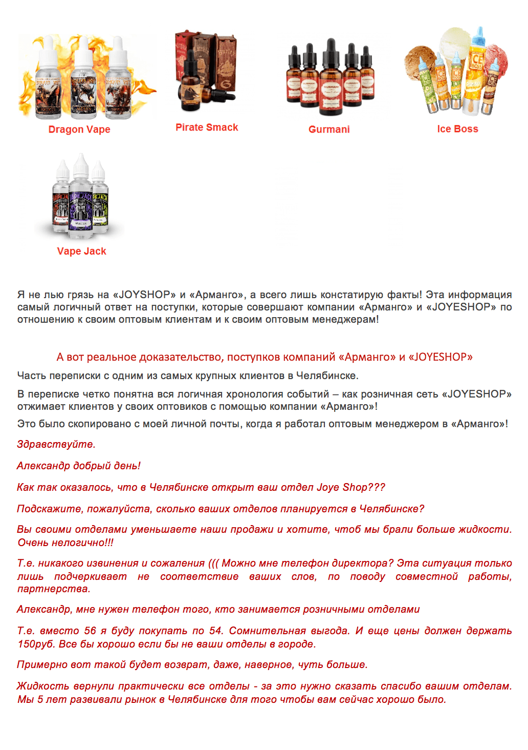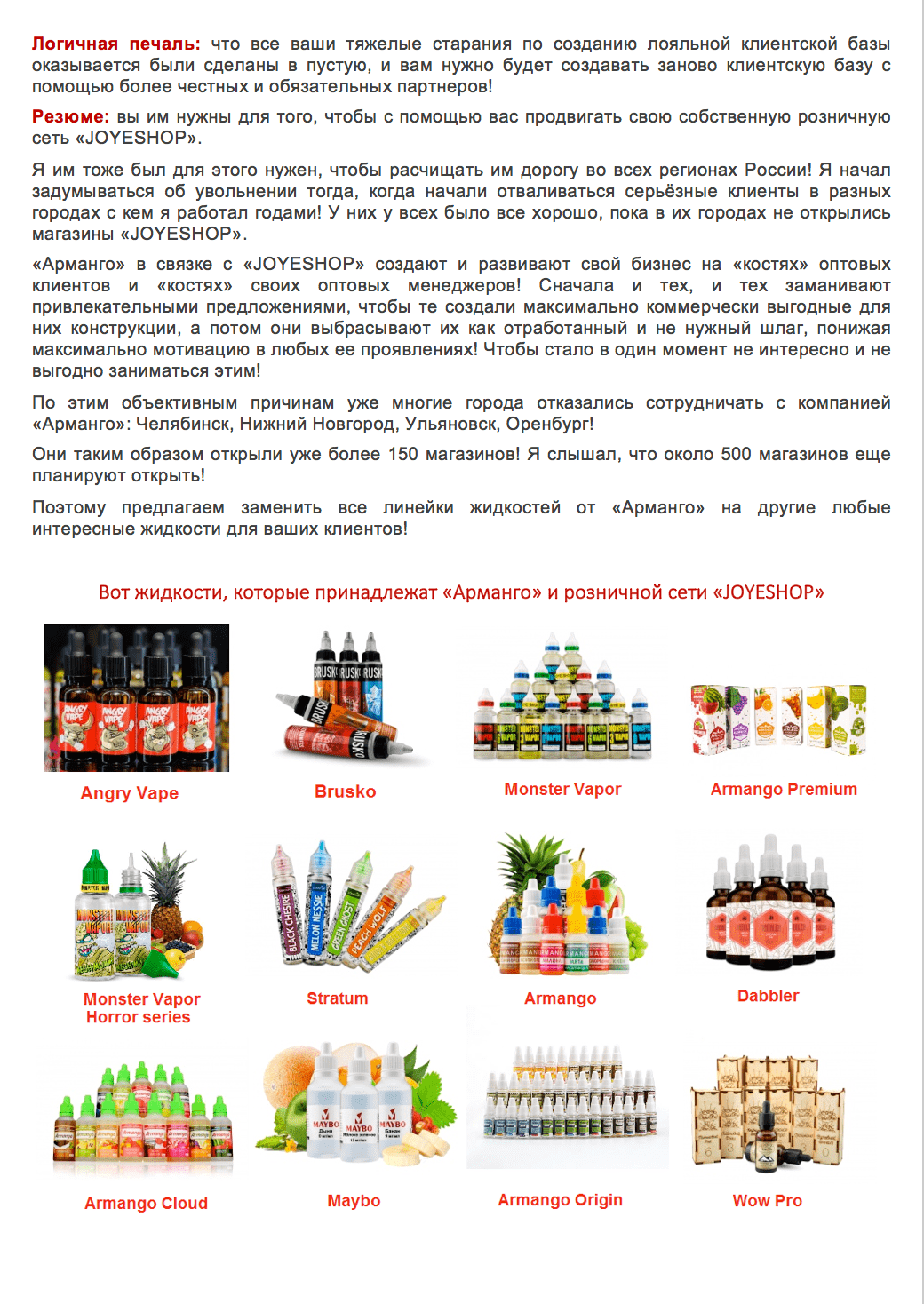 В январе 2017-го Поздышев ушел из «Арманго». Он набрал заказов, а деньги перевел на личный счет, рассказал Денис (фамилию раскрывать не стал), член совета директоров «Арманго». Кроме этого, в распоряжении Поздышева была клиентская база «Арманго» — её, по словам Никитина, тот продавал за 30000 рублей. По той же базе Поздышев разослал письмо, в котором обвинил «Арманго» в «демпинге» — понижении рыночной цены на жидкости. Схожие документы были направлены в прокуратуру, полицию и налоговую — с добавлением, что Арманго «не платит налоги и занимается нелегальной торговлей». Правовых санкций в отношении «Арманго», впрочем, не последовало — по словам Дениса, «из налоговой пришли, посмотрели на рабочие места и заключили, что письмо не соответствует действительности». «Мы могли бы начать разбирательство [с Поздышевым], но предпочли не ввязываться в историю», — добавляет Денис. В результате, в «Арманго» о Поздышеве «забыли».