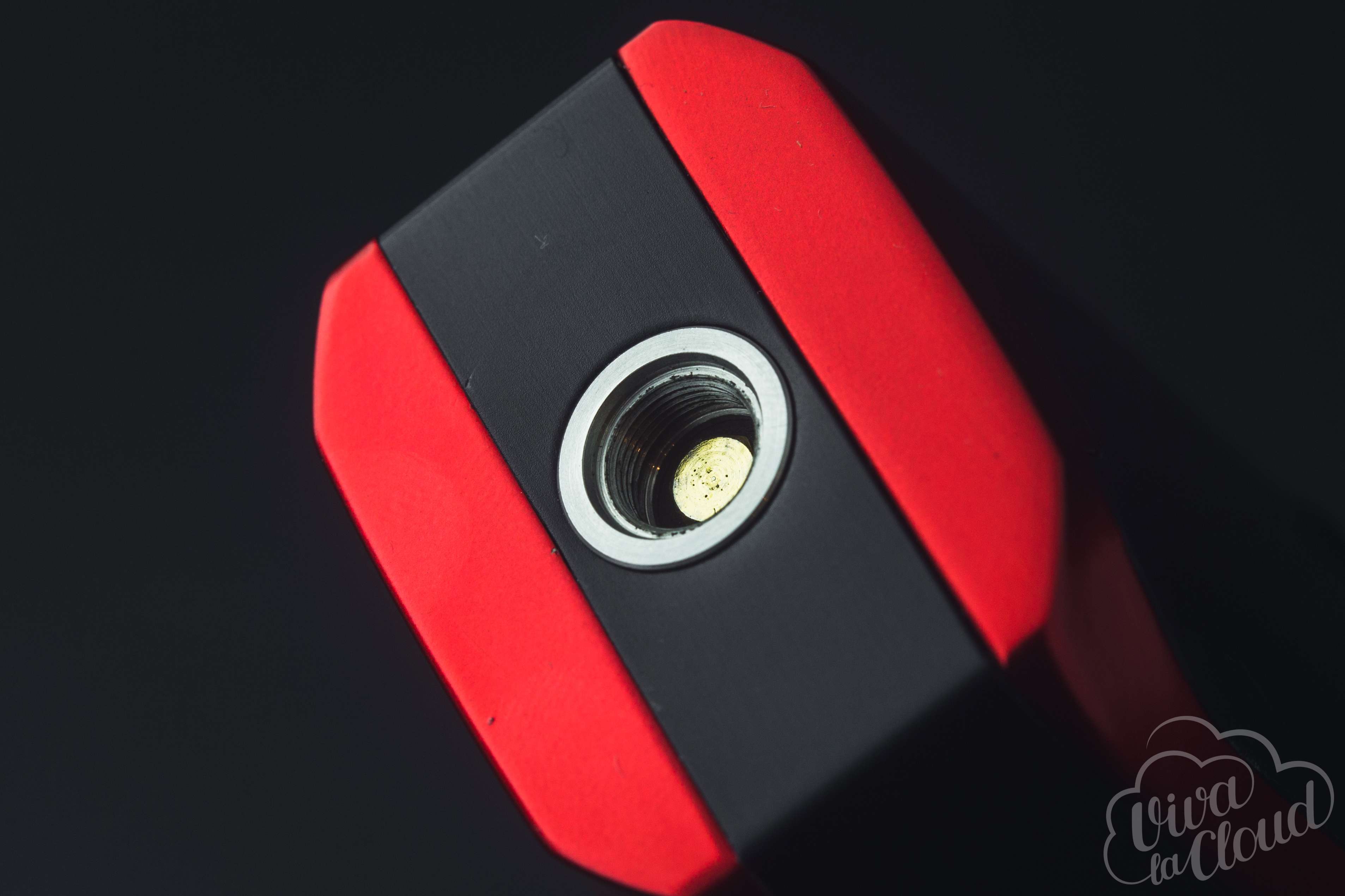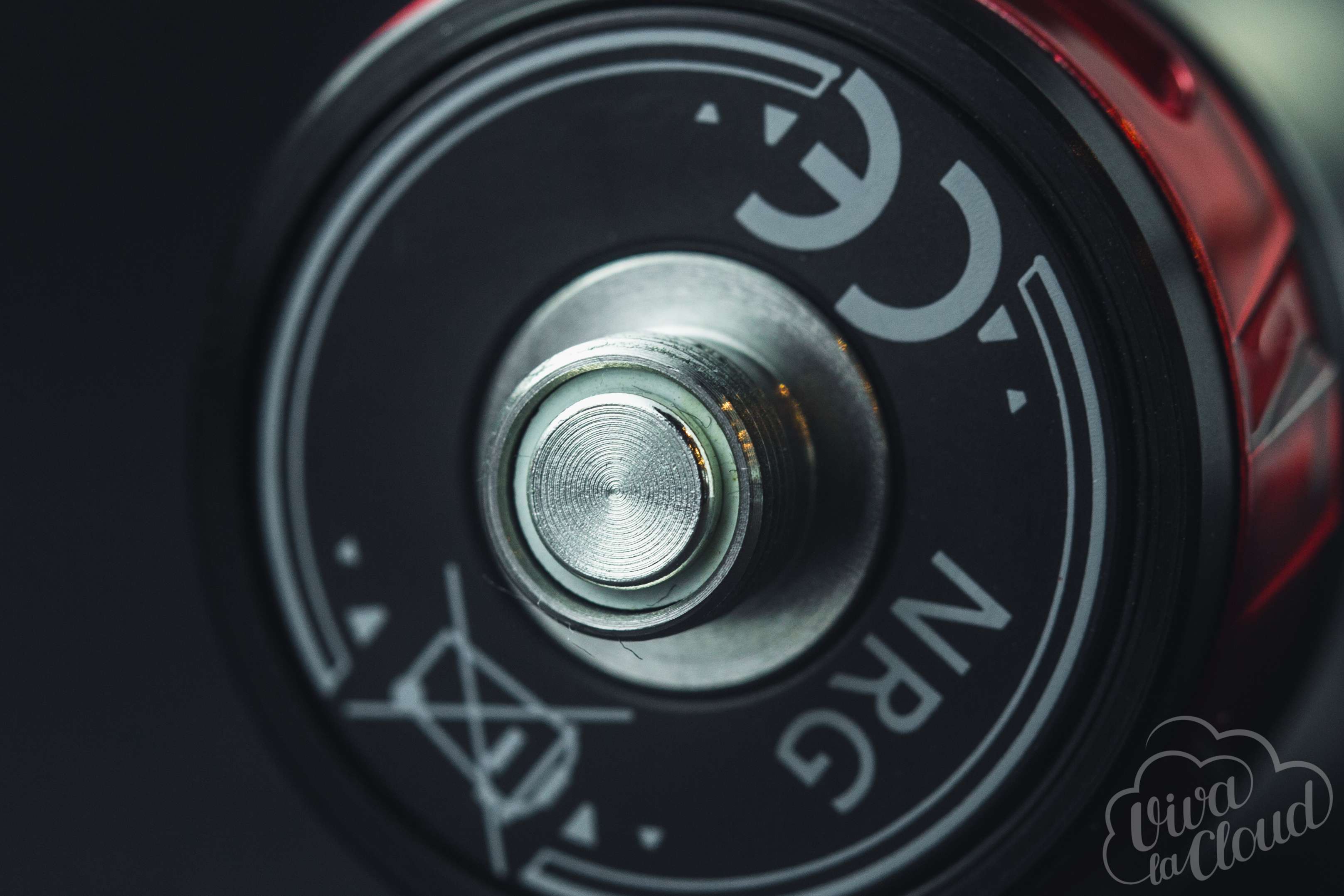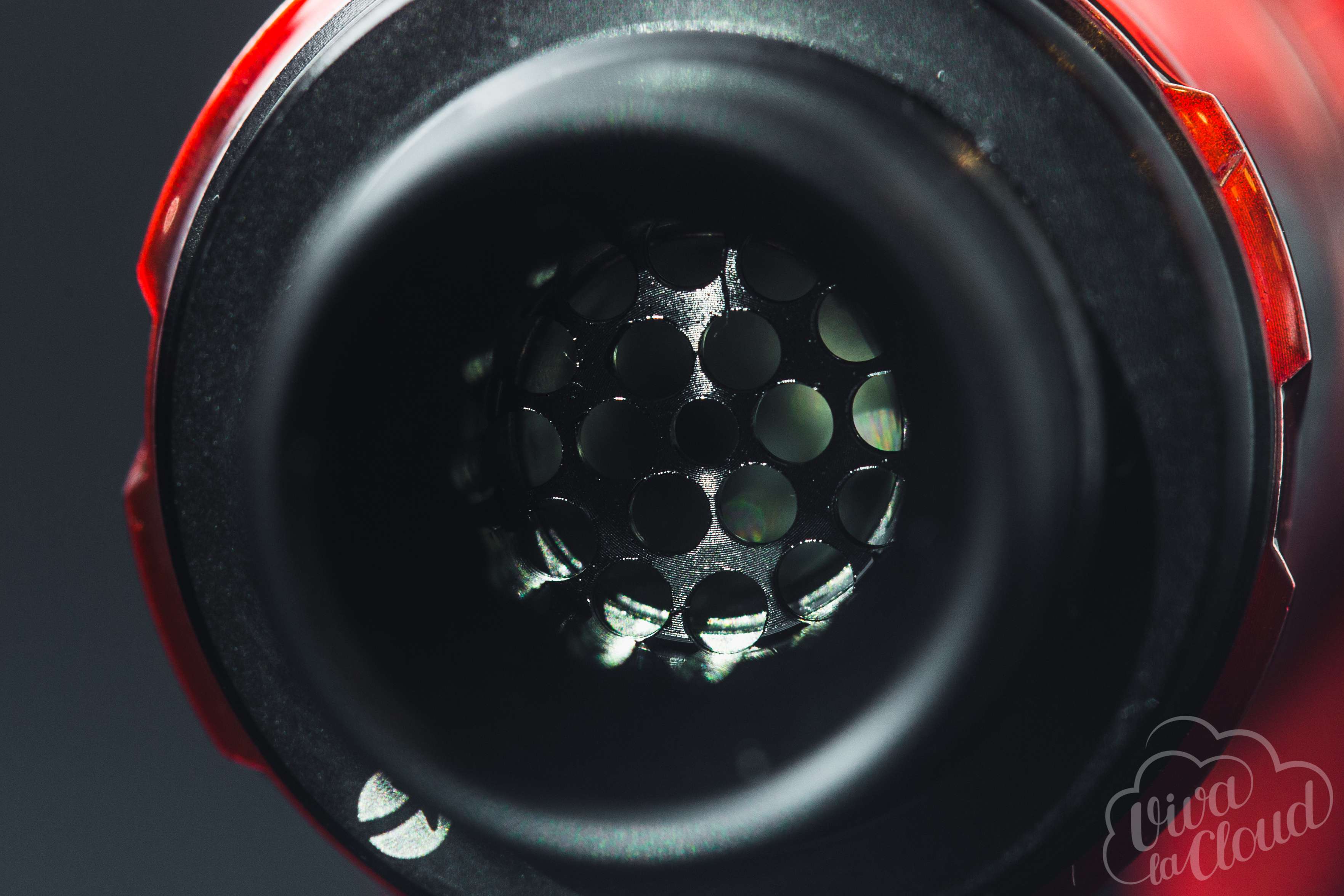 Комплектный NRG Tank, к сожалению, не раскрывает всех возможностей боксмода. Как и батарейный блок, он окрашен в черно-красные цвета. Заправка удобна — достаточно подвинуть верхнюю площадку под дриптип и освободить специальное отверстие. С другой стороны осуществляется замена испарителей. Сливать жидкость не нужно — достаточно перевернуть бак и поставить его дриптипом на стол.