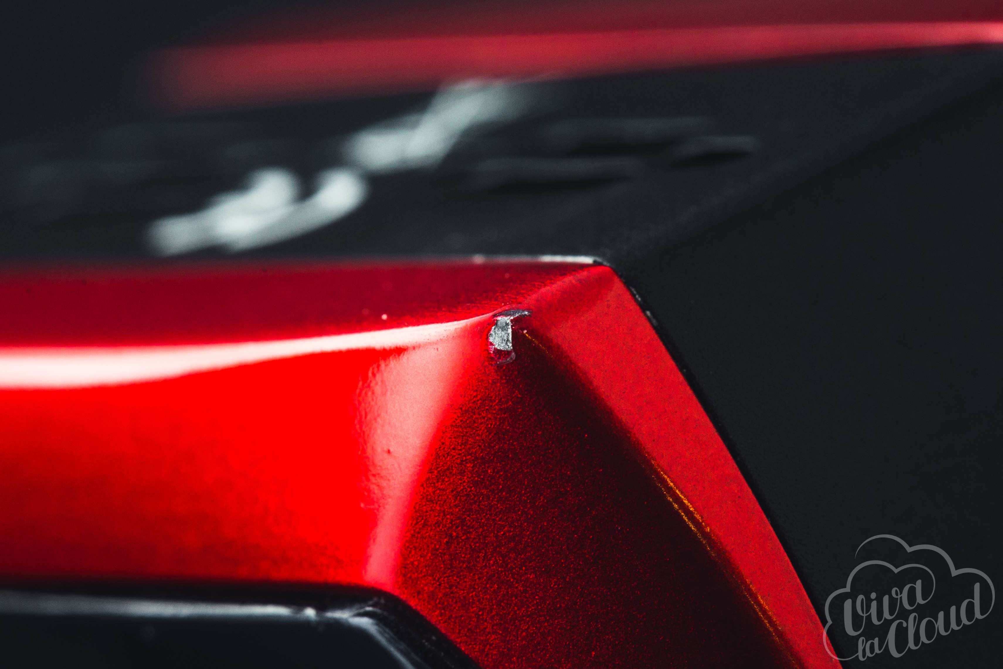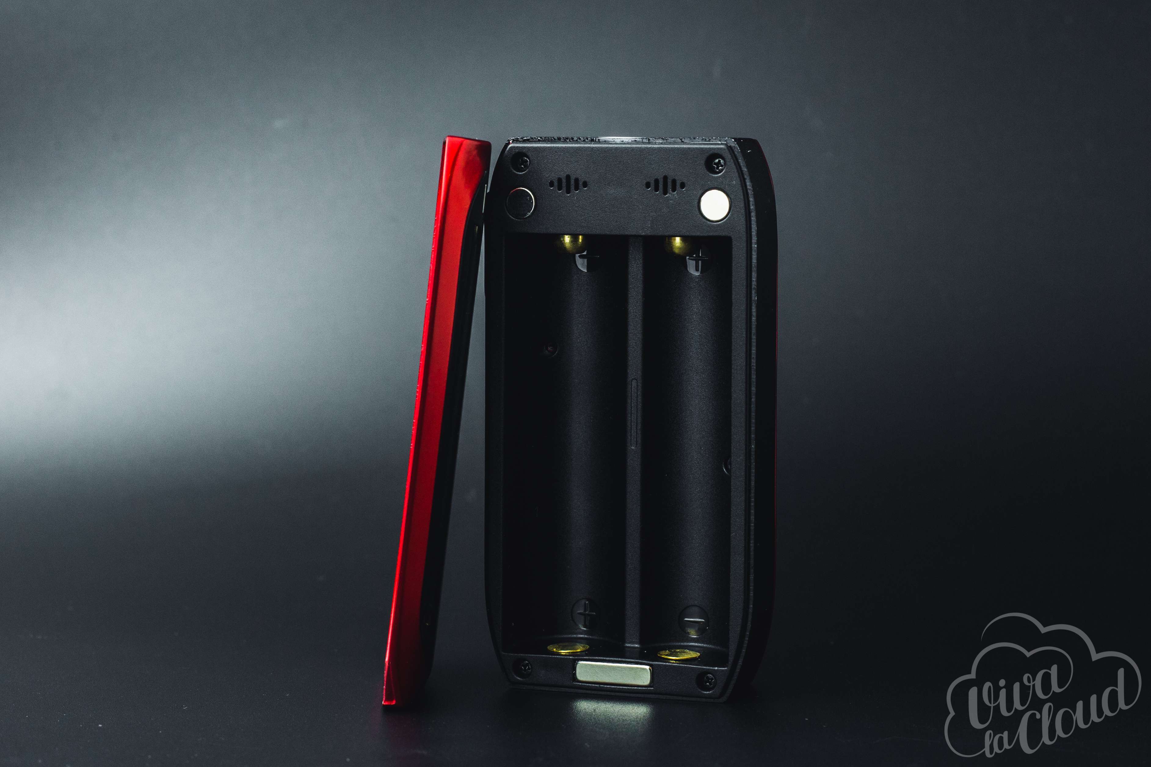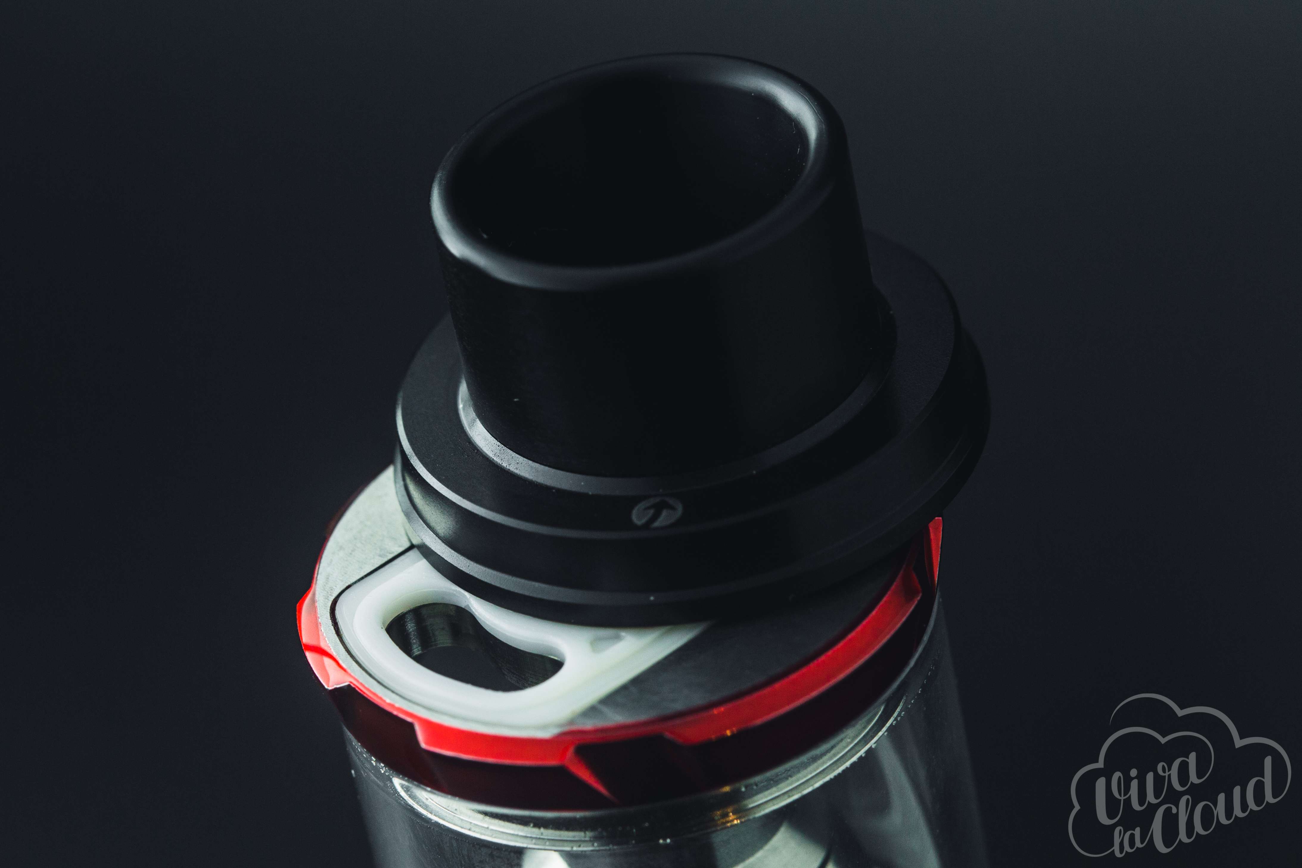 Комплектный NRG Tank, к сожалению, не раскрывает всех возможностей боксмода. Как и батарейный блок, он окрашен в черно-красные цвета. Заправка удобна — достаточно подвинуть верхнюю площадку под дриптип и освободить специальное отверстие. С другой стороны осуществляется замена испарителей. Сливать жидкость не нужно — достаточно перевернуть бак и поставить его дриптипом на стол.