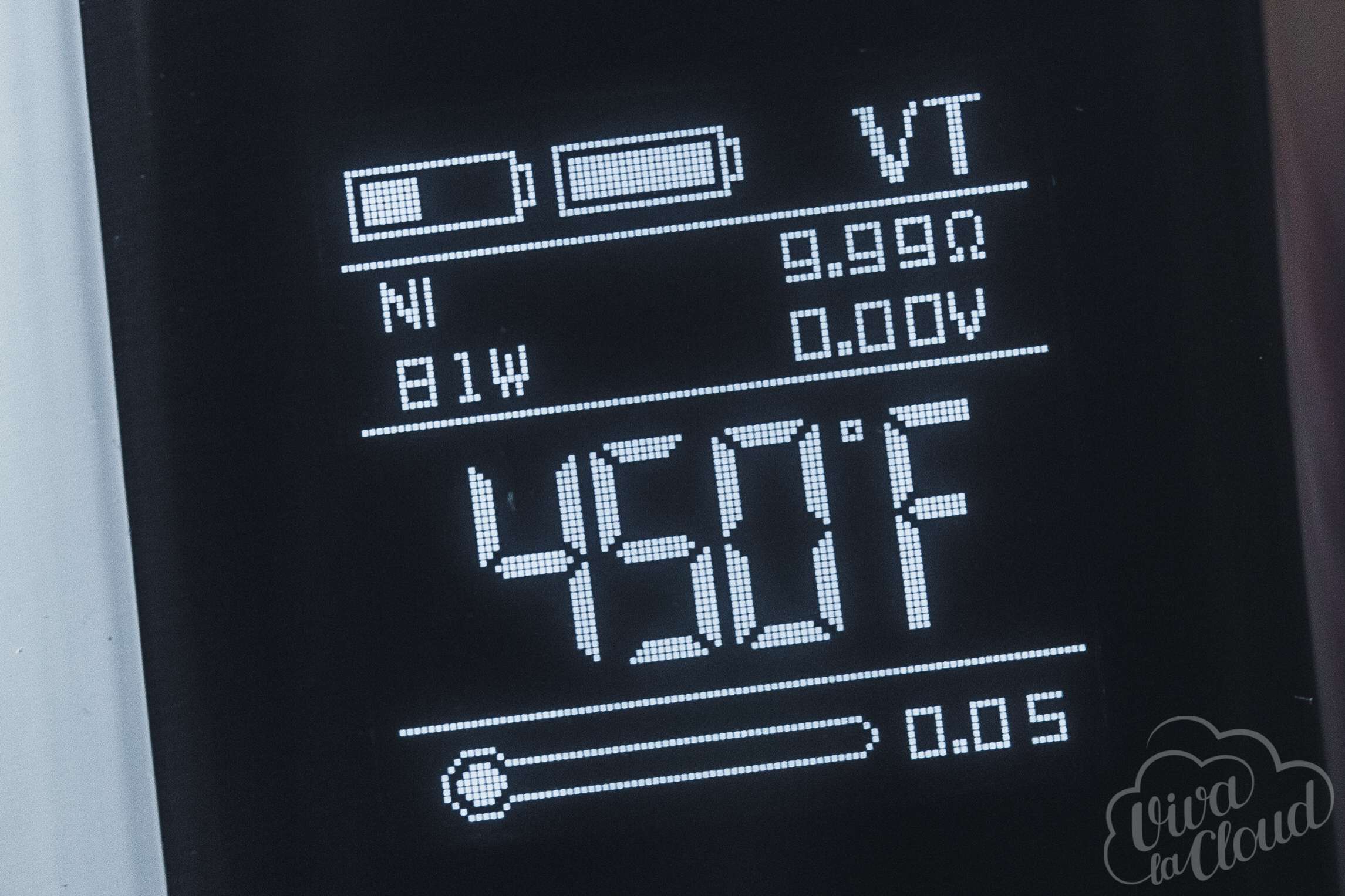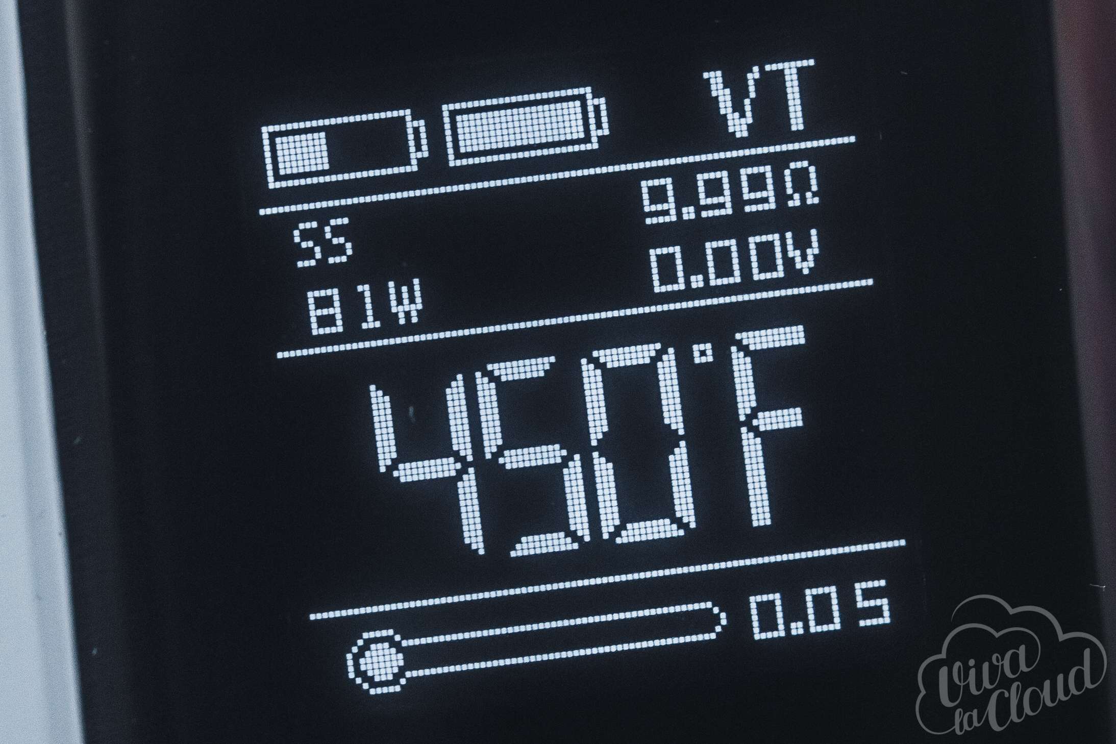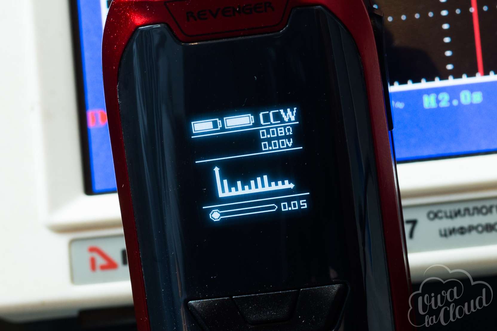 У Revenger, в отличие от других боксмодов, не две, а три кнопки управления. Для переключения режимов нужно удерживать центральную клавишу, а регулировать значения — боковыми. Выбрать есть из чего: настроек настолько много, что их количество может даже отпугнуть новичка. Особенно неудобно, что для настройки нужно пройти всё меню. К примеру, чтобы 10 ватт поднять мощность в режиме термоконтроля на стали, нужно потратить полминуты на путешествие через меню.
