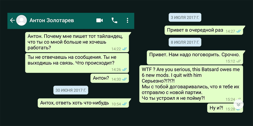 «Последний каплей», уточнил Золотарев, стал механический мод «Красус» — продолжение модельной линейки «Сварога». В апреле 2017-го предприниматель срочно заказал эти моды для вейп-выставки. Когда сроки начали поджимать, Максим сказал, что растратил деньги, предложив доплатить еще 12 тысяч рублей за экстренную доставку. «В итоге „Красусы“ обошлись мне в 11 тысяч рублей за штуку. — добавил Золотарев. — Еще и трех модов не было в посылке».