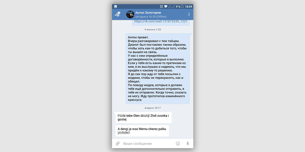 Максим, в свою очередь, заверил ViVA la Cloud, что «готов решать проблему». Он пояснил, что предупреждал Золотарева о проблемах с покраской «срочной партии». Но предприниматель, по словам Максима, сославшись на срочность заказа, согласился на такой товар. Кроме того, добавил Максим, Золотареву предлагалось бесплатно перекрасить дефектные моды, а сверху доложить еще девайсов, «чтобы отбить стоимость доставки». Но Золотарев не согласен. «Я не хочу модов, — подчеркнул собеседник. — Пусть возвращает деньги». Максим, впрочем, заявил, что Золотарев перестал выходить на связь, а в июле начал угрожать и рекомендовал «ждать гостей».