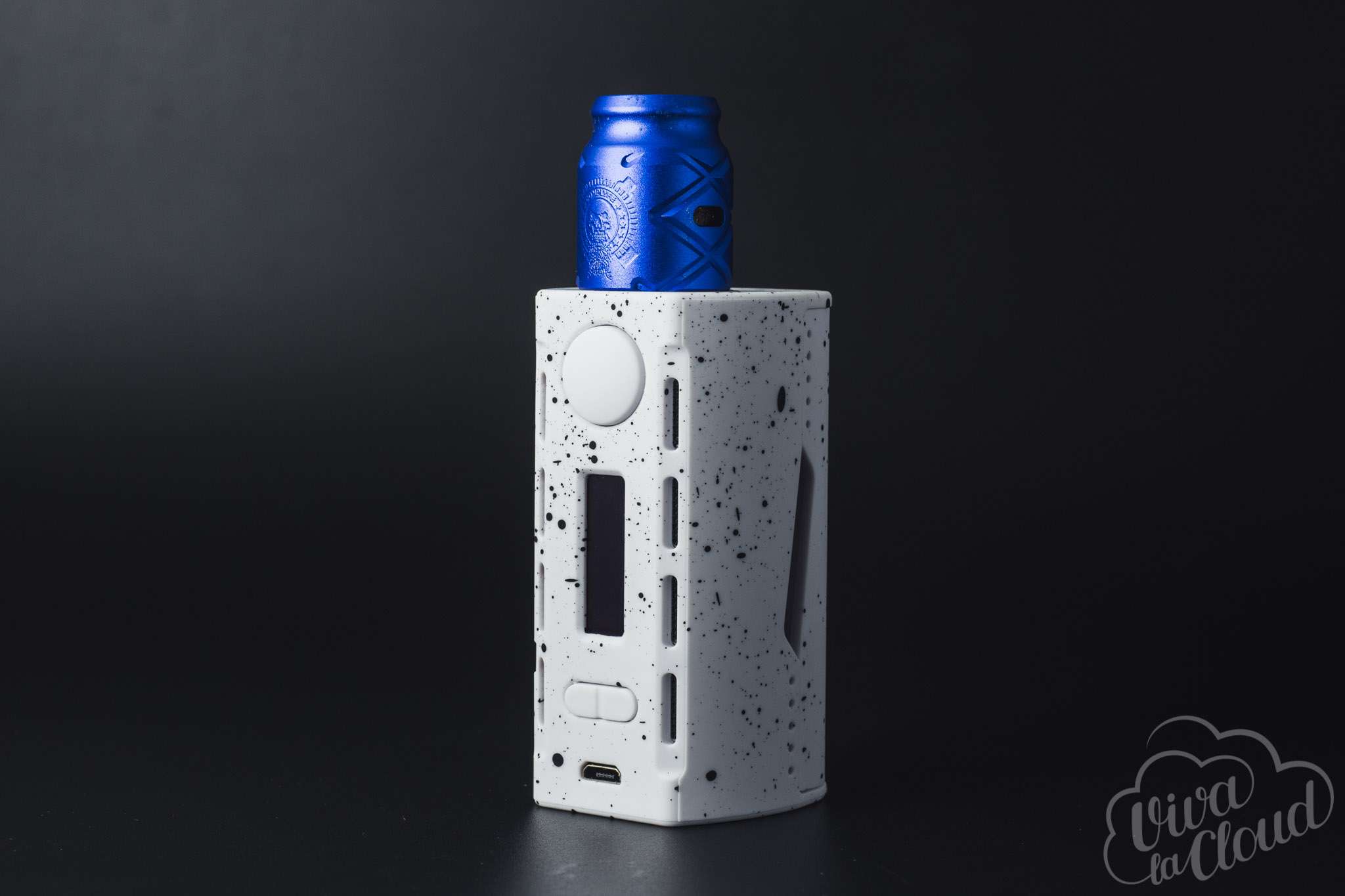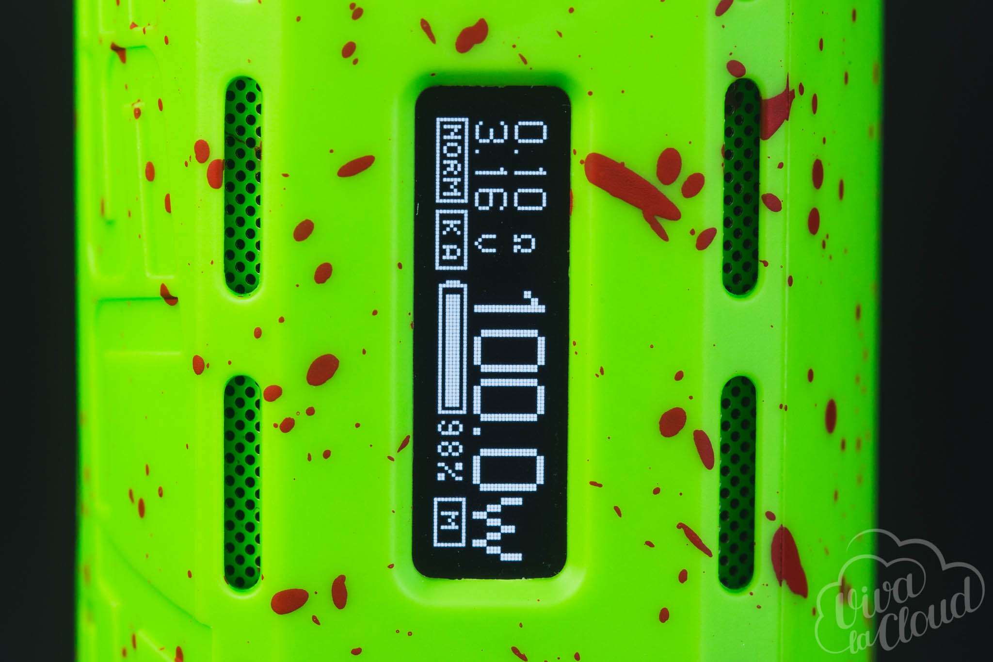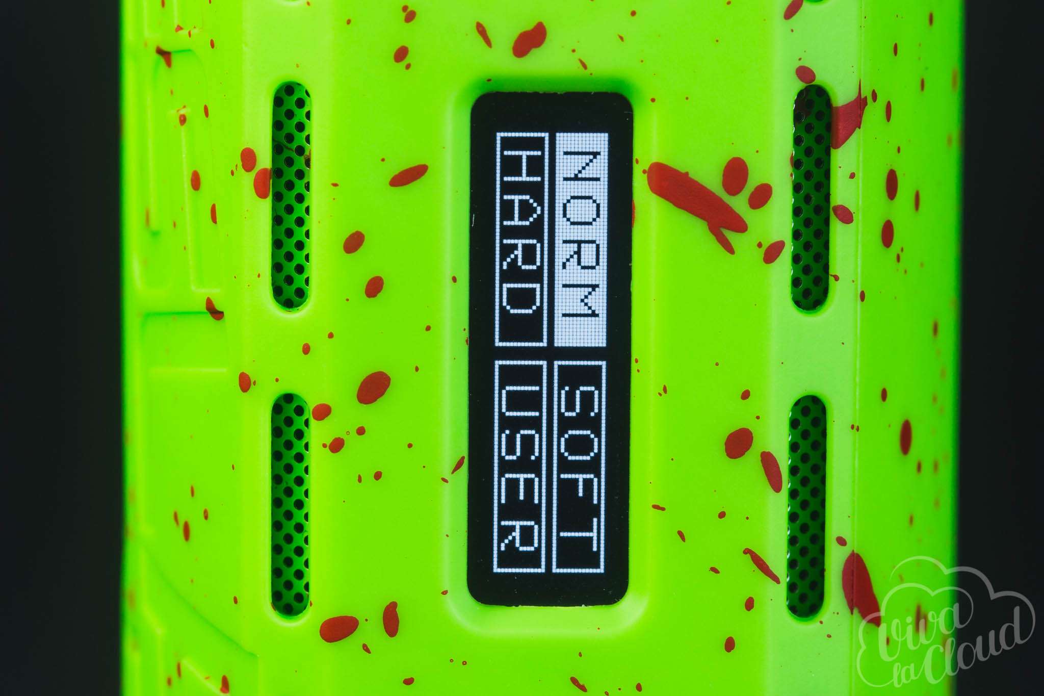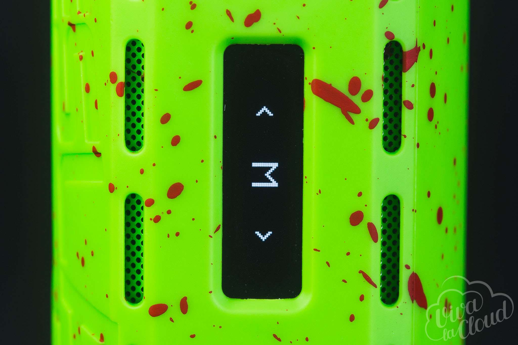 Все это, несомненно, портит первое впечатление об устройстве. Которое, впрочем, мгновенно исправляется, стоит взять девайс в руки: боксмод сделан из очень приятного на ощупь пластика. Спереди находятся дисплей, клавиши регулировки с кнопкой fire и USB-порт, по бокам — вентиляционные прорези, а сзади — крышка аккумуляторного отсека на магнитах. Окрашен девайс как бы в два слоя: сначала основной цвет, а сверху — дополнительный, сделанный в виде капель краски.