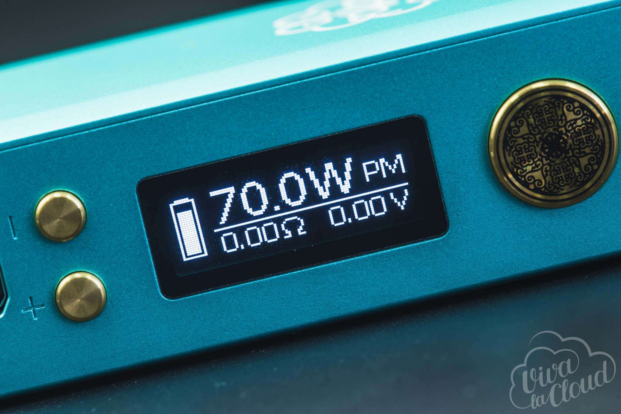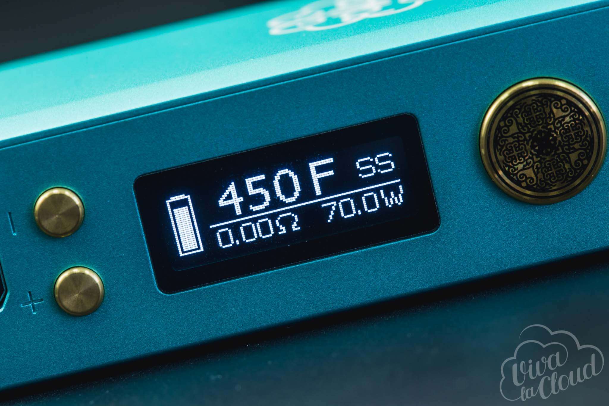 В плане функционала Dotbox 75 весьма консервативен. Плата выдаёт 75 ватт. Есть режимы температурного контроля, байпасса и вариватта. Никаких настроек кривых и прочих извращений нет — только классика. Девайс, согласно характеристикам, поддерживает сопротивление от 0,08 Ом и выдаёт максимум мощности от 0,1. Но само устройство об этом не в курсе — и упорно жарит даже на 0,09 Ом.